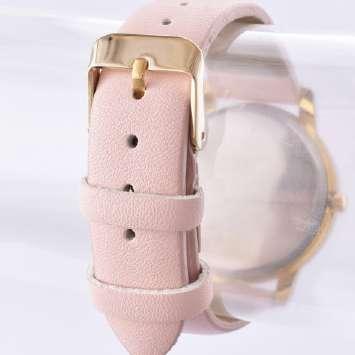Watch with pink case, decorative crystals, synthetic ivory strap and ivory with pink dial, embossed hour markers.