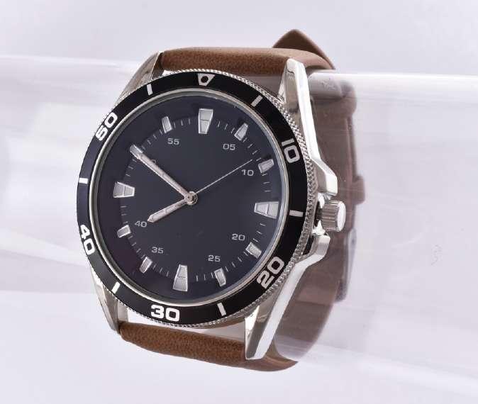 Watch with black metal case, brown leather strap and black dial, with embossed hour markers.