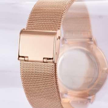 Watch with rose gold metal case and strap, gray platinum dial with embossed star markers and hour circles.