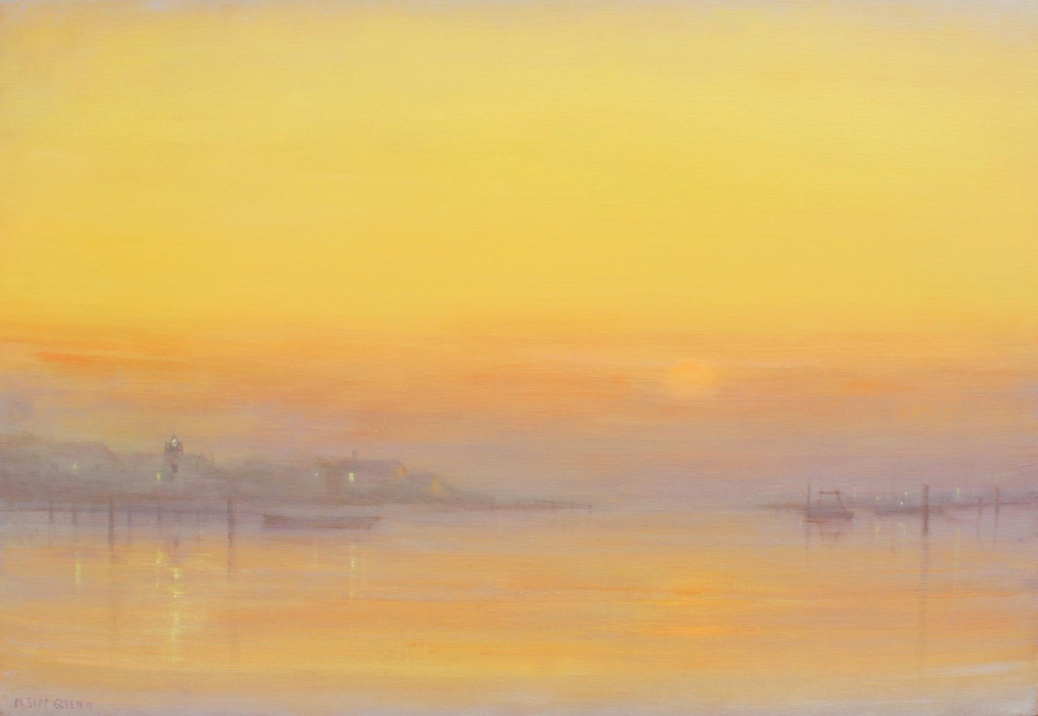 These are paintings to live with. Restrained and blurred, with a minimum of edge, they quietly draw you in, enveloping you as in a dream. There are forms enough to suggest a landscape, a seascape, or trees nestled by a stream. The time of day seems to be at twilight or just before dawn. Over it all is light - light as radiance, light emerging from shadow. Mary Sipp Green has brought her art via expert training to its present day stage over a quarter-century of painting. Its dependable quality will not escape you. Most remarkable to me, is a special sense of emergence. Put another way, her visions seem to find their path from within, rather than be forms applied to a surface…Her paintings offer a delicate serenity and peace.