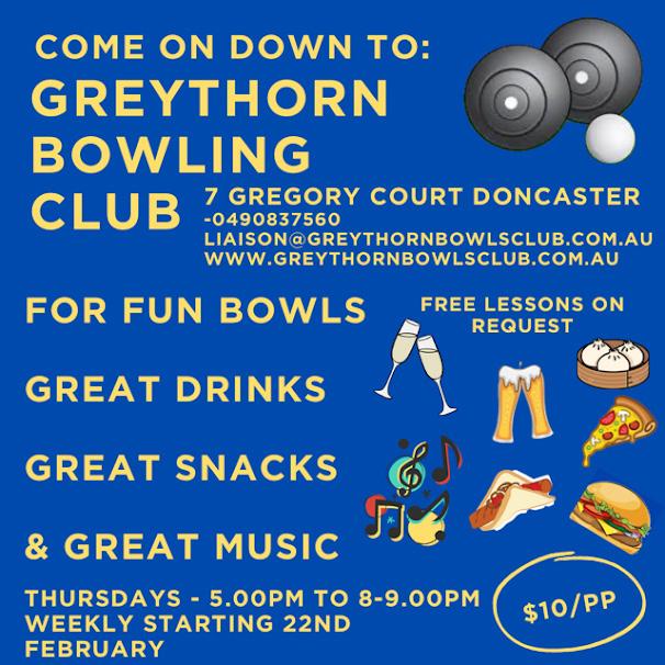 “Come on down for fun/barefoot bowls on Thursday evenings from 22nd February. There will be music playing & snacks and drinks available (South Melbourne dim sims on the first night!) Remember to wear your flat soled shoes! We look forward to welcoming you!”