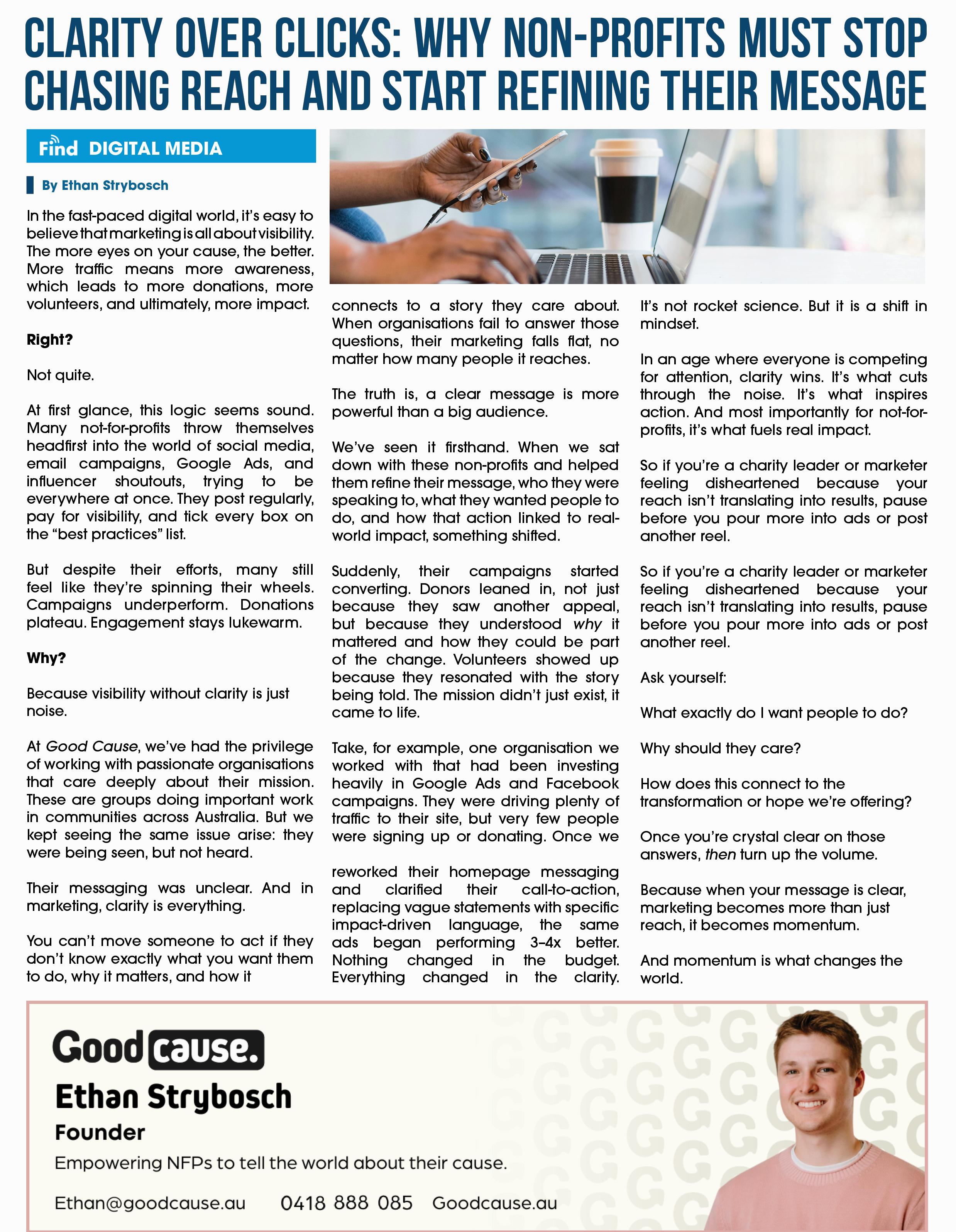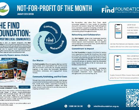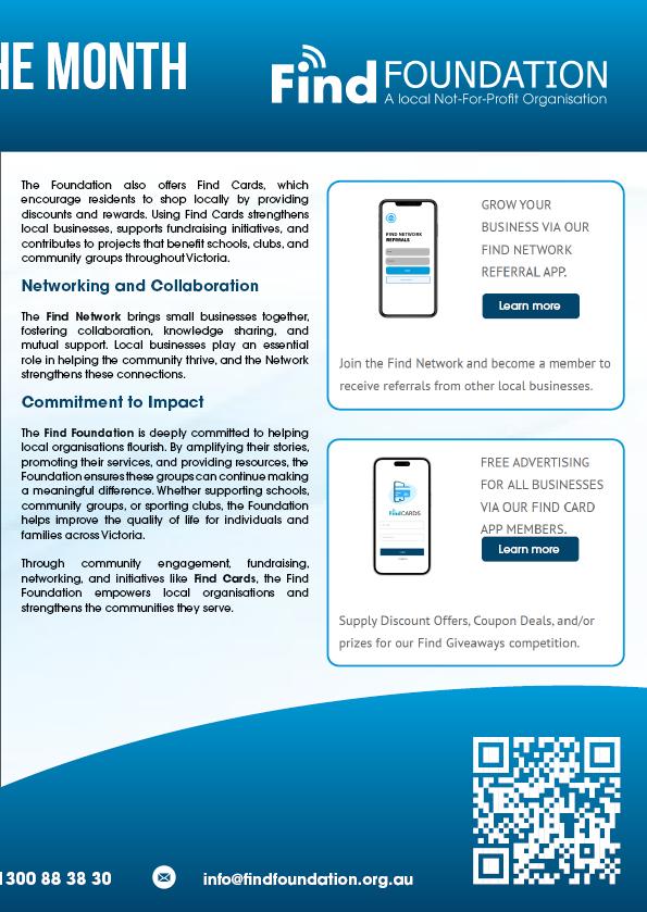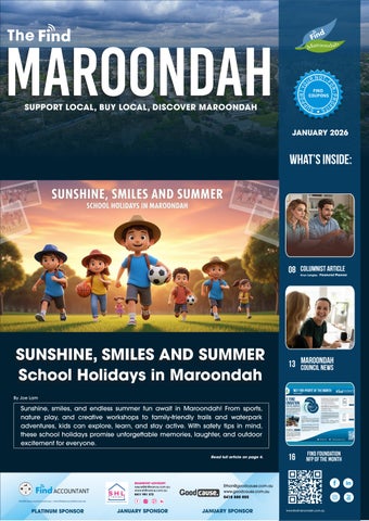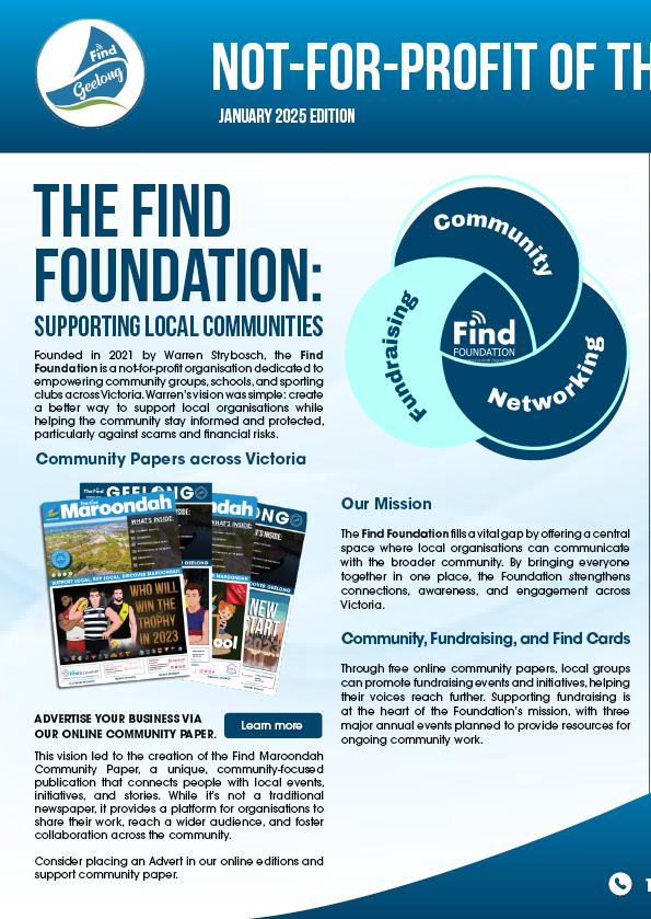 The Find Maroondah is a community paper that aims to support all things Maroondah. We want to provide a place where all Not-For-Profits (NFP), schools, sporting groups and other like organisations can share their news in one place. For instance, submitting up-andcoming events in the Find Maroondah for Free.