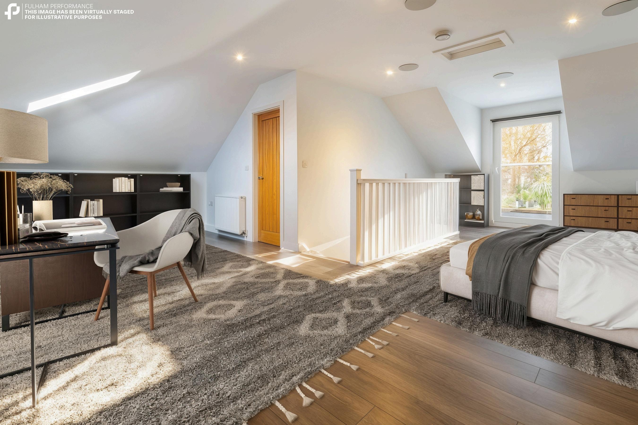 Upstairs, a private staircase leads to a further bedroom with its own en-suite and access to a stunning glazed balcony, overlooking the front garden.
