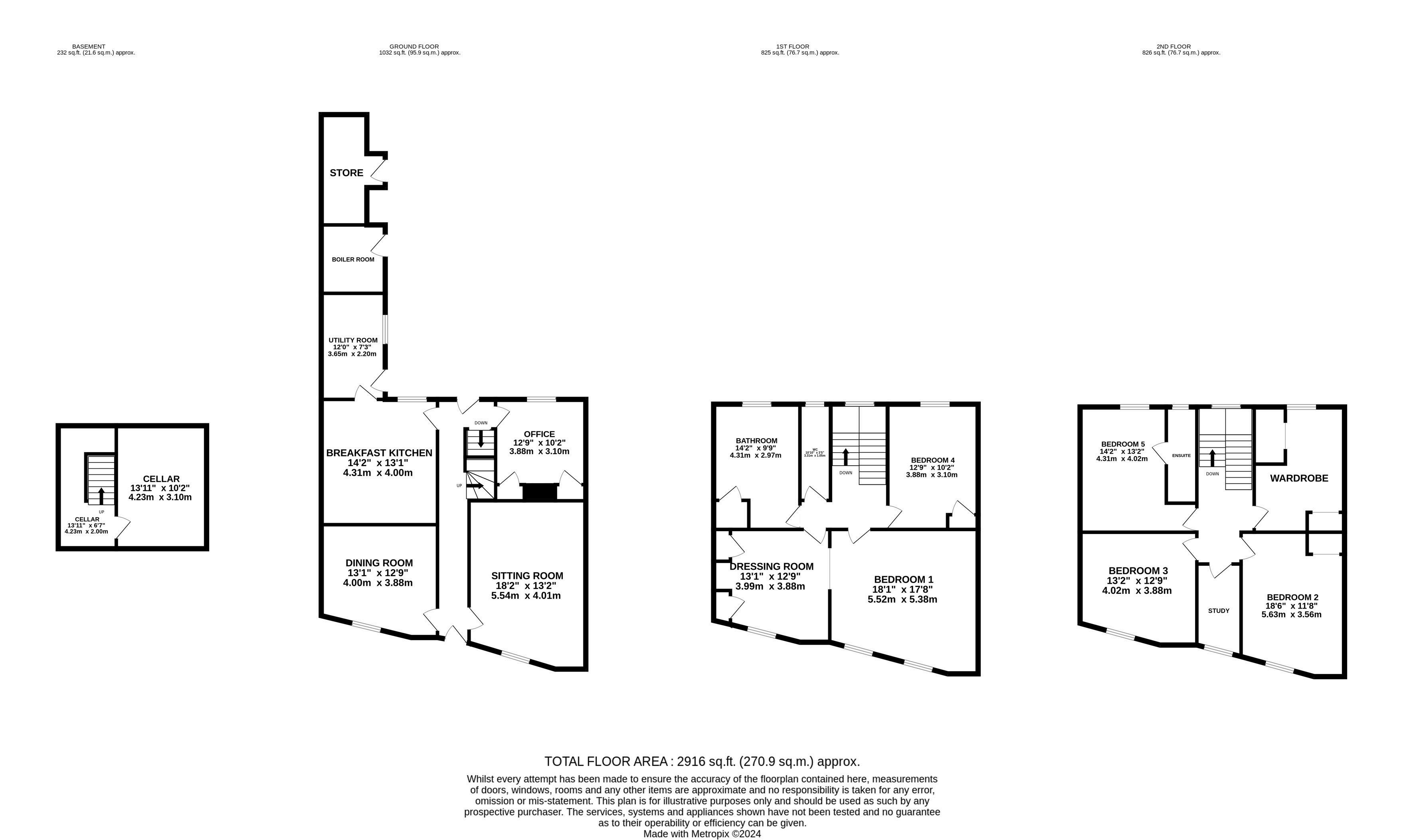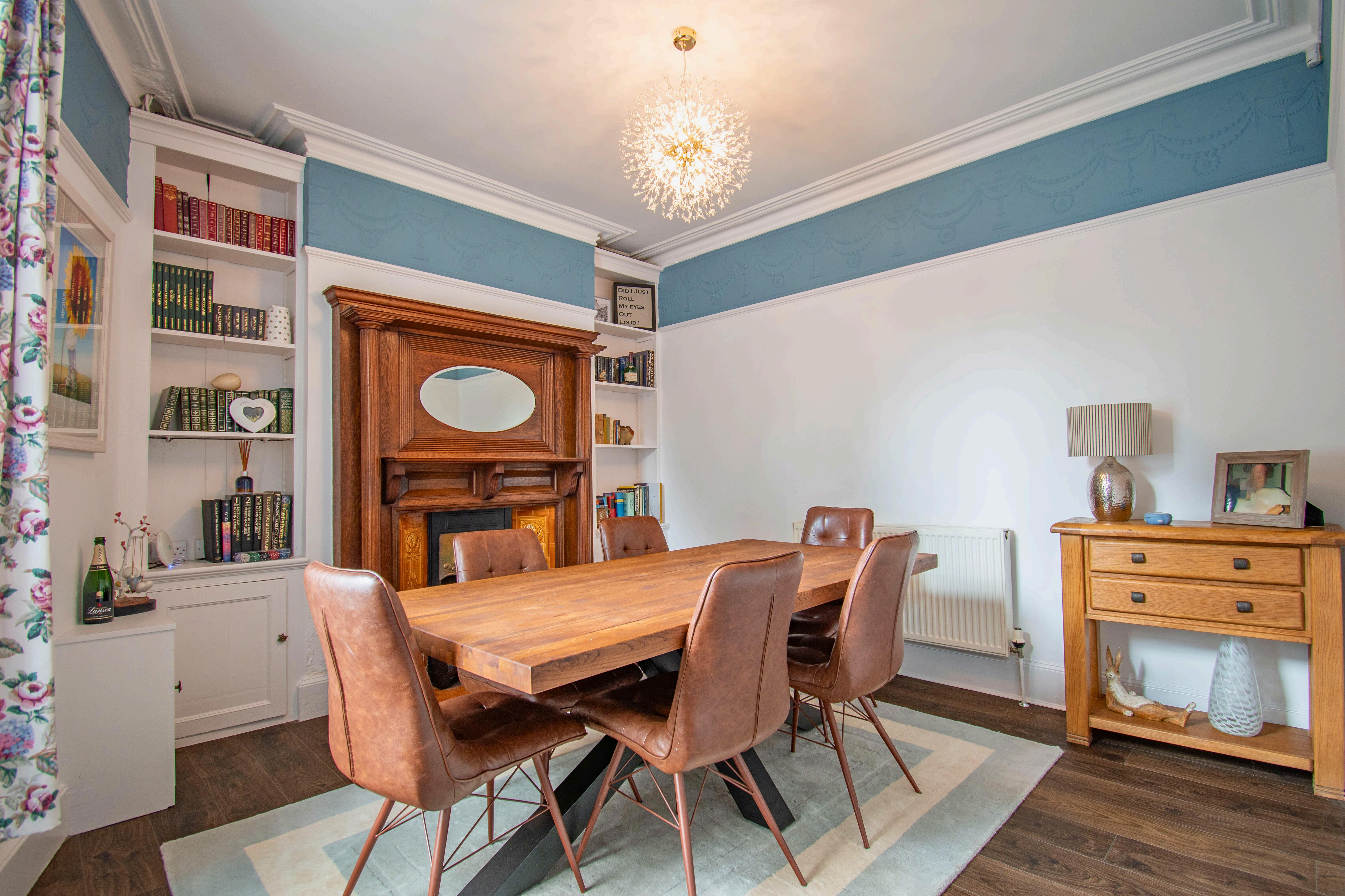 The hallway first leads to an elegant sitting room, where modern décor beautifully complements period features like a stunning marble fireplace with a woodburning stove. The second front-facing reception room serves as a formal dining area, adorned with a Georgian-style fireplace. The third reception room, a spacious rear-facing home study, offers a versatile space that can be used as a playroom or an additional sitting room, catering to a family's needs. There is even a small cellar accessible from the hall.