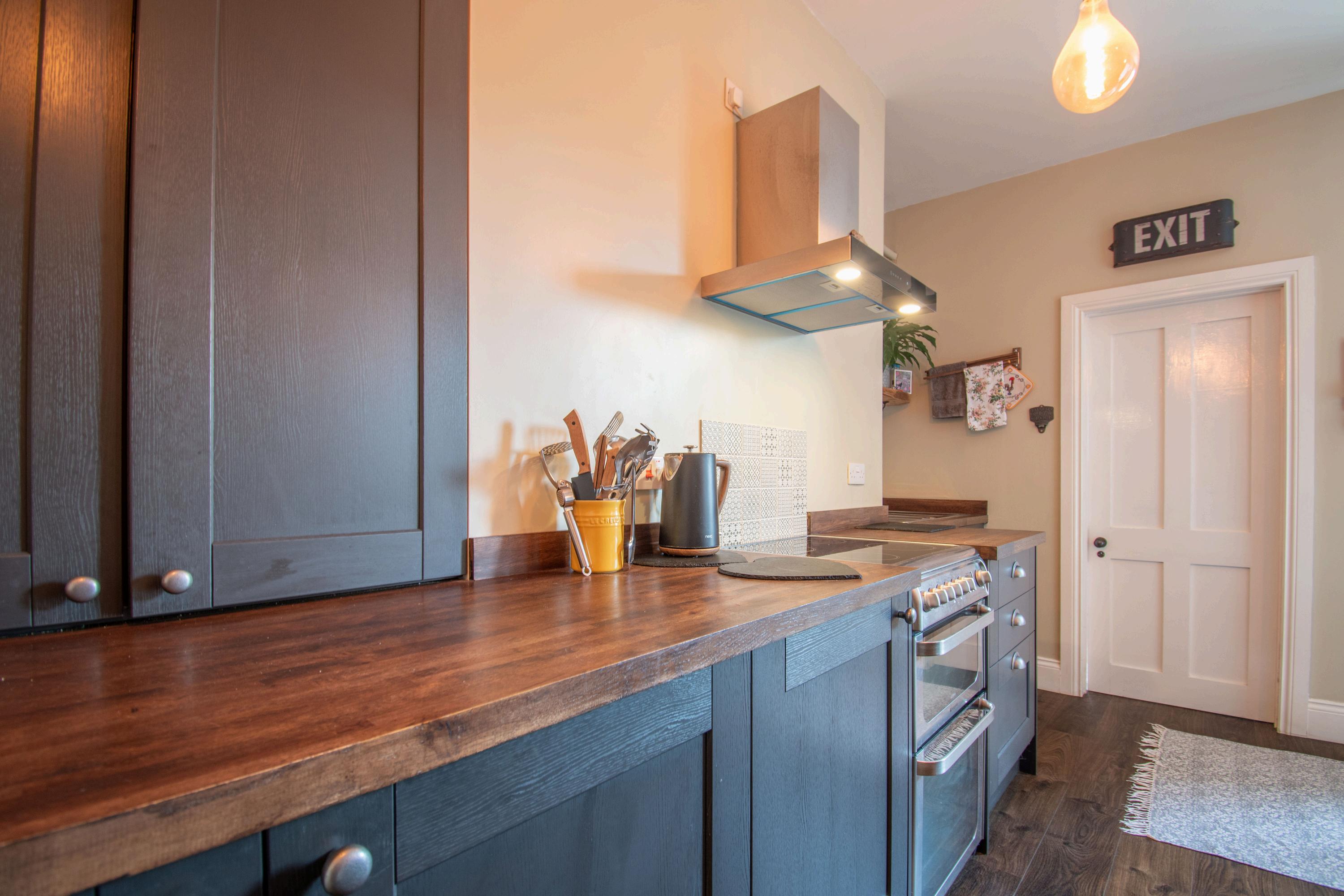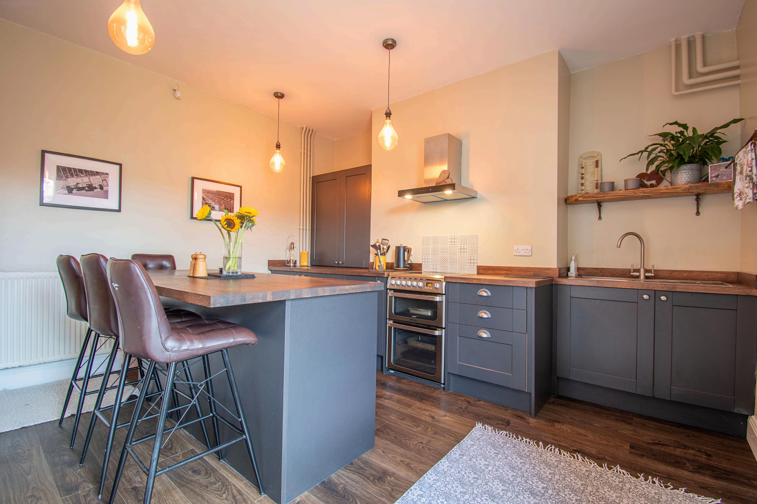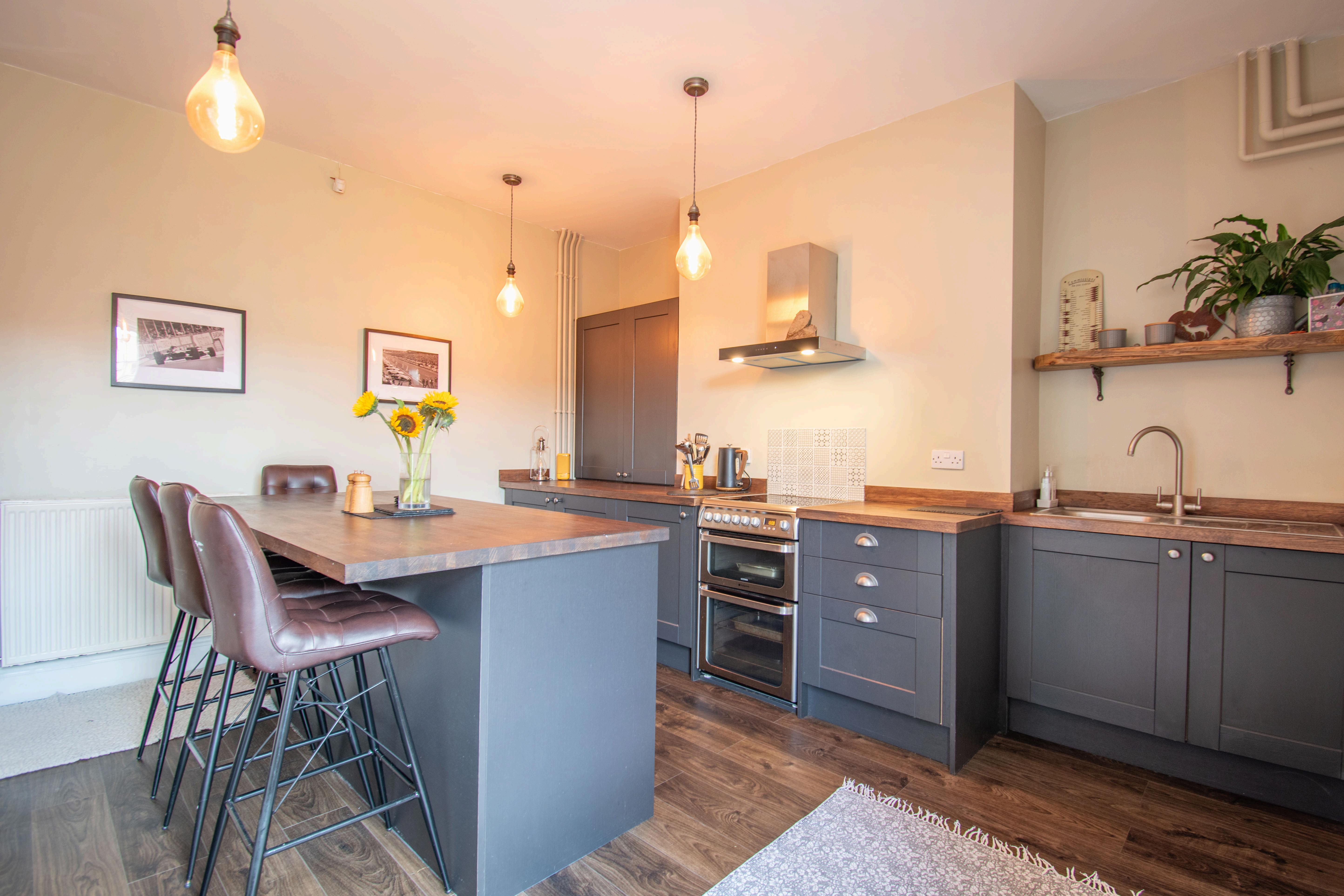 The kitchen features an array of shaker-style units in slate grey, complemented by a matching center island that includes an integrated breakfast bar. At the back of the kitchen, a door leads to a utility/boot room, which has an entrance to the rear garden.