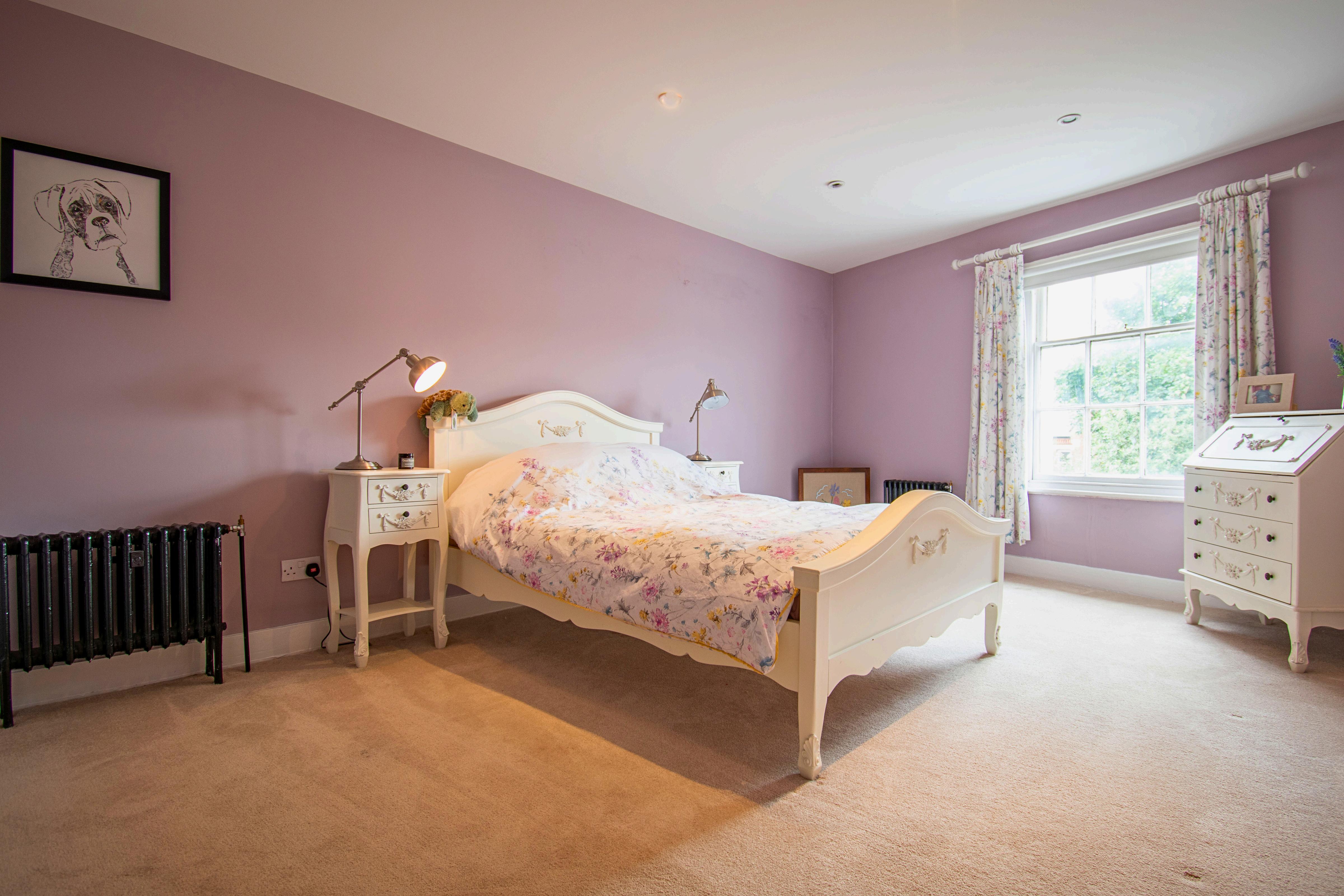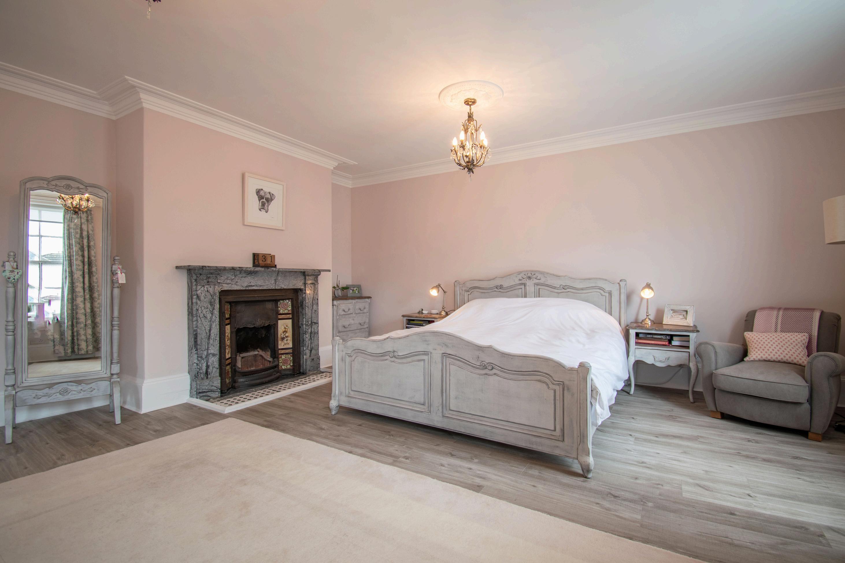The period staircase, adorned with a polished wood handrail, ascends to the first-floor landing, leading to the elegant principal bedroom. This sophisticated room features a stunning marble fireplace. A broad archway seamlessly connects to a dressing and sitting area, which also boasts a period fireplace and was originally a separate bedroom. This space has been transformed into a luxurious suite. Closely positioned off the landing, immediately adjacent to the dressing room a door opens to the family bathroom, which includes a traditional fivepiece suite. Adjacent to the bathroom is an additional separate w.c.