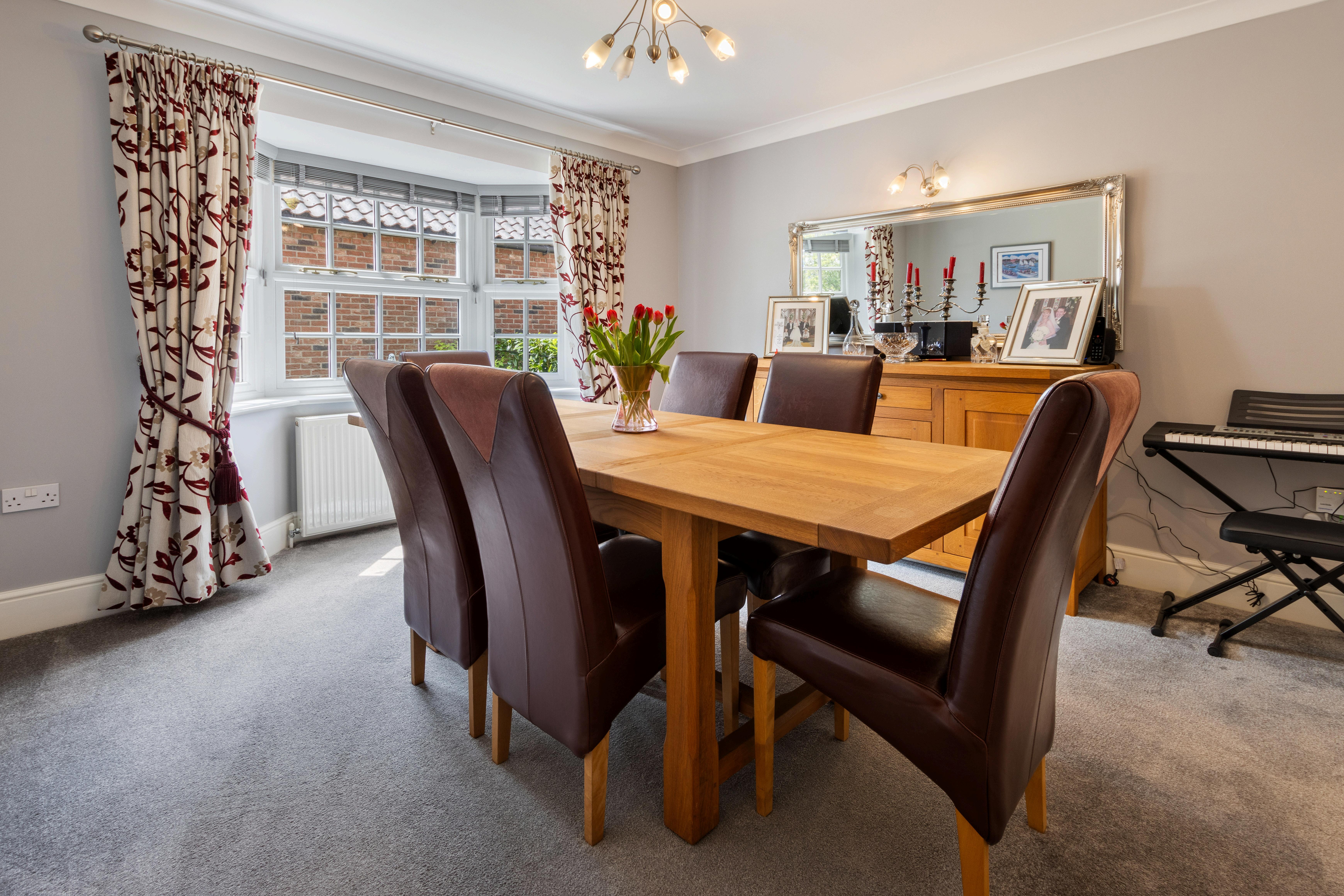 The formal lounge offers generous proportions, with a feature fireplace, dual aspect windows, and french doors opening onto the rear garden. Adjacent, a bright and airy dining room easily accommodates a large dining table and benefits from a front-facing bay window.