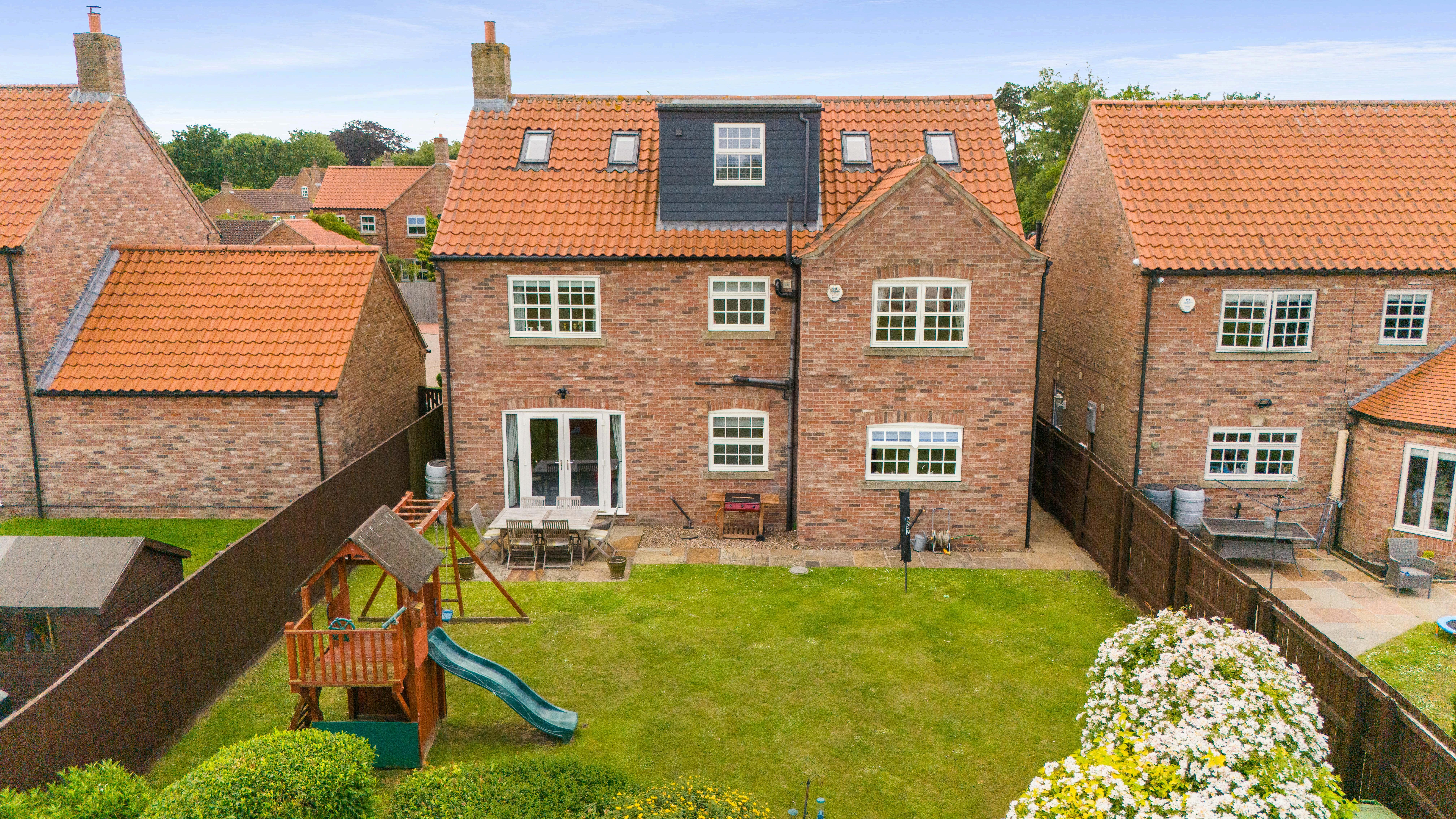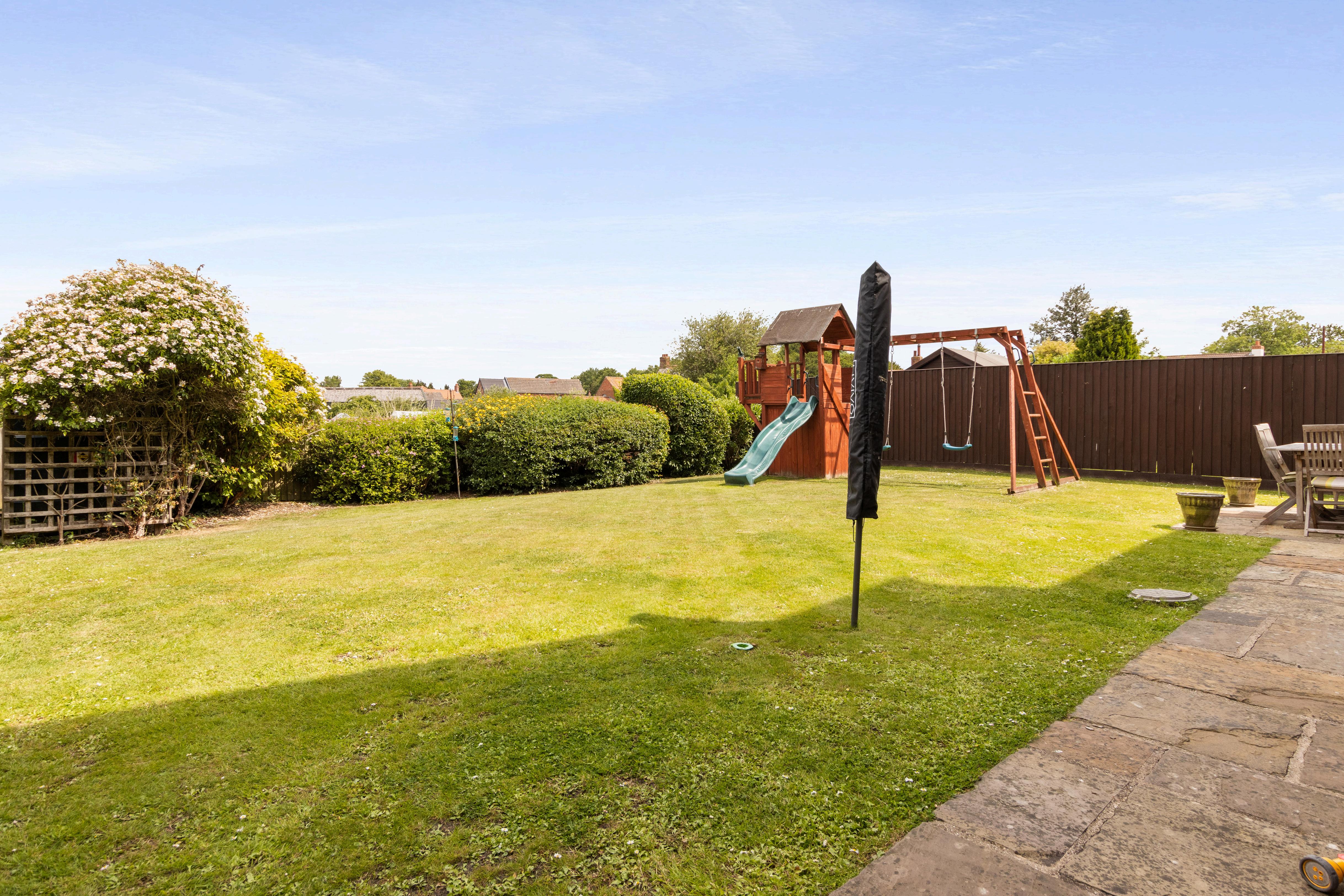 The rear garden is ideal for both relaxation and family use, with paved patio areas for outdoor dining and BBQs, lawns for children’s play, and mature borders that frame the open countryside beyond. A gated pathway provides access to the side of the property, while practical storage areas are discreetly positioned.