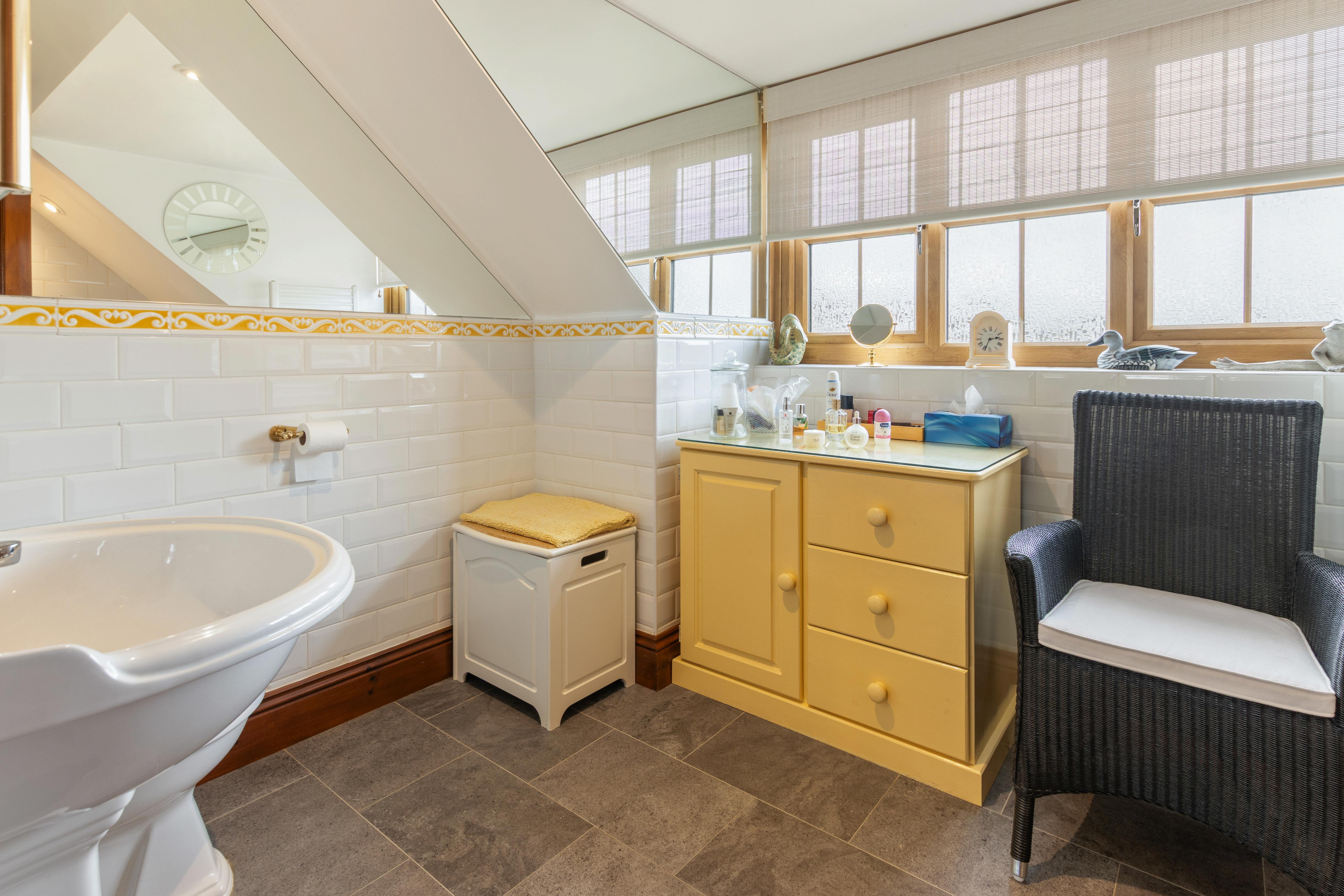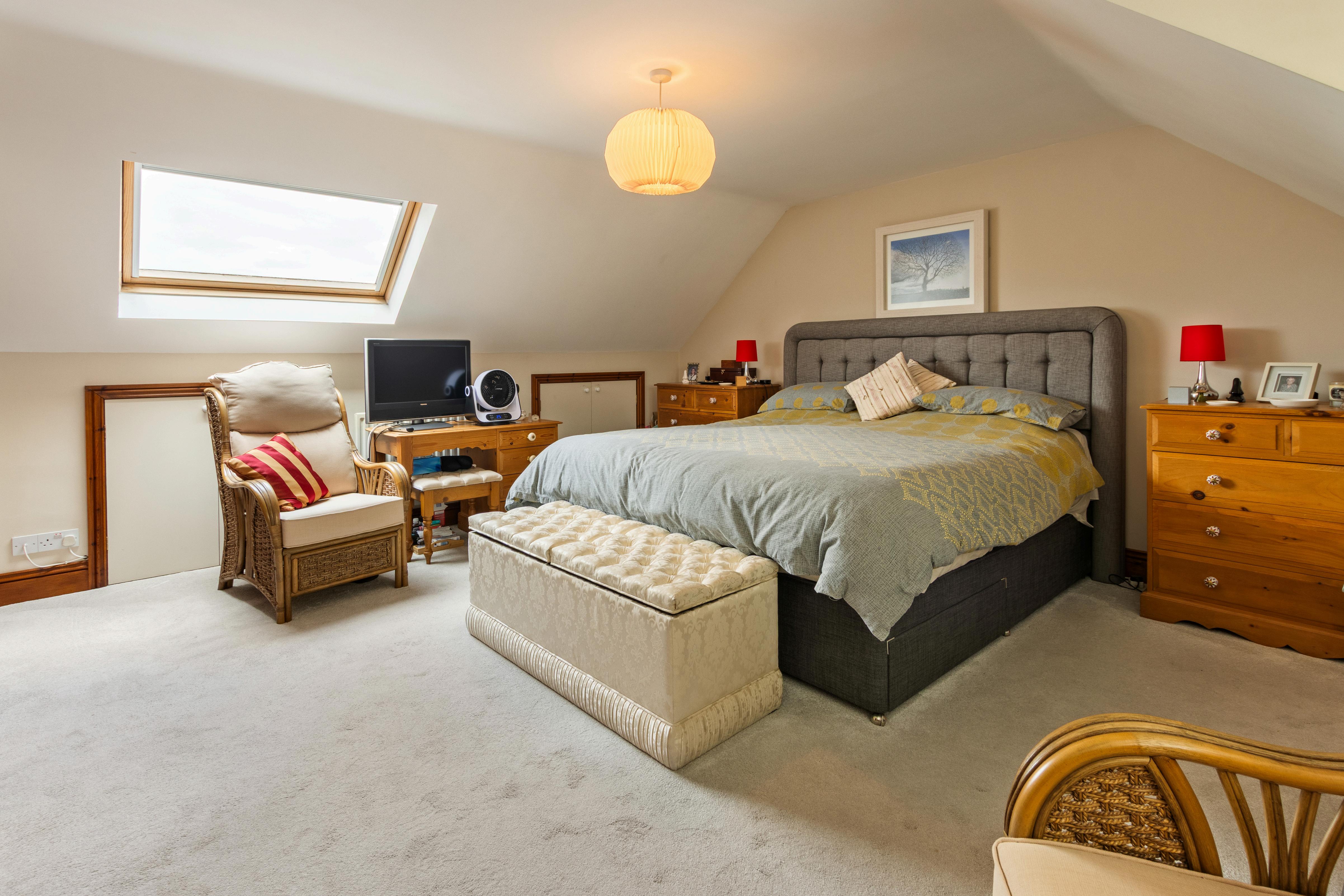 Upstairs, the landing leads to two substantial double bedrooms, each spanning the full depth of the home. Bedrooms one and two both benefit from ample fitted wardrobes and eaves storage, providing excellent space and practicality. The stylish family bathroom is fitted with a freestanding bath, separate walk-in shower, and contemporary vanity unit.