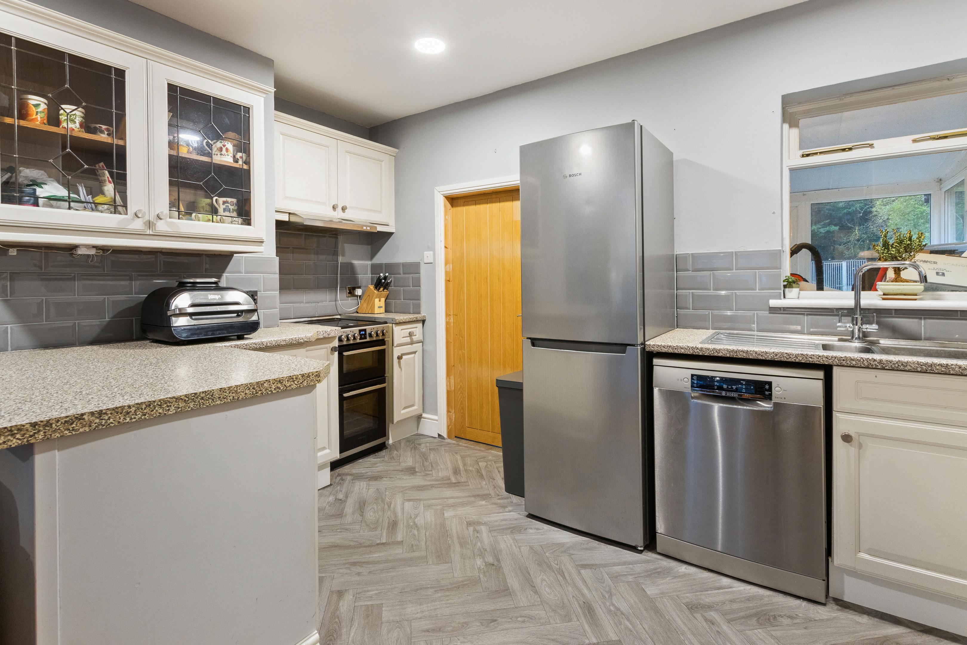 The kitchen offers ample worktop and cupboard space and benefits from a handy pantry cupboard beneath the stairs, providing excellent additional storage. To the rear of the home, the conservatory enjoys pleasant views over the garden and creates a bright and versatile extra living area, ideal for dining, relaxing or working from home.
