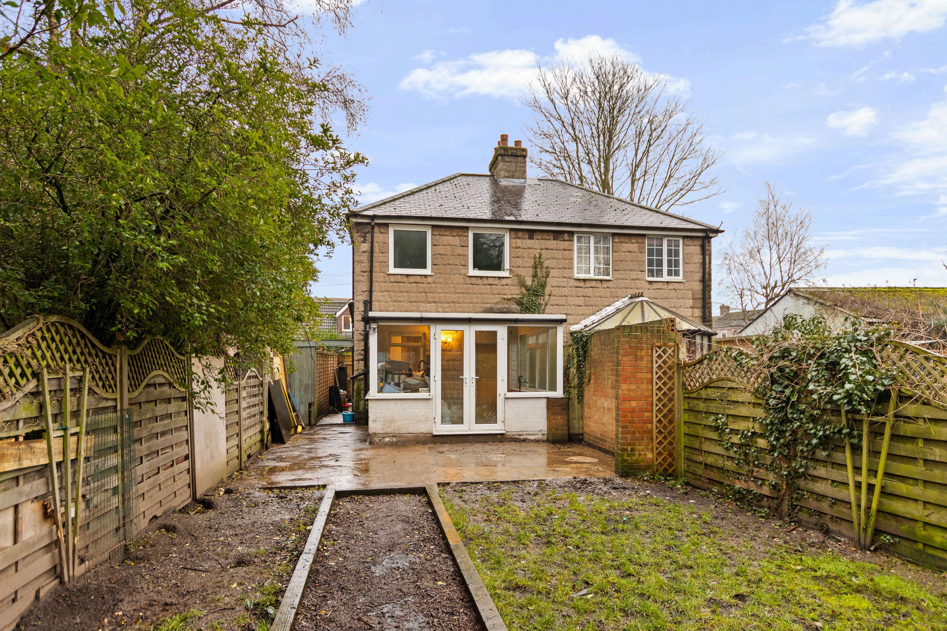To the front of the property, a driveway provides off-road parking for one vehicle. The rear garden is a real highlight, offering a good-sized outdoor space with a patio area for seating and entertaining, along with a lawned section ideal for families, pets or keen gardeners.