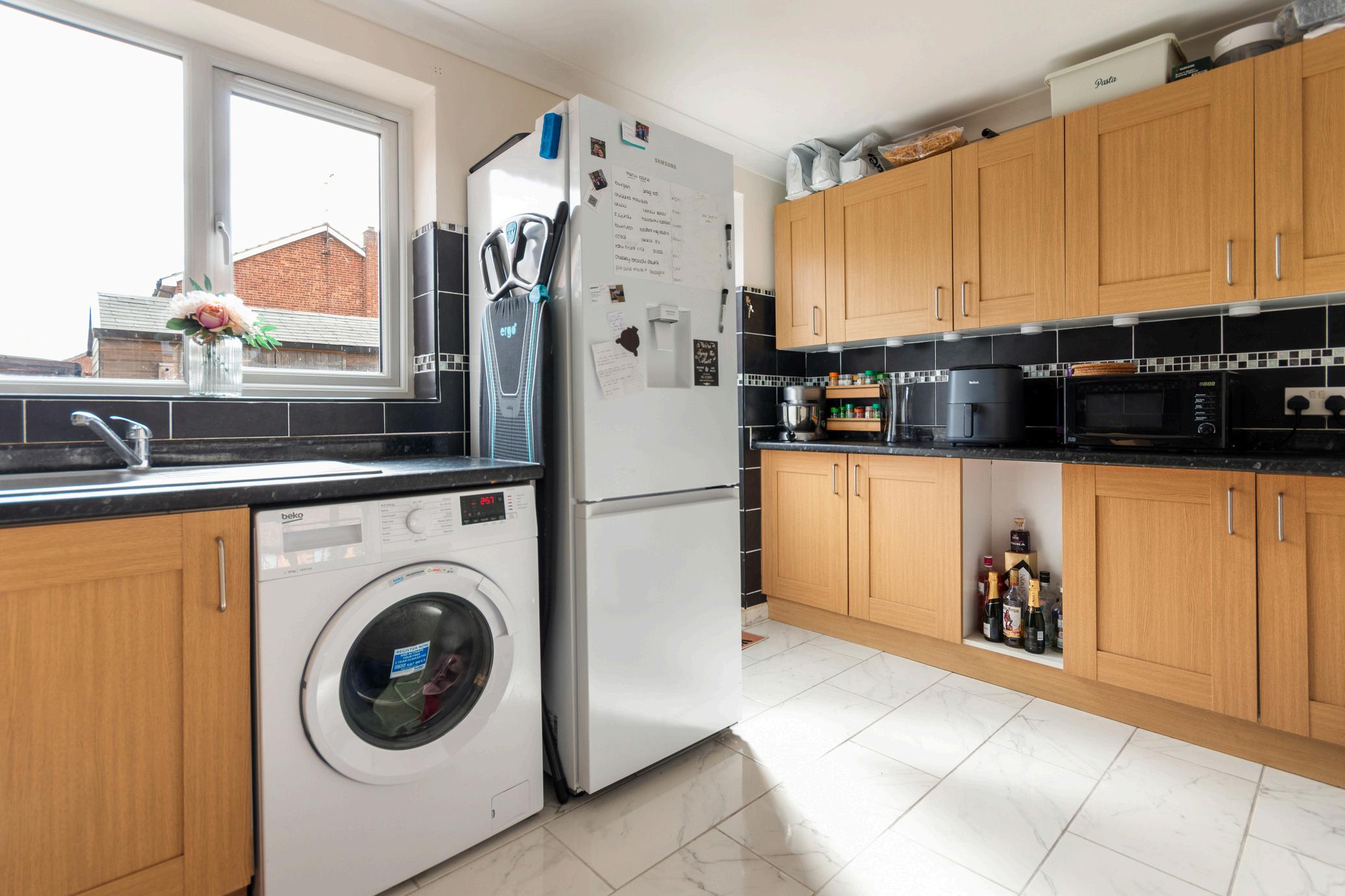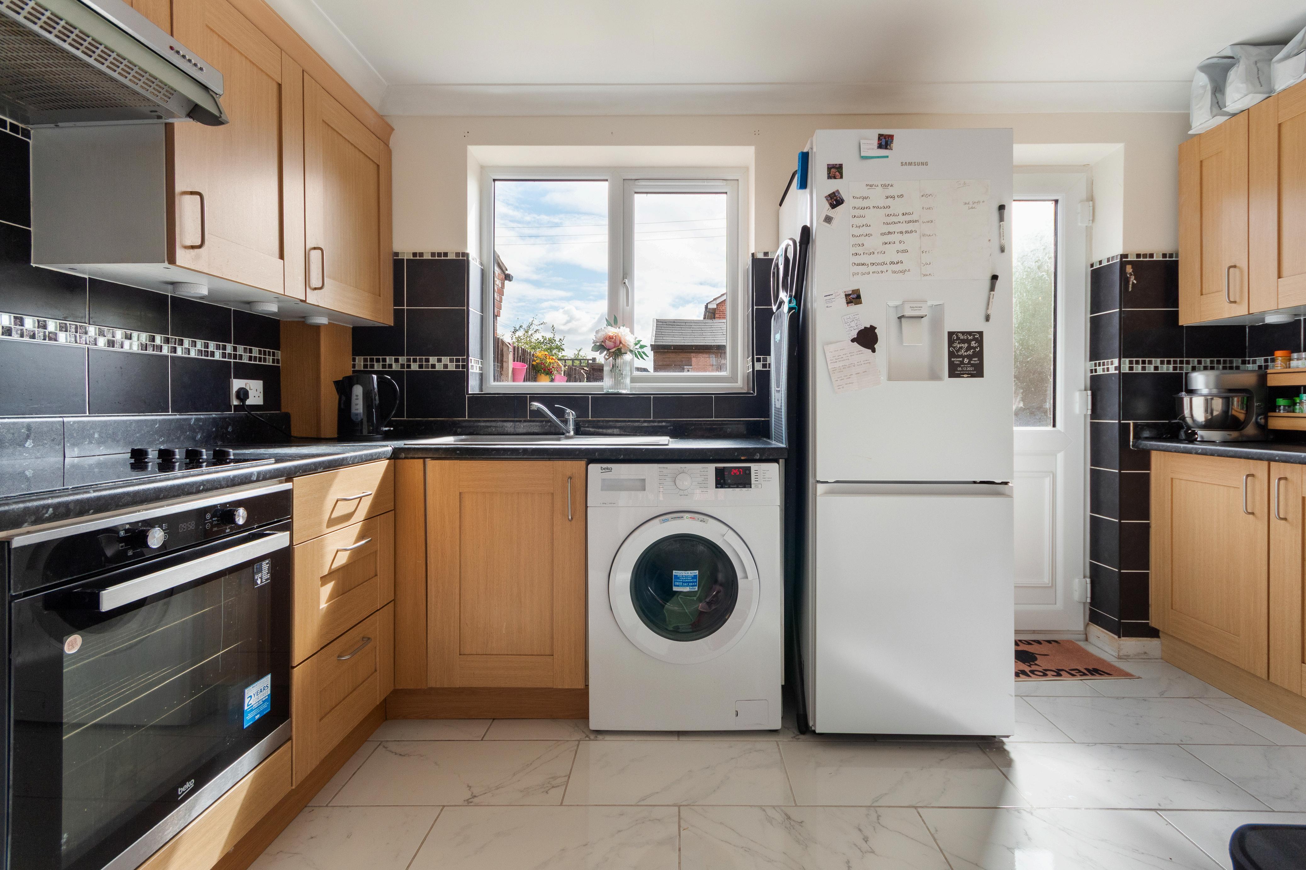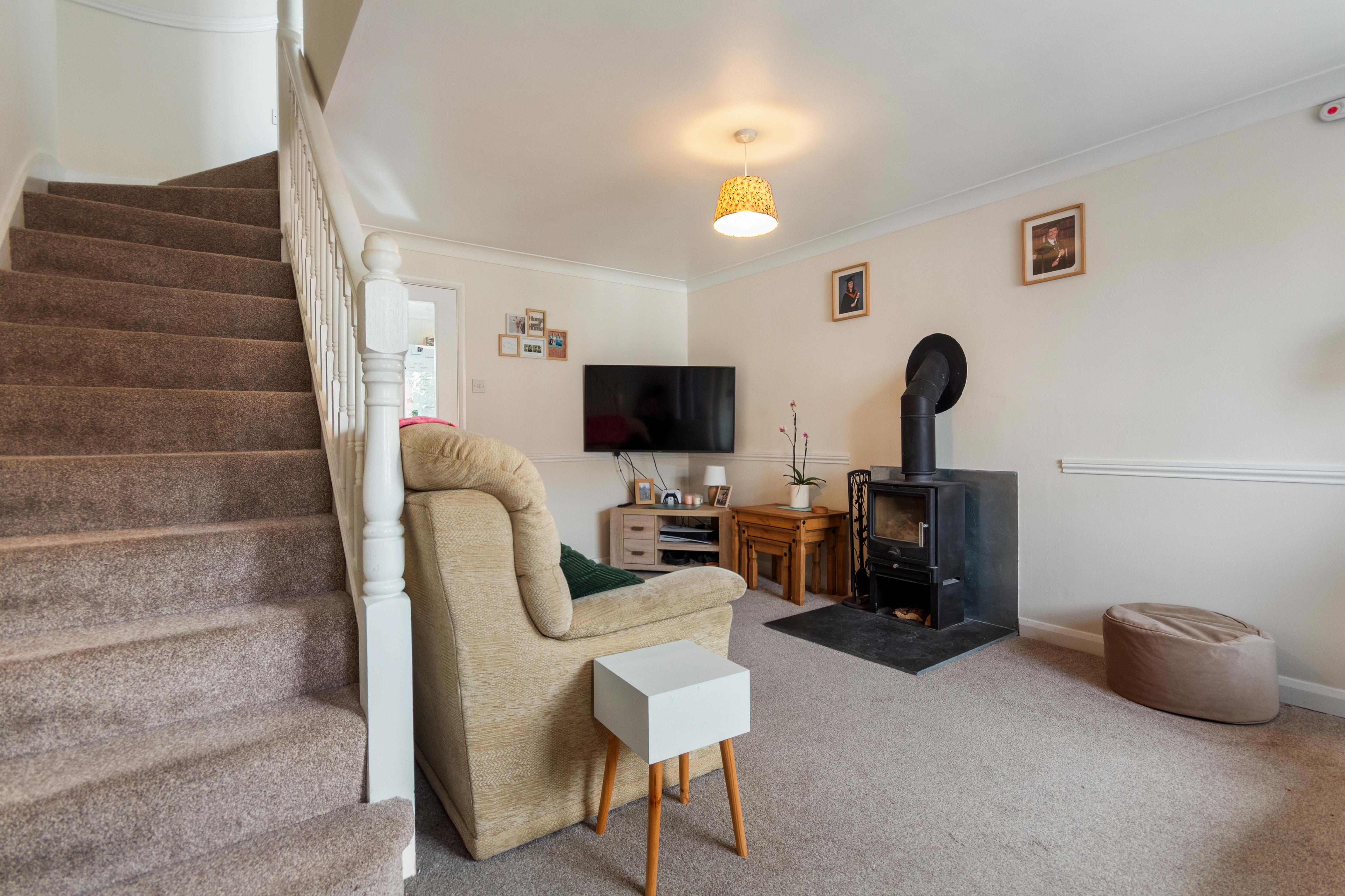 The property offers a welcoming entrance porch leading into a cosy lounge featuring a charming log burner and handy understairs storage, perfect for keeping things neat and tidy. The kitchen is fitted with a range of wall and base units, an integrated oven with electric hob and extractor, and space for both a washing machine and dishwasher. A door from the kitchen opens out to the rear garden, making it ideal for summer dining and entertaining.