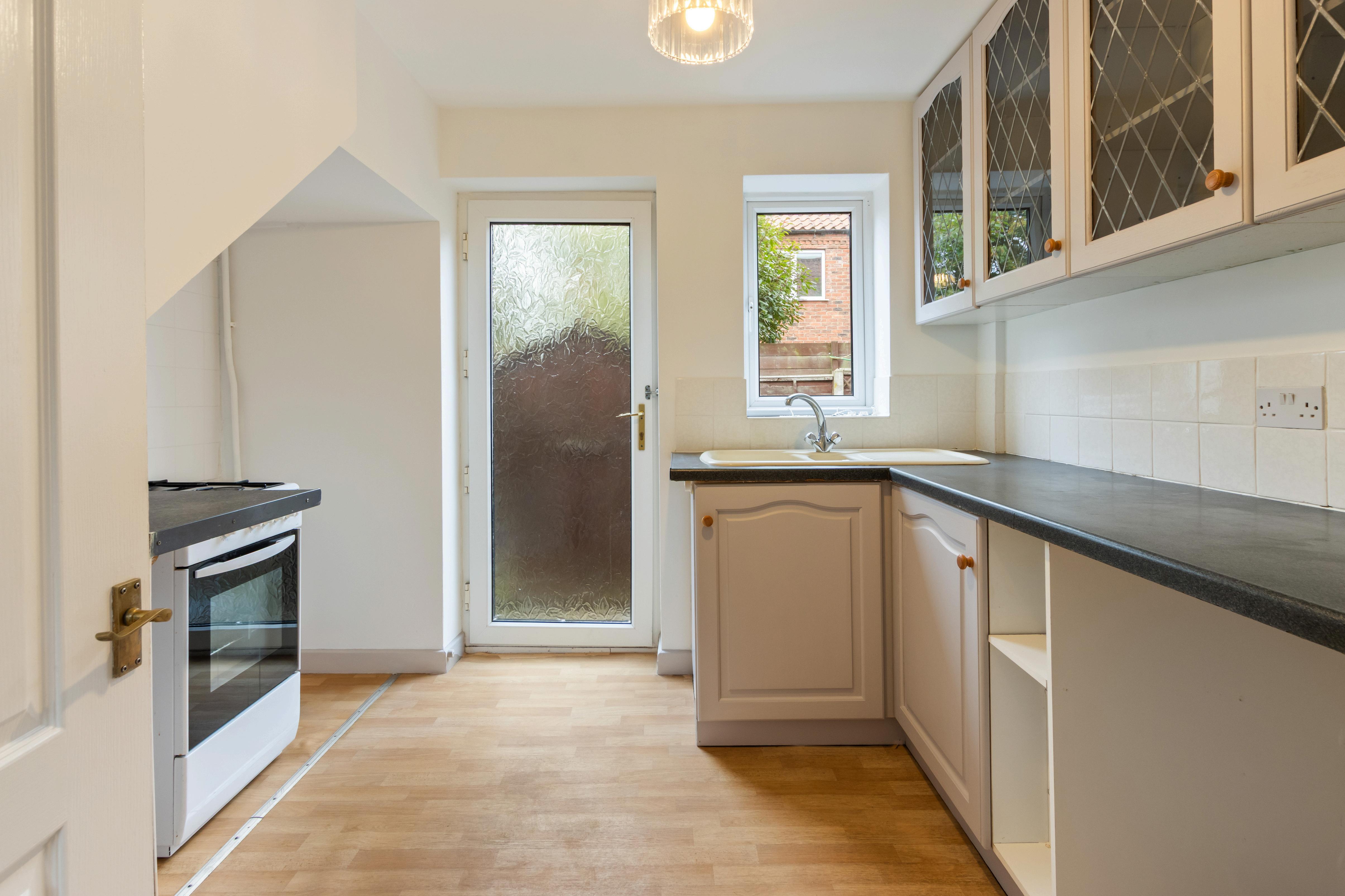 From here, a door opens into the kitchen, which enjoys a pleasant outlook over the rear garden. Fitted with a range of traditionalstyle cabinets, tiled splashbacks, and generous worktop space, the kitchen offers room for free-standing appliances and a useful understairs storage area. A part-glazed door leads directly outside, enhancing the home’s connection between indoor and outdoor living.