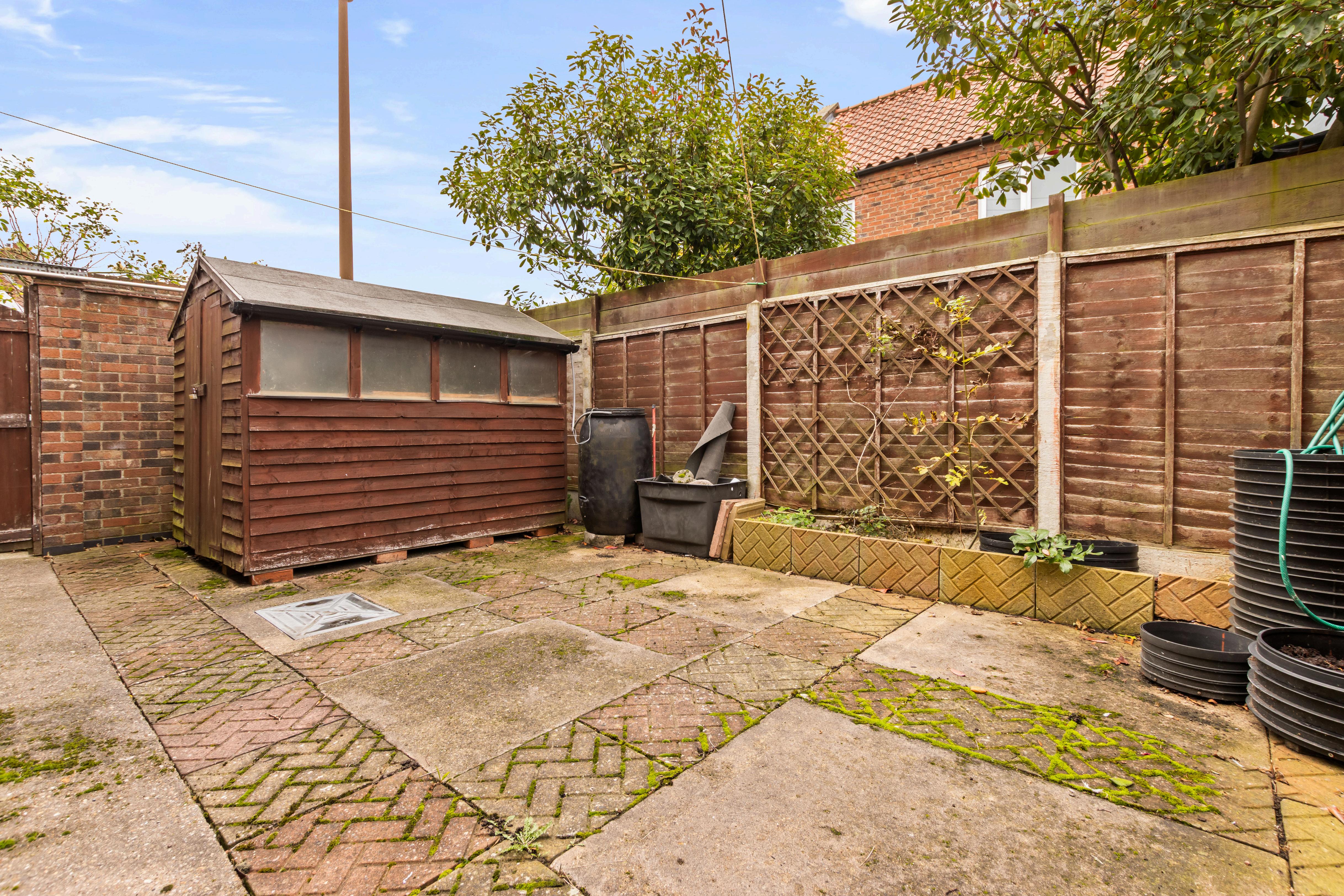 To the rear, the property enjoys a private, enclosed courtyard garden — an easy-to-maintain outdoor space perfect for relaxing, dining al fresco, or tending to potted plants. The area is securely fenced, with space for bins and a useful storage area, providing both practicality and privacy.