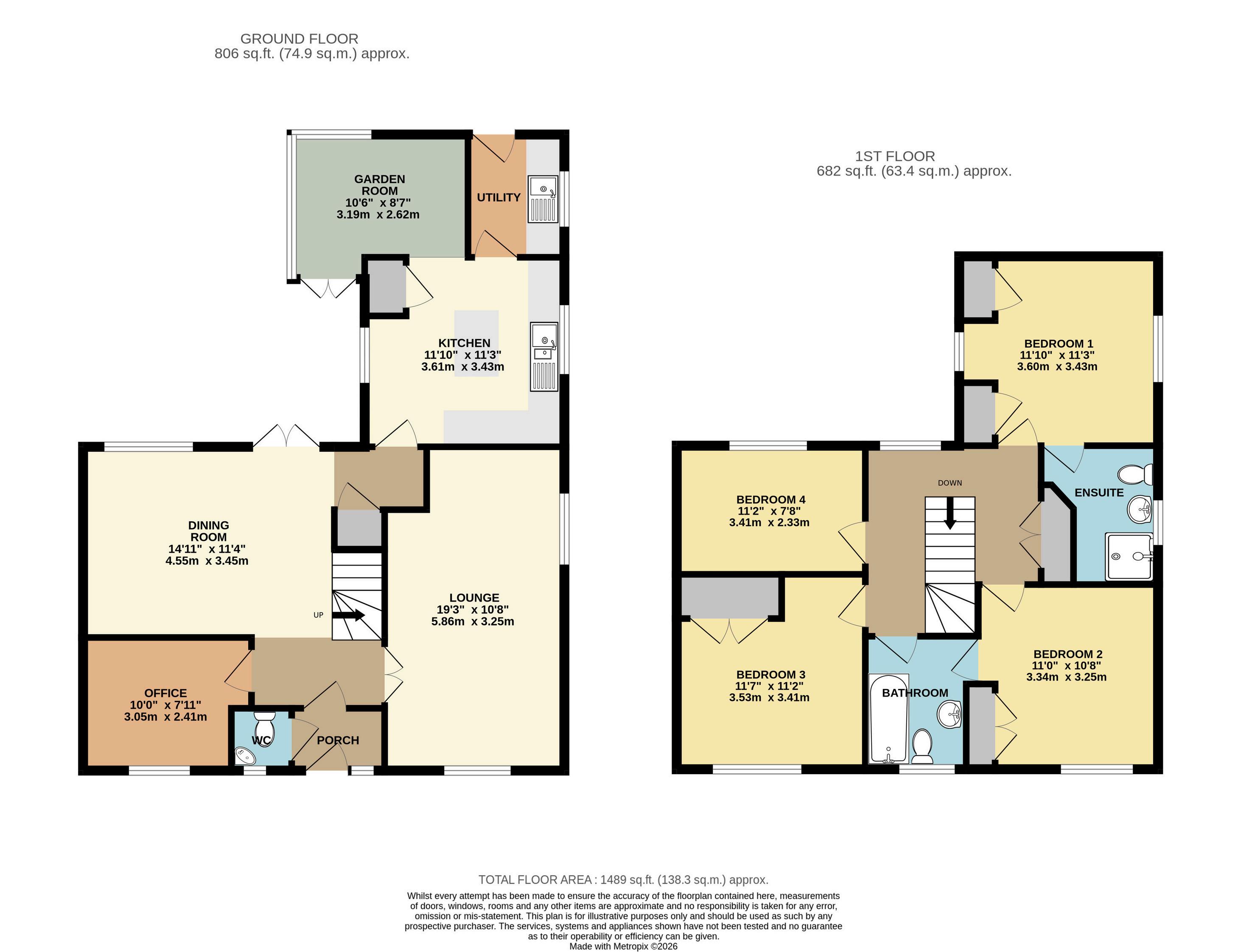 Upstairs, the open landing leads to four wellproportioned double bedrooms and a family bathroom. The master bedroom enjoys dual-aspect windows, built-in wardrobes and a spacious, modern en-suite. Bedroom two also features fitted wardrobes and the rare benefit of private access to the family bathroom. Bedroom three includes built-in storage, while bedroom four offers a comfortable smaller double. A double-door storage cupboard adds further practicality to the first floor.