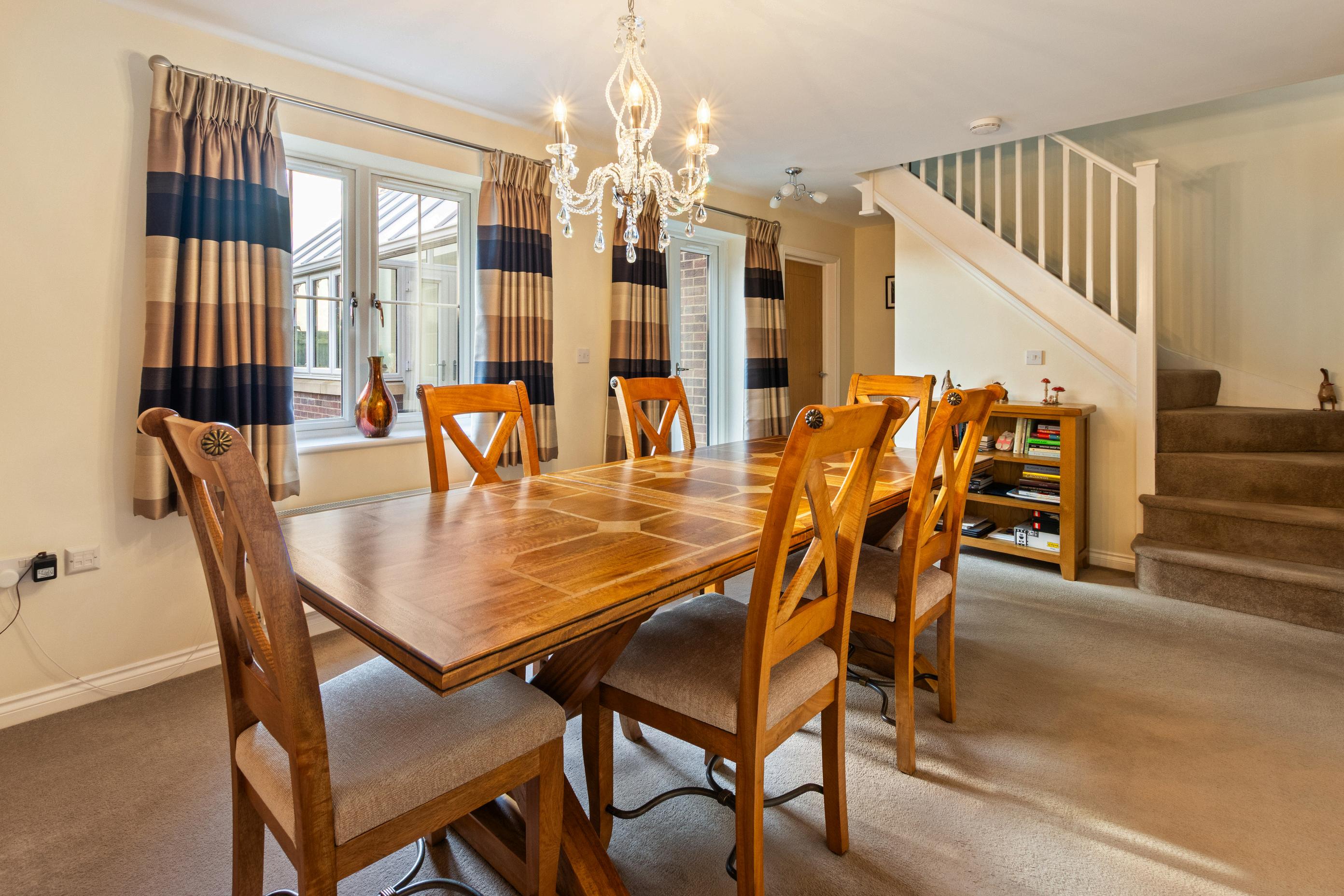 The hallway flows through to a striking open dining area with feature open staircase and patio doors leading to the covered winter garden, extending the living space beautifully throughout the seasons. Beyond this is a stylish modern kitchen, complete with integrated appliances, a central island and direct access to the sunroom, creating a sociable hub for everyday life. A utility room and ground-floor WC complete the layout.