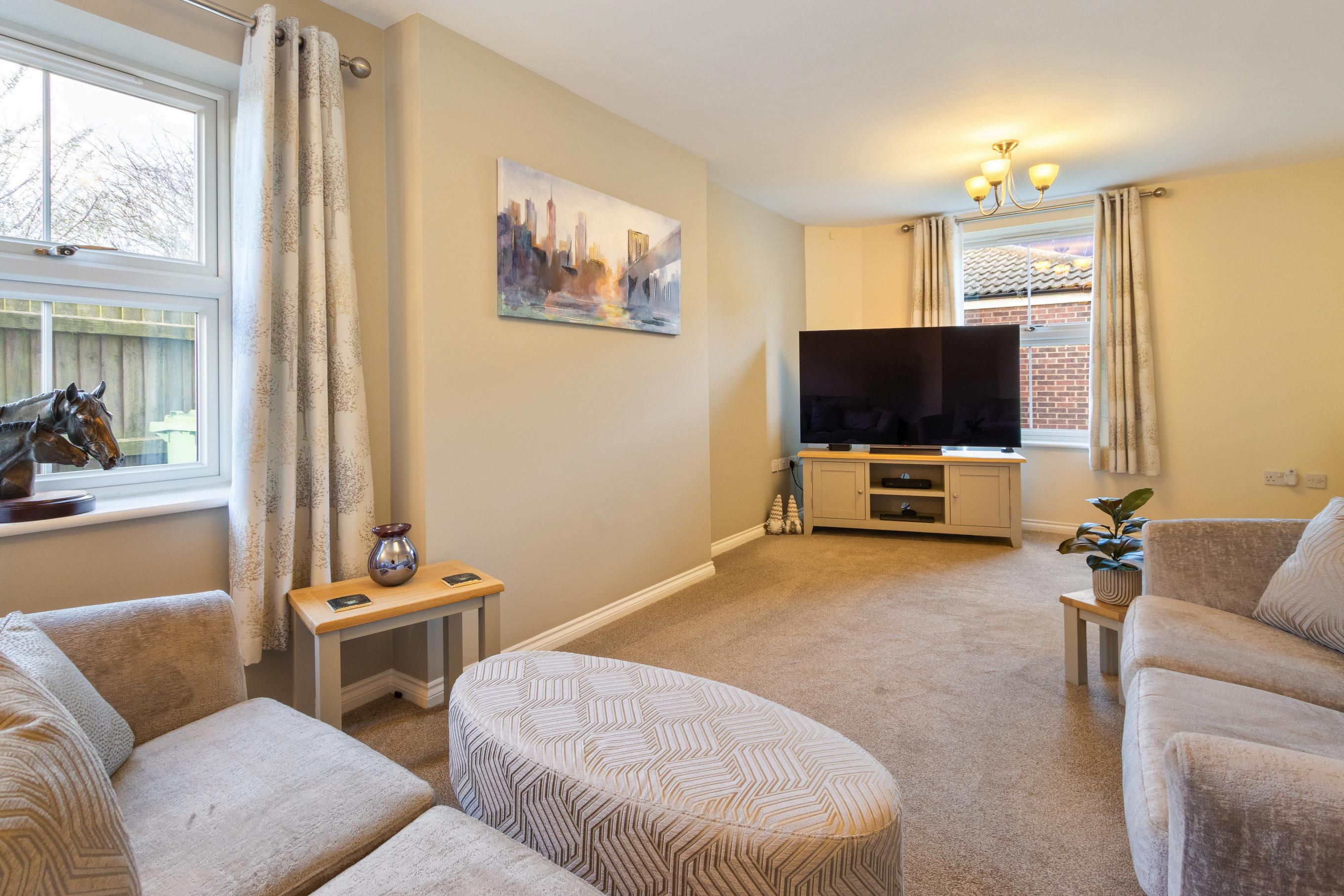 A central entrance hall sets the tone, opening to a spacious lounge with dual aspect windows on the right – a bright and comfortable room ideal for relaxing or entertaining. To the left, a further reception room provides excellent flexibility, perfect as a home office, snug or playroom depending on your needs.
