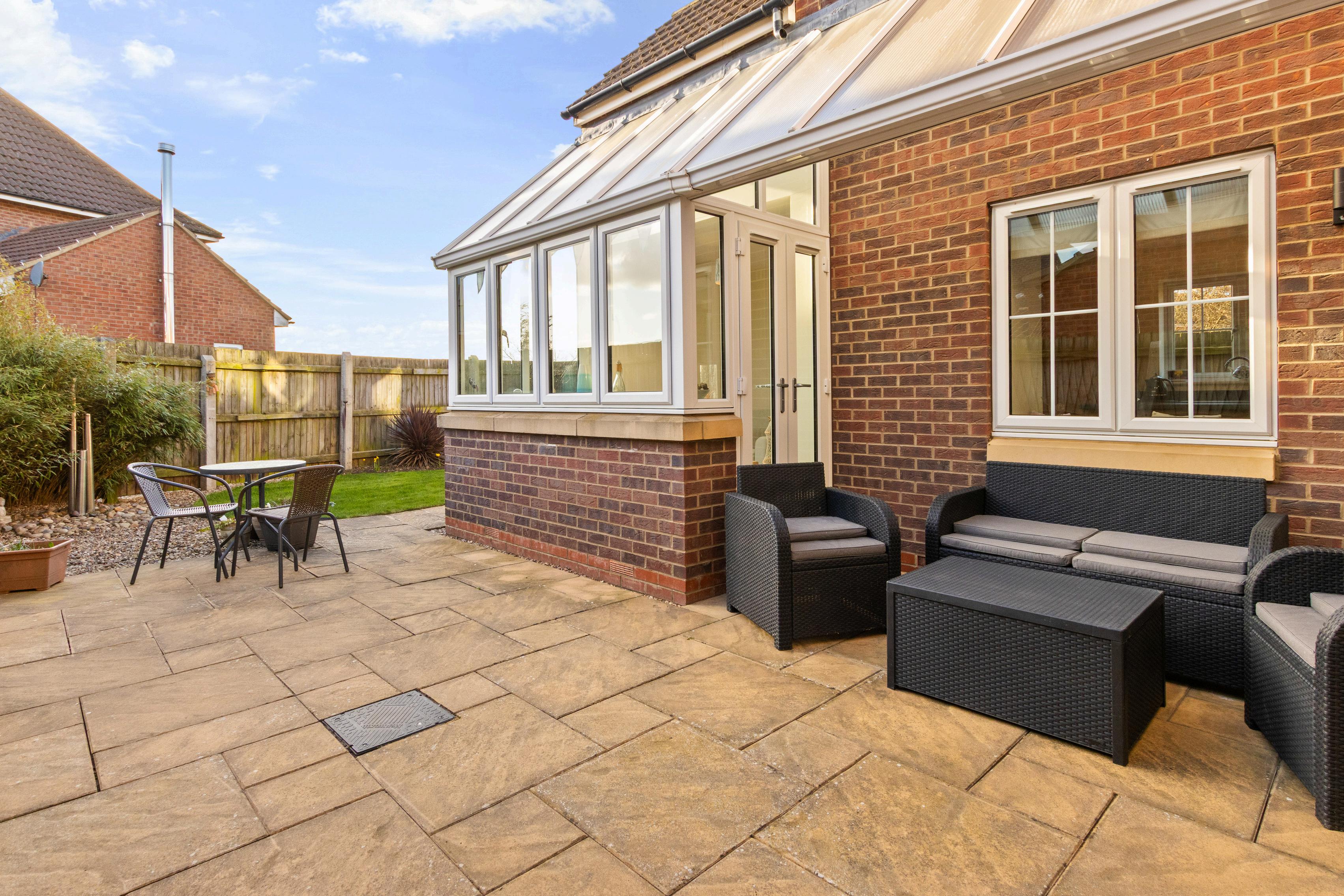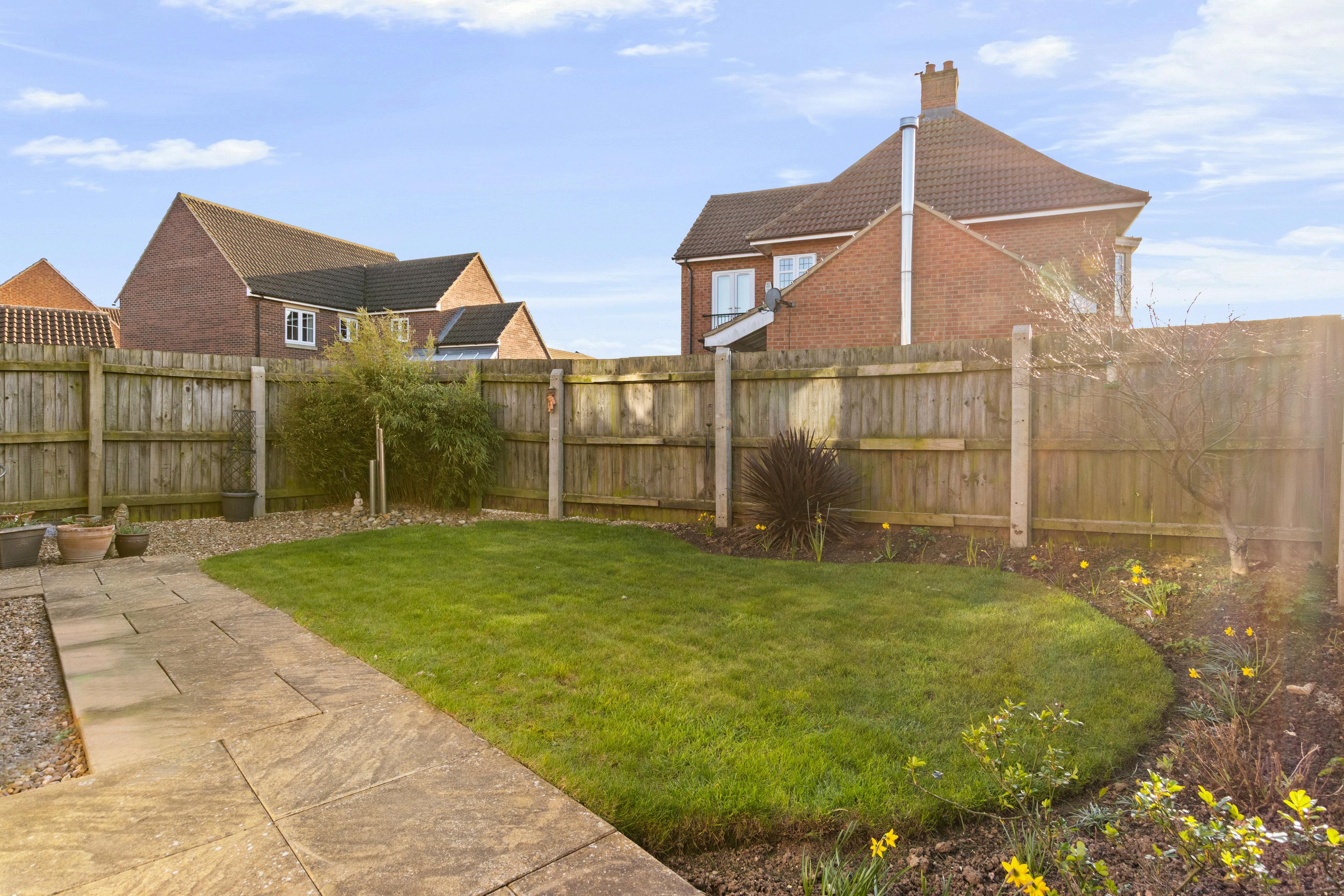 The property enjoys a generous plot with a double garage, complete with EV charger. The south-facing rear garden has a wonderfully private feel, with views beyond the fence towards the play park and bridleway. Laid mainly to lawn with planted borders and patio areas, it provides an inviting space for outdoor dining, play and relaxation.