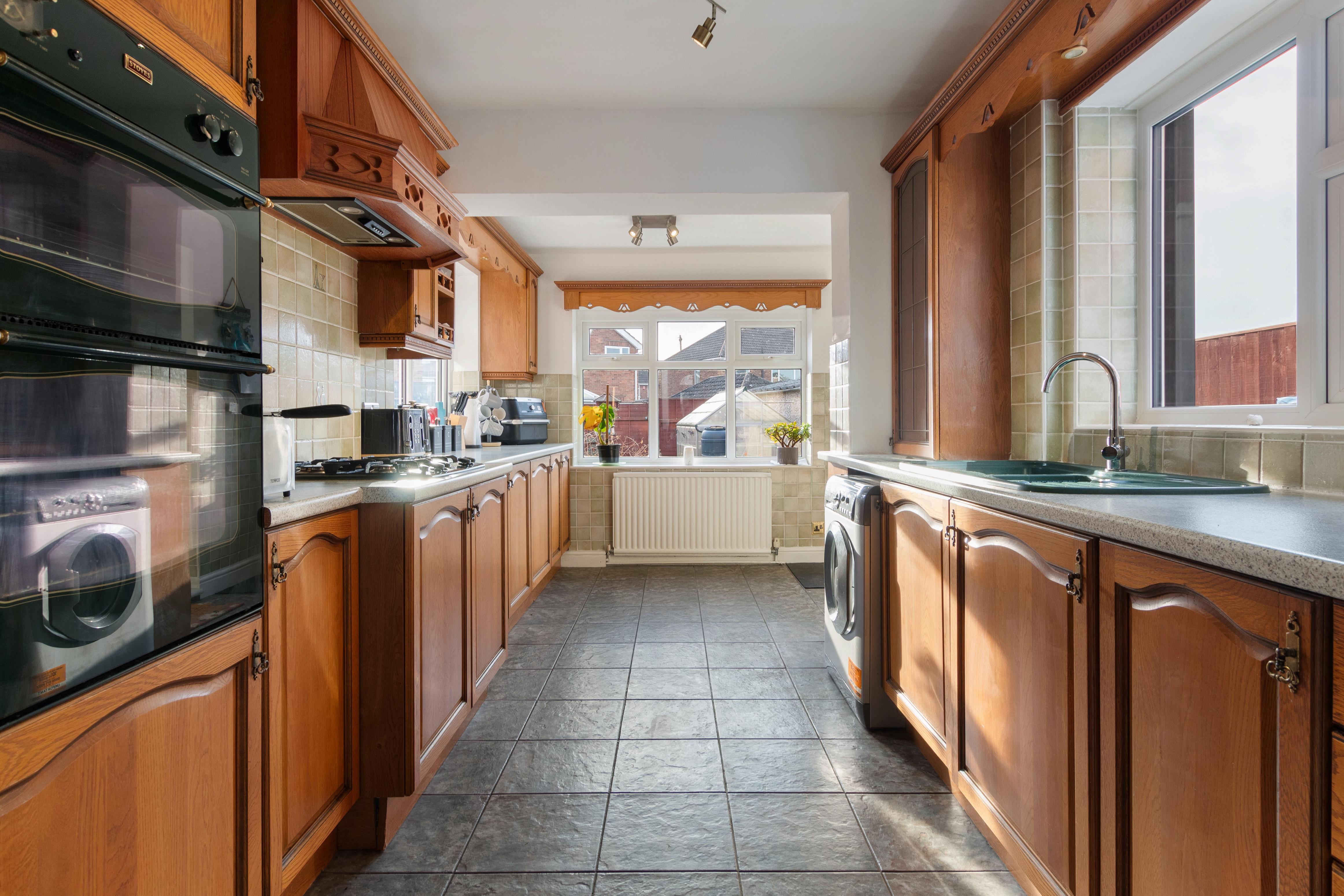 The galley kitchen, cleverly extended, showcases ample base and wall units, complemented by dual aspect windows that illuminate the space and provide a pleasant spot for a potential breakfast area. This functional kitchen is perfect for culinary enthusiasts and families alike.
