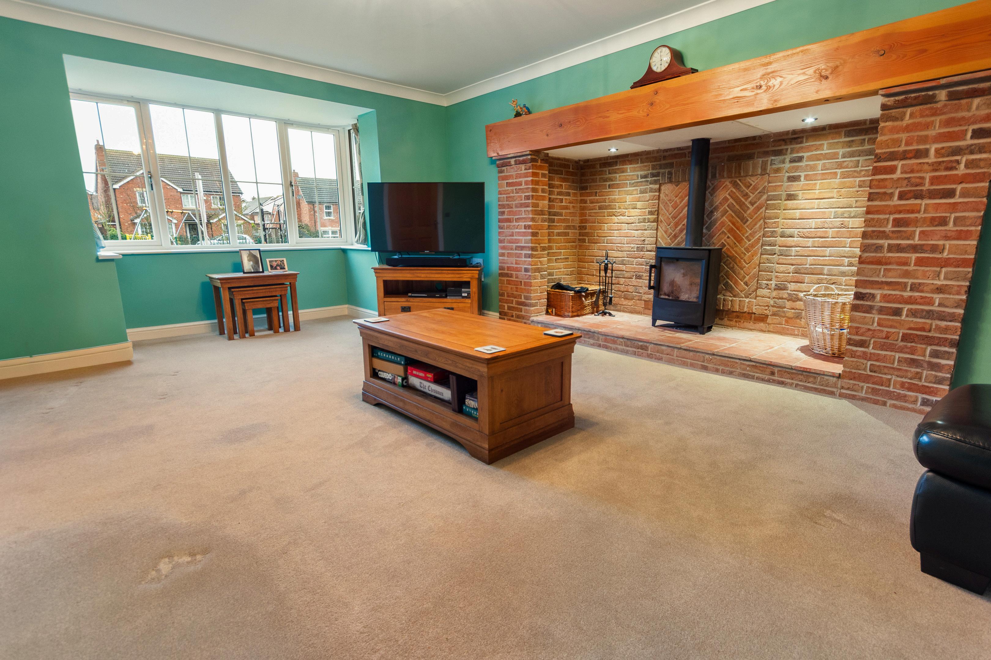 To the front, the sitting room is a comfortable second reception, ideal as a playroom, snug or quieter lounge, and it benefits from a bay window that draws in plenty of natural light. The main lounge is bigger again, offering a great family layout and a real focal point in the form of an exposed brick fireplace with a timber beam and inset log burner perfect for cosy evenings and winter weekends in.