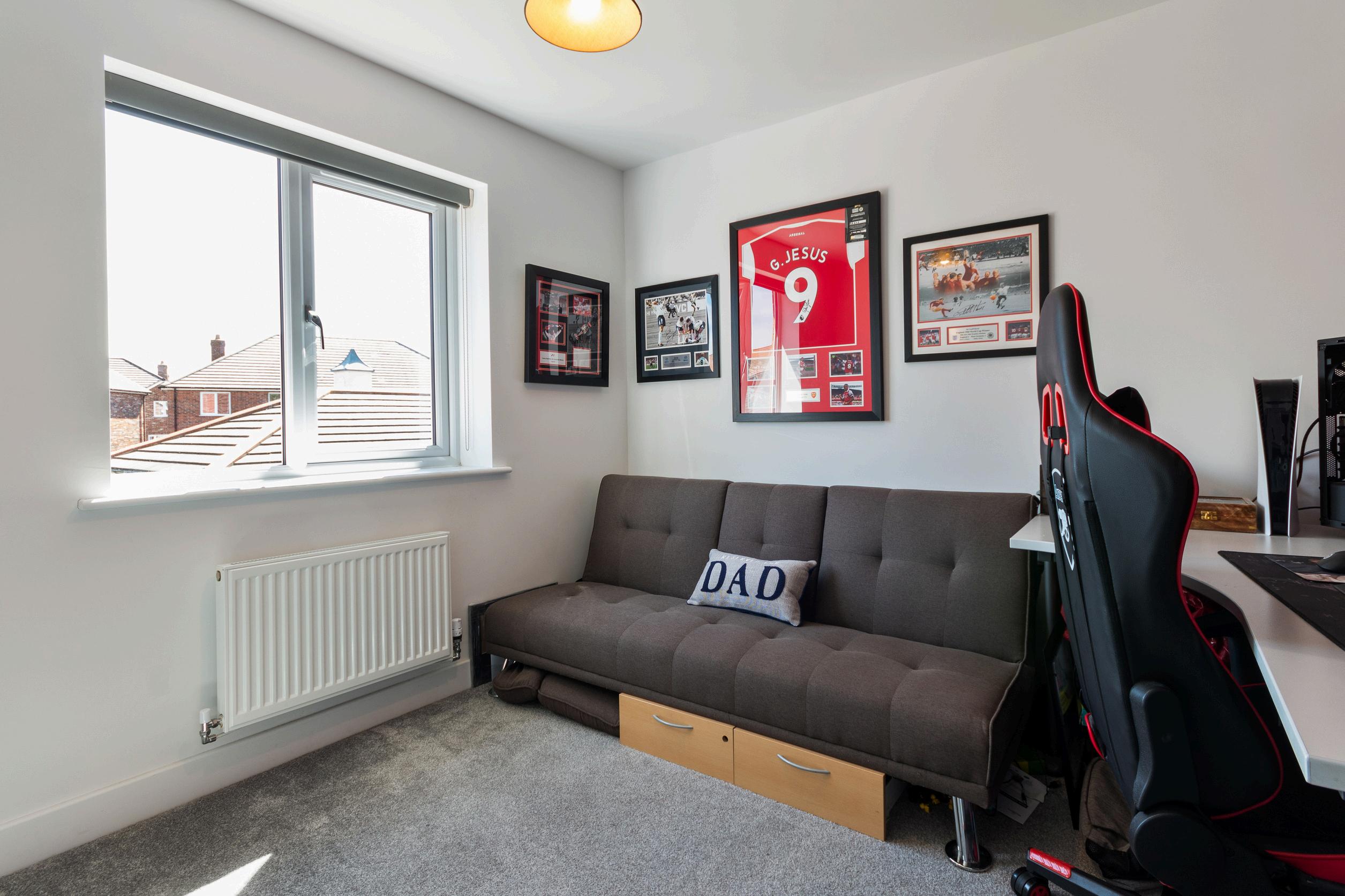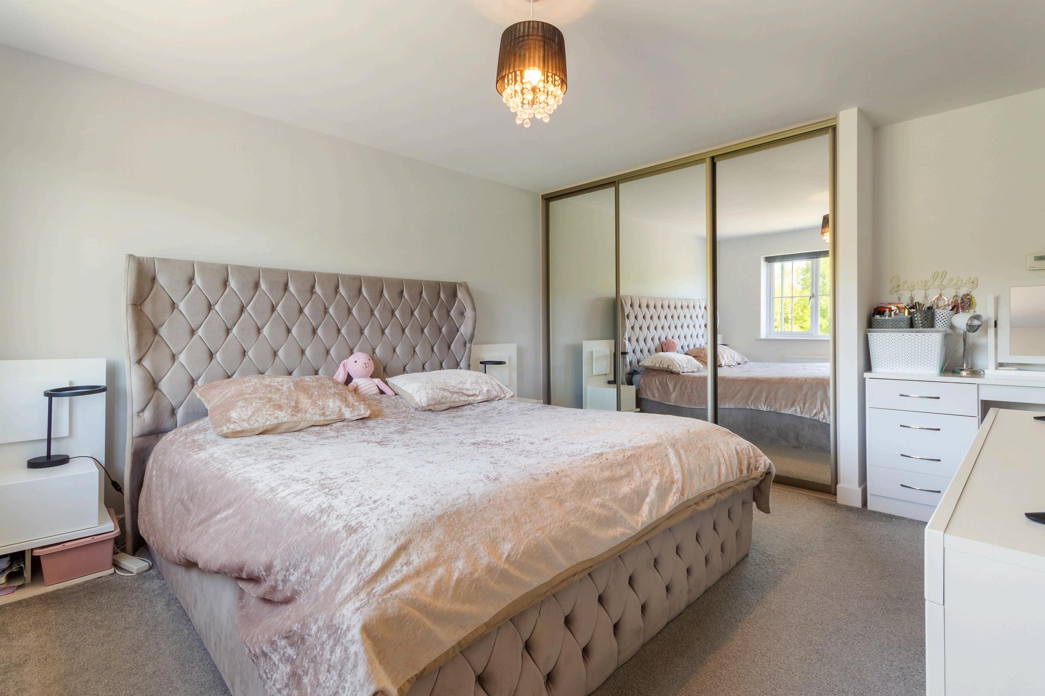 Upstairs, the high specification continues. The master bedroom benefits from built-in mirrored wardrobes and a sleek en-suite shower room. Bedrooms two, three, and four are all generously sized doubles, thoughtfully designed with storage alcoves. A modern family bathroom with a white suite and neutral tiling completes the first floor, alongside a handy storage cupboard on the landing.