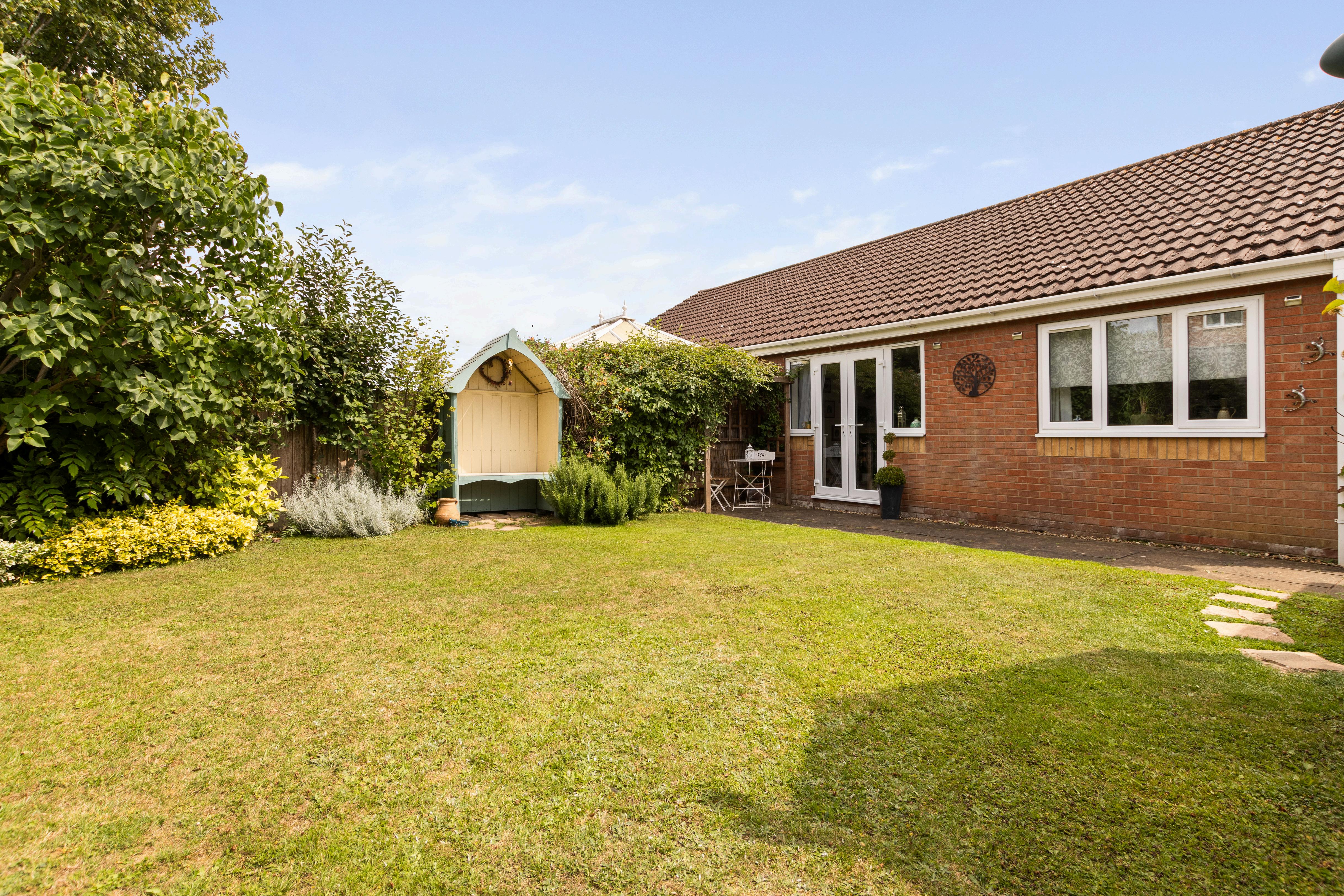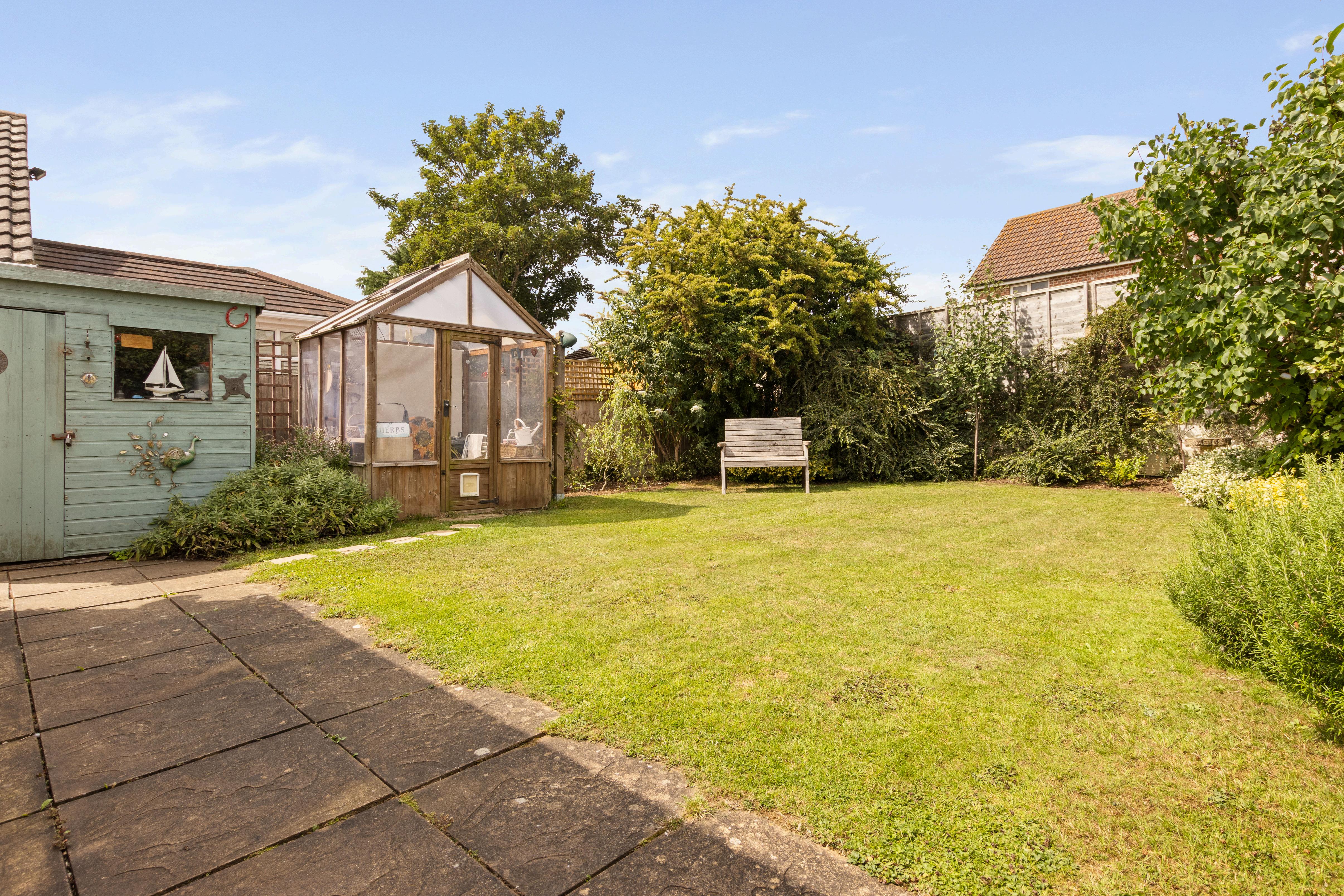 To the front, the property offers ample driveway parking alongside a neat lawn with mature planted borders. A gated side access leads to a low-maintenance side seating area, ideal for enjoying a morning coffee or evening drink. The rear garden is fully enclosed, featuring a well-kept lawn, two timber garden sheds, and a greenhouse, creating a private and manageable outdoor space.