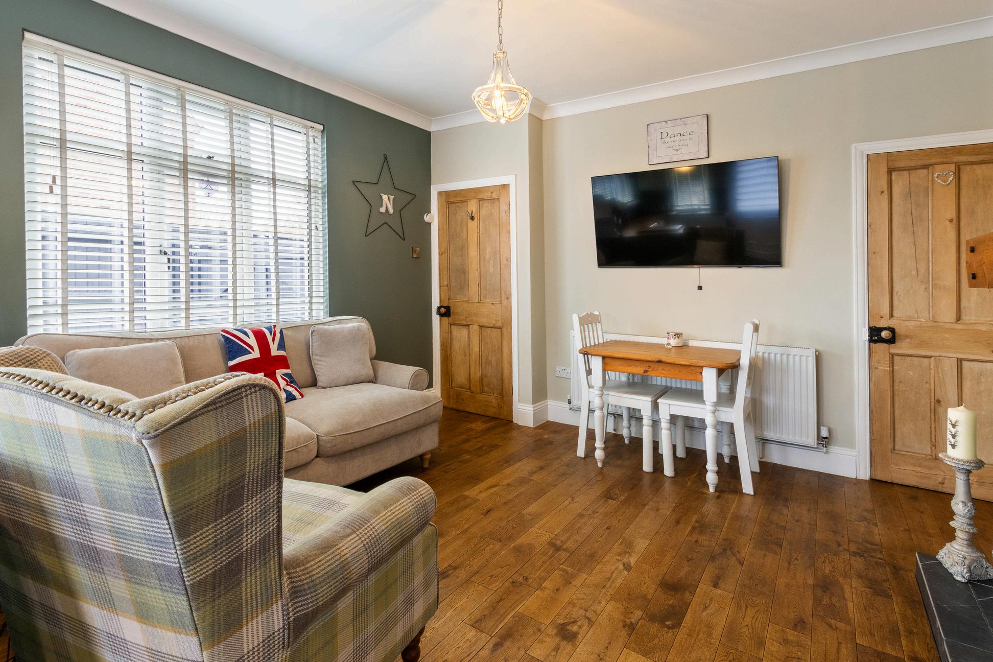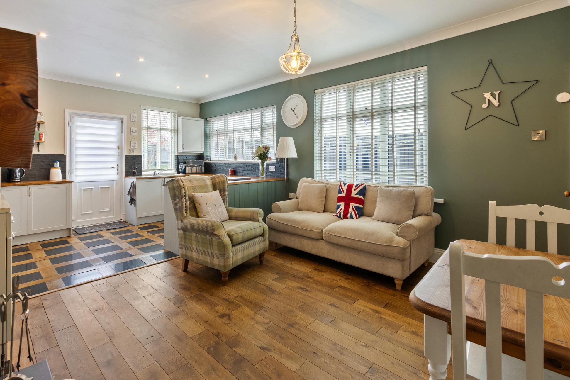This stunningly presented home is a credit to its current owners and must be viewed internally to fully appreciate the character features in this charming period home. You enter via aside entrance into the light hallway with stairs leading up in front to the first floor accommodation. To the front of the property there is a cosy living room with feature fireplace and large bay window flooding the room with light. This charming room is beautifully decorated. The fabulous sized farmhouse style dining kitchen lies to the rear of the property and boasts a feature log burning stove. This stunning room is undoubtably the heart of this home and was formally two rooms offering a wealth of living space. There is room for a dining table and chairs as well as a sofa and seating area making it great for entertaining. There is a large built in dresser style storage cupboard which flanks the feature fireplace to one side as well as a large understairs storage cupboard/pantry. The open plan kitchen has a wealth of fitted cupboard and feature wooden worktops adding to the cottage style charm of this room. There is also an integrated oven and hob. This room is flooded with natural light with windows to both side and rear and a rear door gives access onto the charming gardens making it an ideal room to entertain in during the summer months.