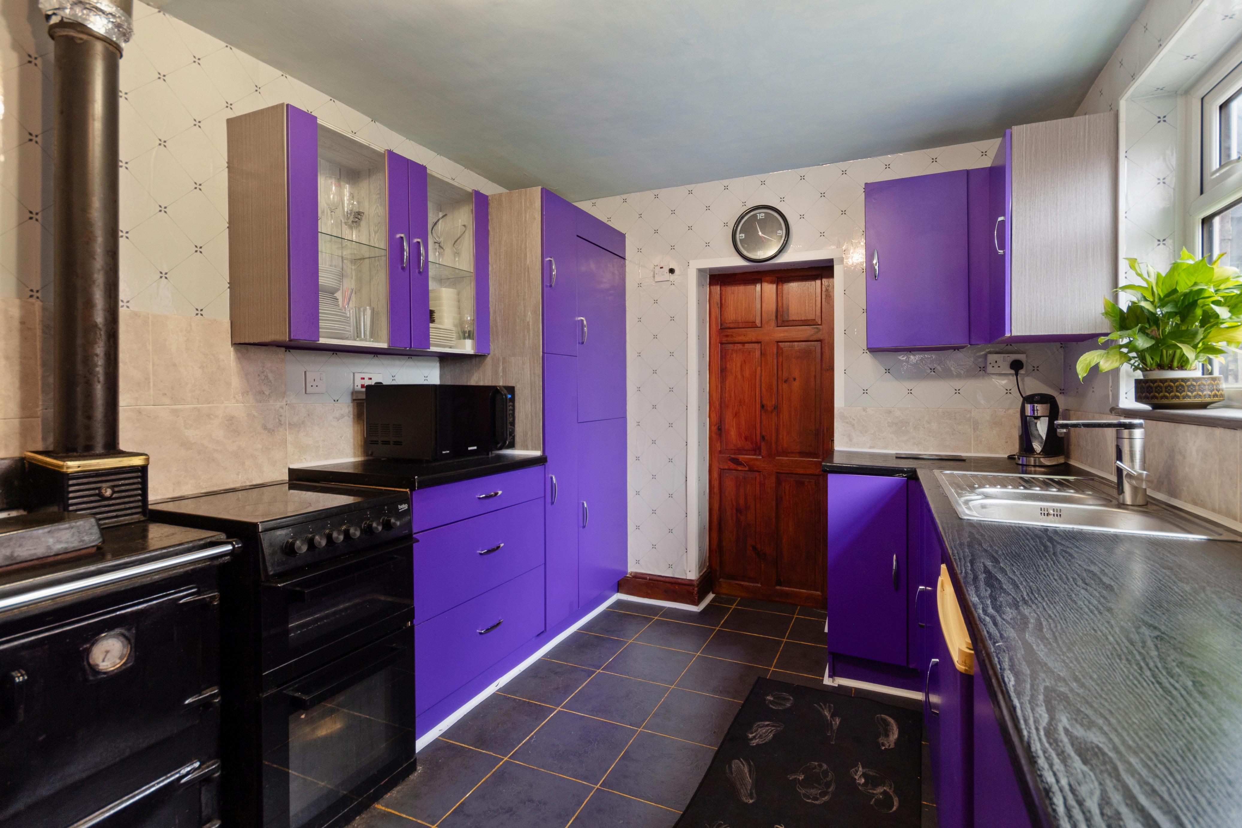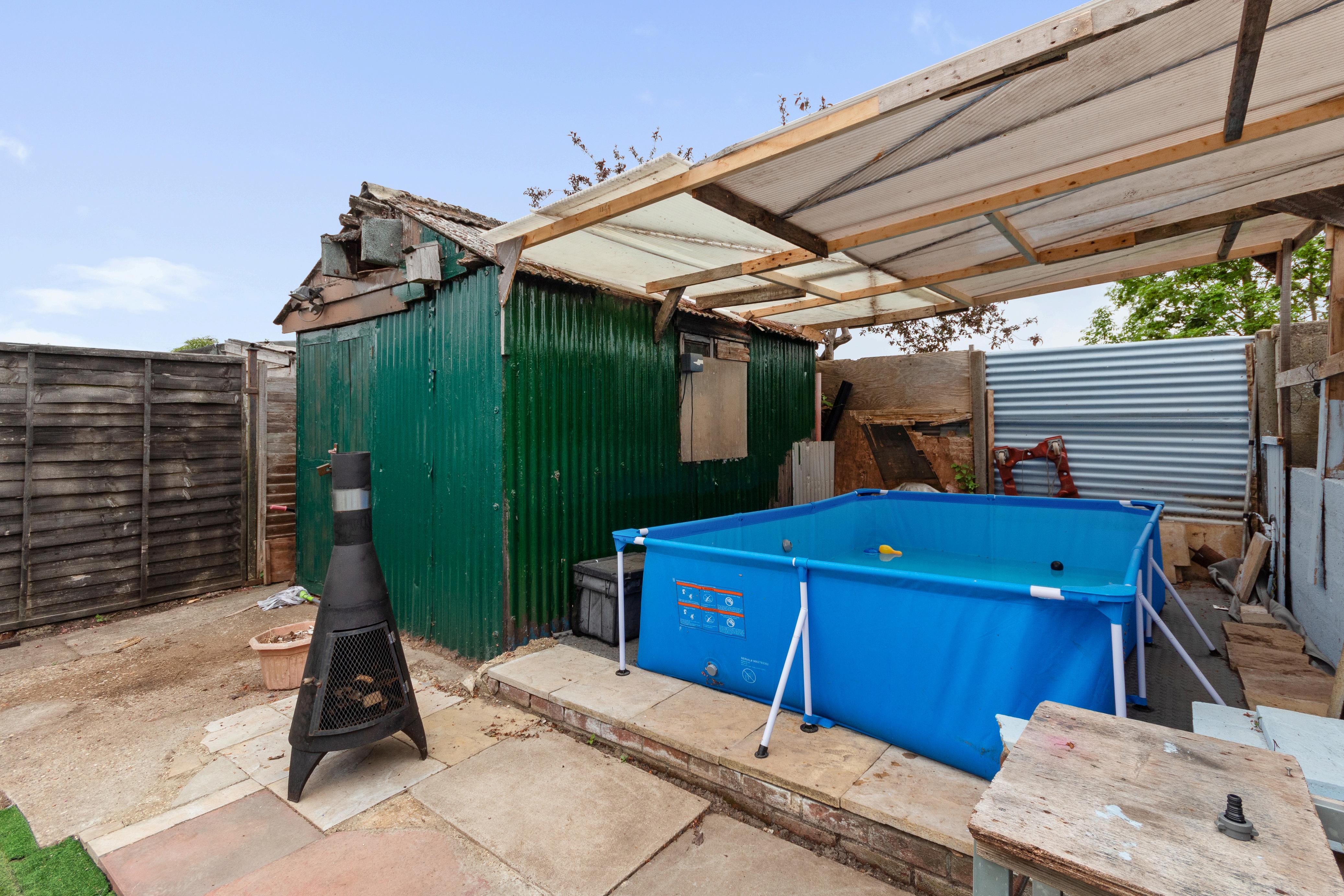 To the front, the property benefits from a quaint brick and picket-fence garden. The rear garden is fully enclosed and laid out with a variety of outbuildings, including storage sheds one of which is currently used as a home bar, and workshop space, making it ideal outdoor entertaining. Beyond the boundary, uninterrupted views stretch over open playing fields, providing a tranquil and green backdrop.