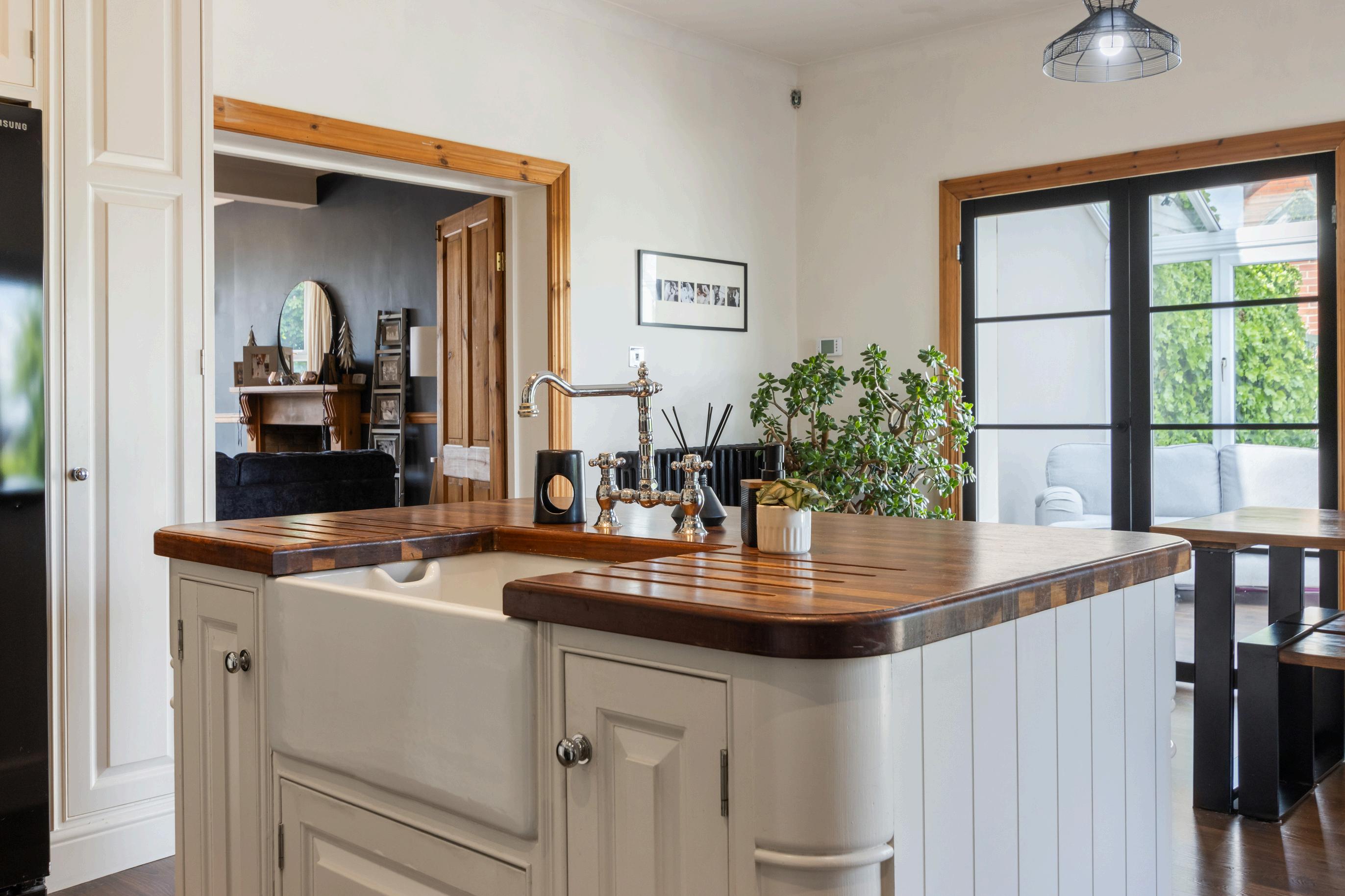 Double doors from the lounge open into the heart of the home: the modern kitchen diner. Here, a central island stands as the focal point, surrounded by sleek countertops. Double doors lead seamlessly to the patio area, perfect for outdoor dining, while additional doors connect to the bright conservatory. Both spaces enjoy the luxury of underfloor heating, extending a warm welcome year-round.