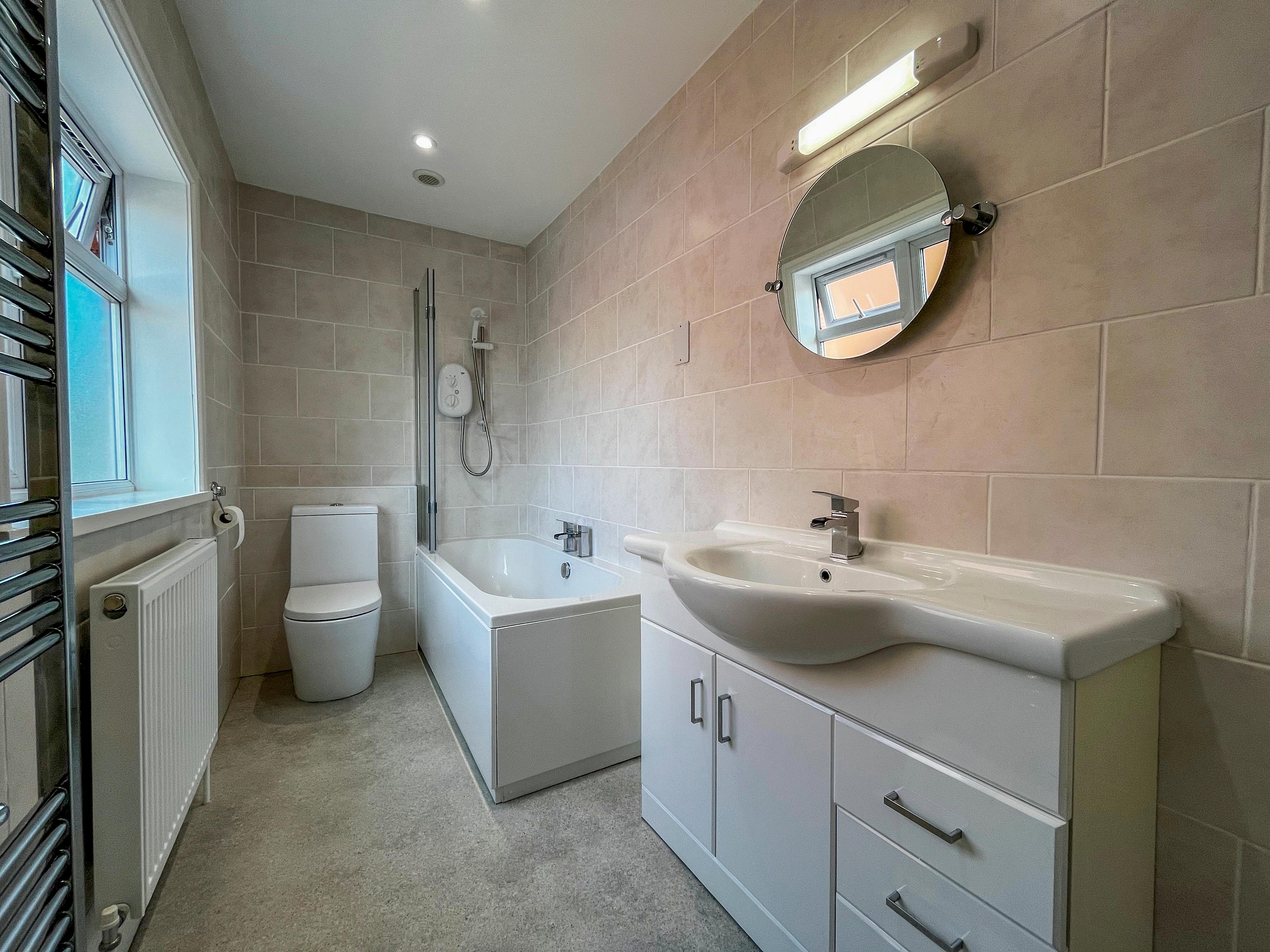 Upstairs, you will find two generously sized double bedrooms, each thoughtfully designed to offer comfort and style. The modern bathroom is fitted with high-quality fixtures, including a side panel bath with a waterfall mixer tap, a heated towel rail, a hand wash basin, and a W.C. The second bedroom features a traditional cast iron fireplace, adding to the property's period charm and appeal.