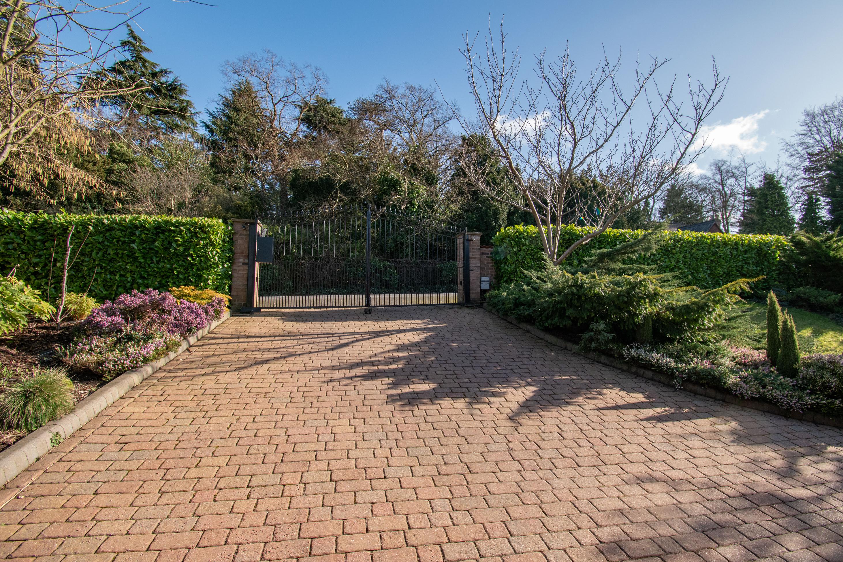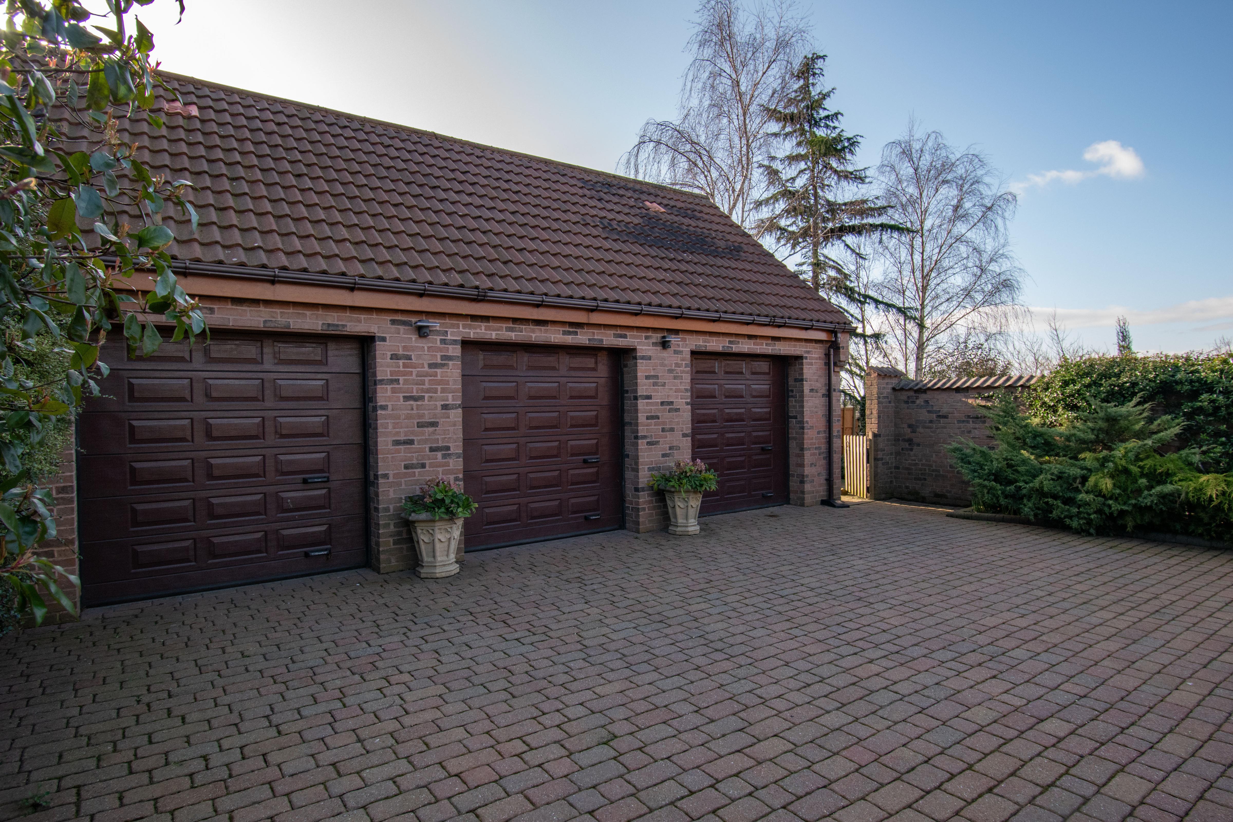 A gated entrance opens to a broad sloping block paved drive, sweeping to the front of the property and accessing a parking area to the detached triple garage. The garage has three electrically operated up and over garage doors. Two of the doors open into a double garaging space with power and light and a bordered-out storage space to the first floor with window to the side. A connecting door opens into the third single garage space which is currently used as a workshop with power, lights, tiled flooring with window to the side and personnel door.
