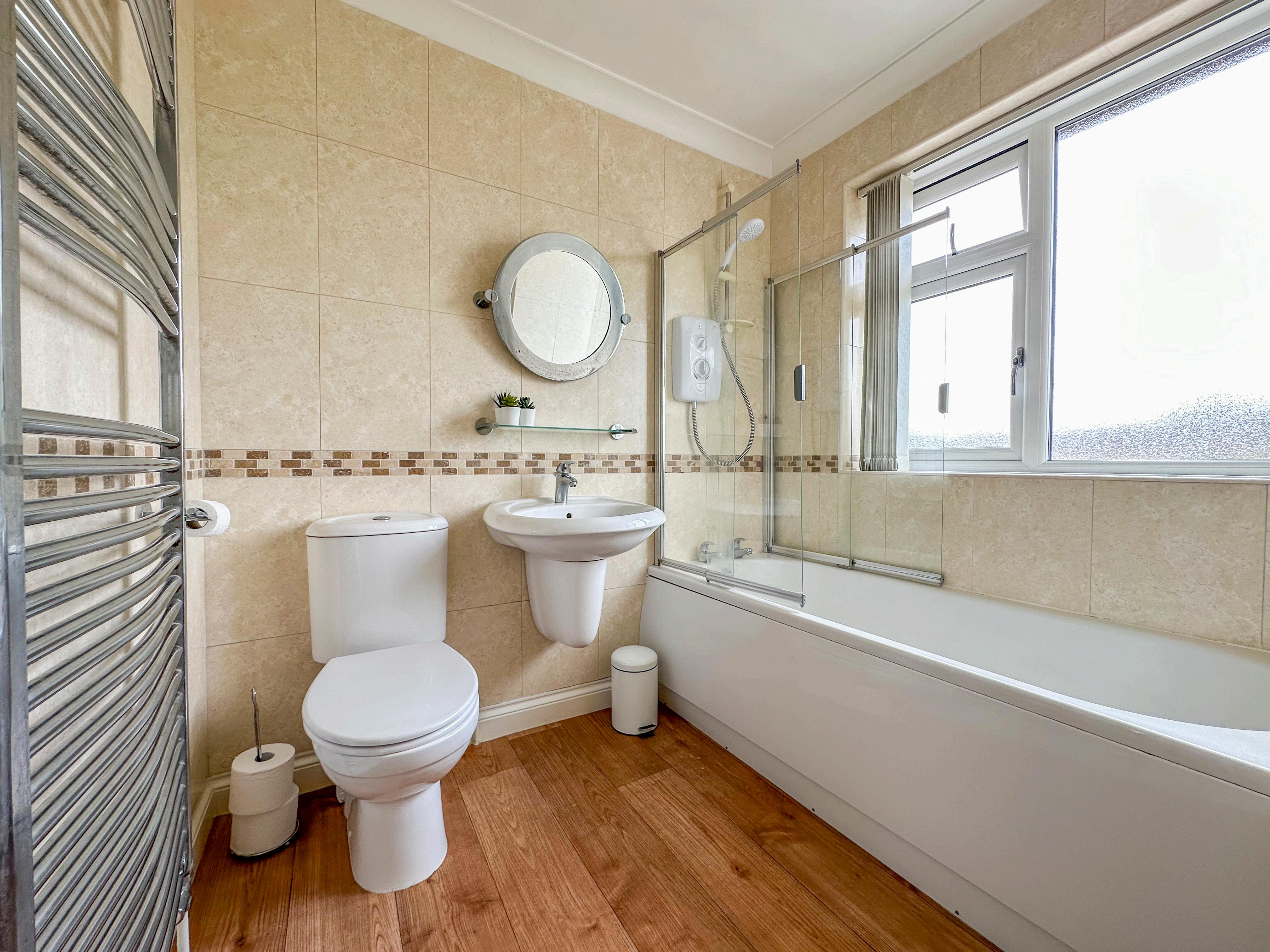 The first floor features a front-facing master bedroom, offering a tranquil retreat. An additional double bedroom overlooks the rear garden, and a further front aspect single bedroom, currently utilized as a home office by the current owner, completes the sleeping accommodation. All bedrooms are served by a stylish three-piece bathroom, featuring a bath with a shower above, a vanity hand wash basin, a W.C., and a chrome towel radiator.