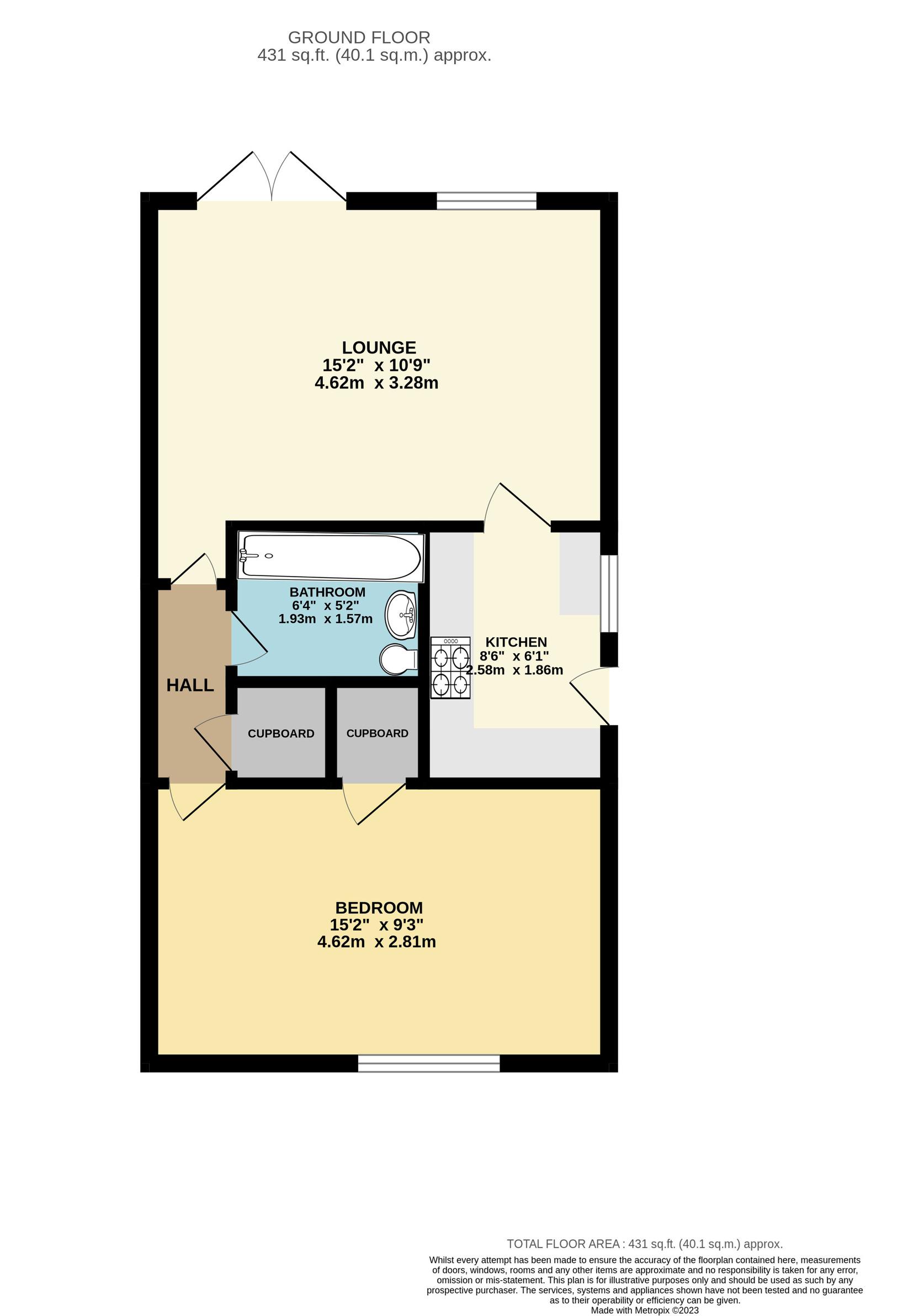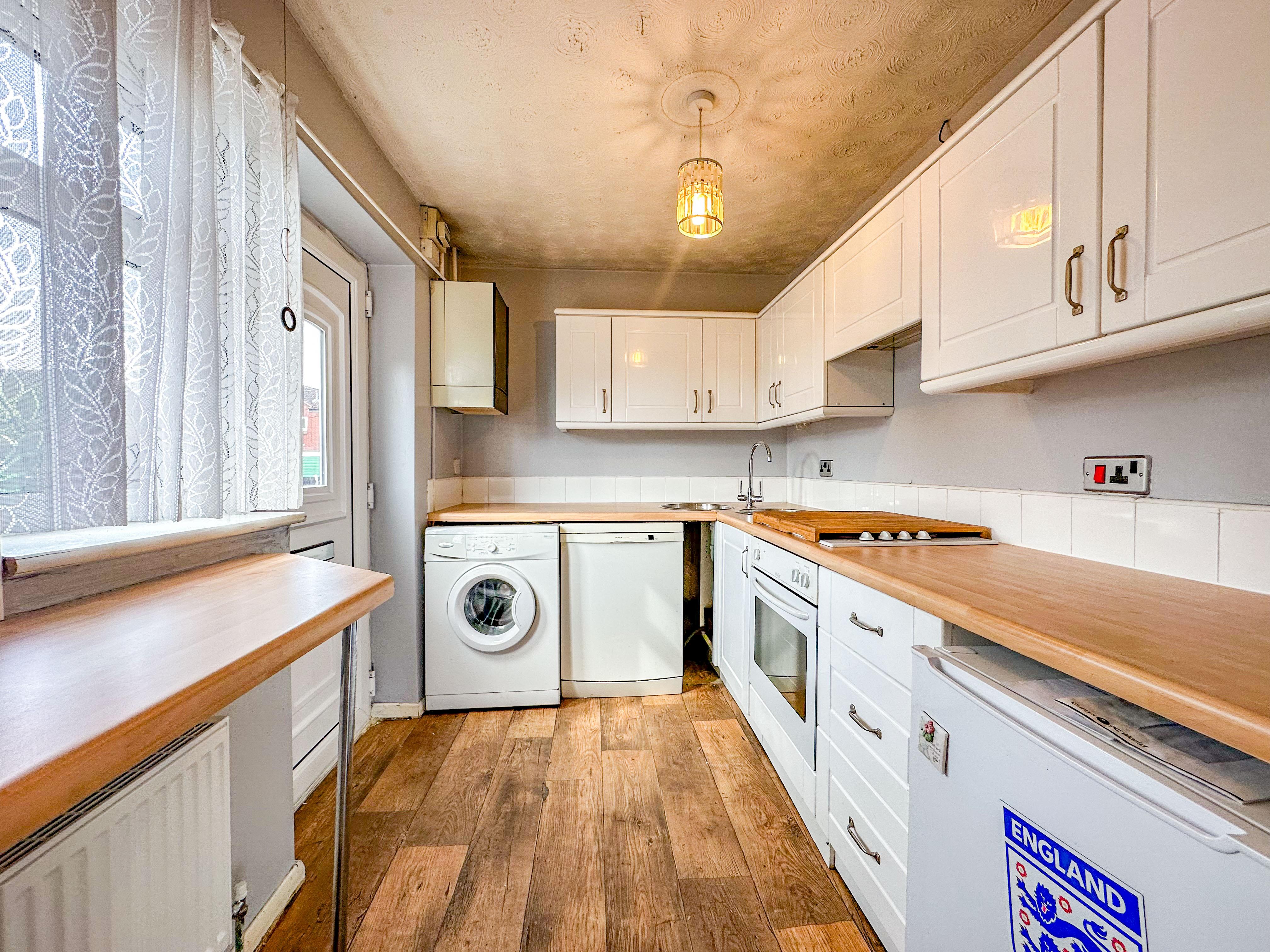 An entrance door opens into the light and airy fitted kitchen that has a built-in oven and hob and leads into the generous lounge that benefits from French doors allowing access into the rear courtyard garden. Leading from the hallway is the front aspect double bedroom with a handy storage cupboard and the central bathroom that has a white three-piece suite comprising a bath with overhead shower connected to the taps, a hand wash basin and W.C.