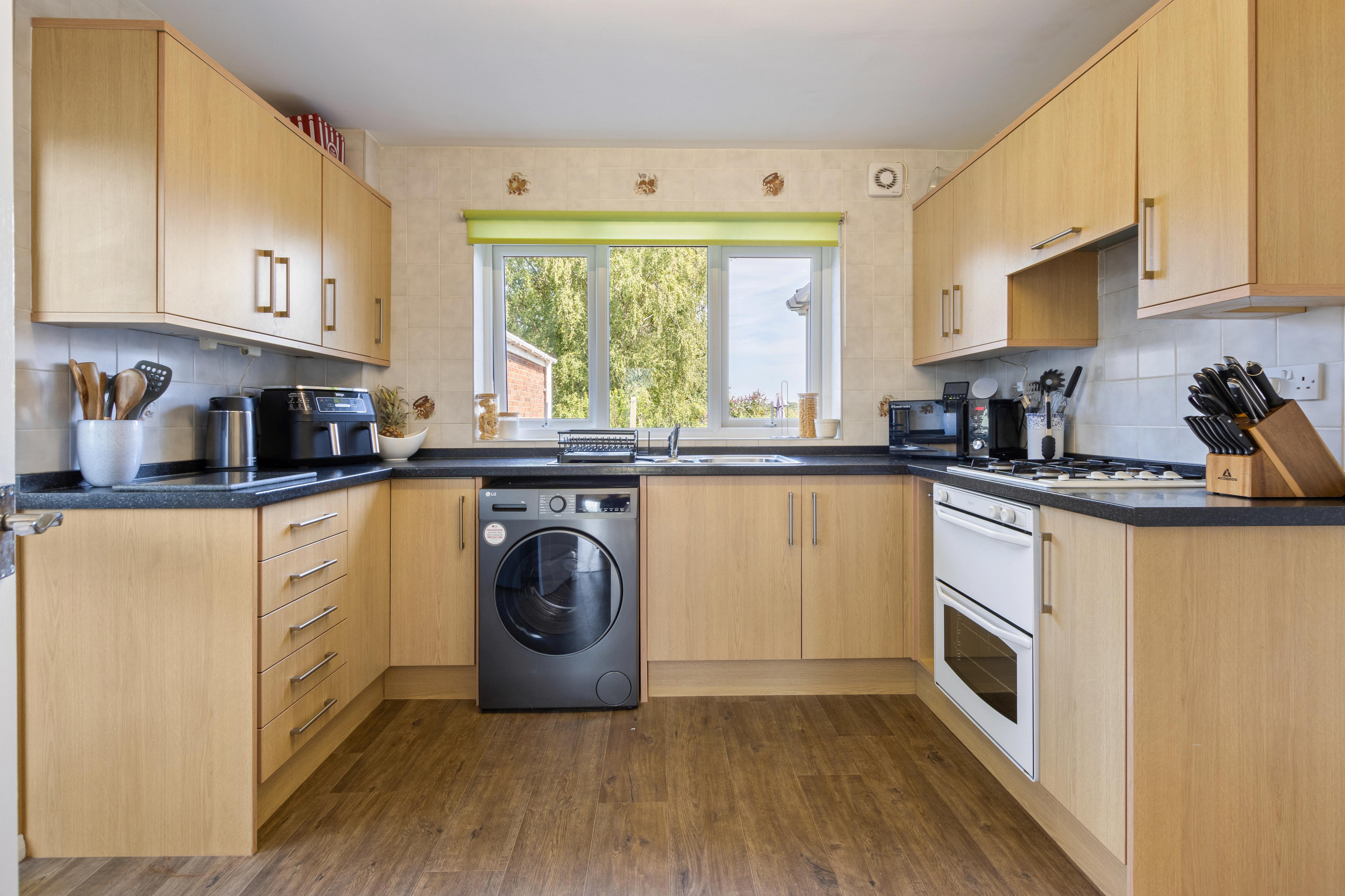 A welcoming entrance hallway sets the tone, providing access to the main living areas and benefits from a useful understairs storage cupboard, a staircase leading to the first floor with a newly installed carpet. To the front of the home sits a bright and spacious lounge, perfect for relaxing and entertaining, with a large window drawing in natural light and herringbone flooring. The kitchen is well laid out with ample worktop and features a range of base and wall-mounted cabinets, a built-in oven and gas hob, and room for further appliances. A rear door leads conveniently to the garden, perfect for outdoor dining and entertaining. Leading off the kitchen is the adjoining dining room that offers a dedicated space for family meals and gatherings, flowing beautifully into a delightful conservatory that overlooks the garden – ideal for enjoying year-round sunshine or transforming into a flexible second sitting area or playroom.