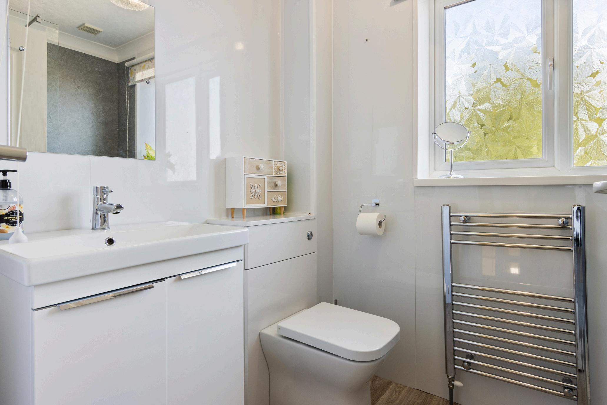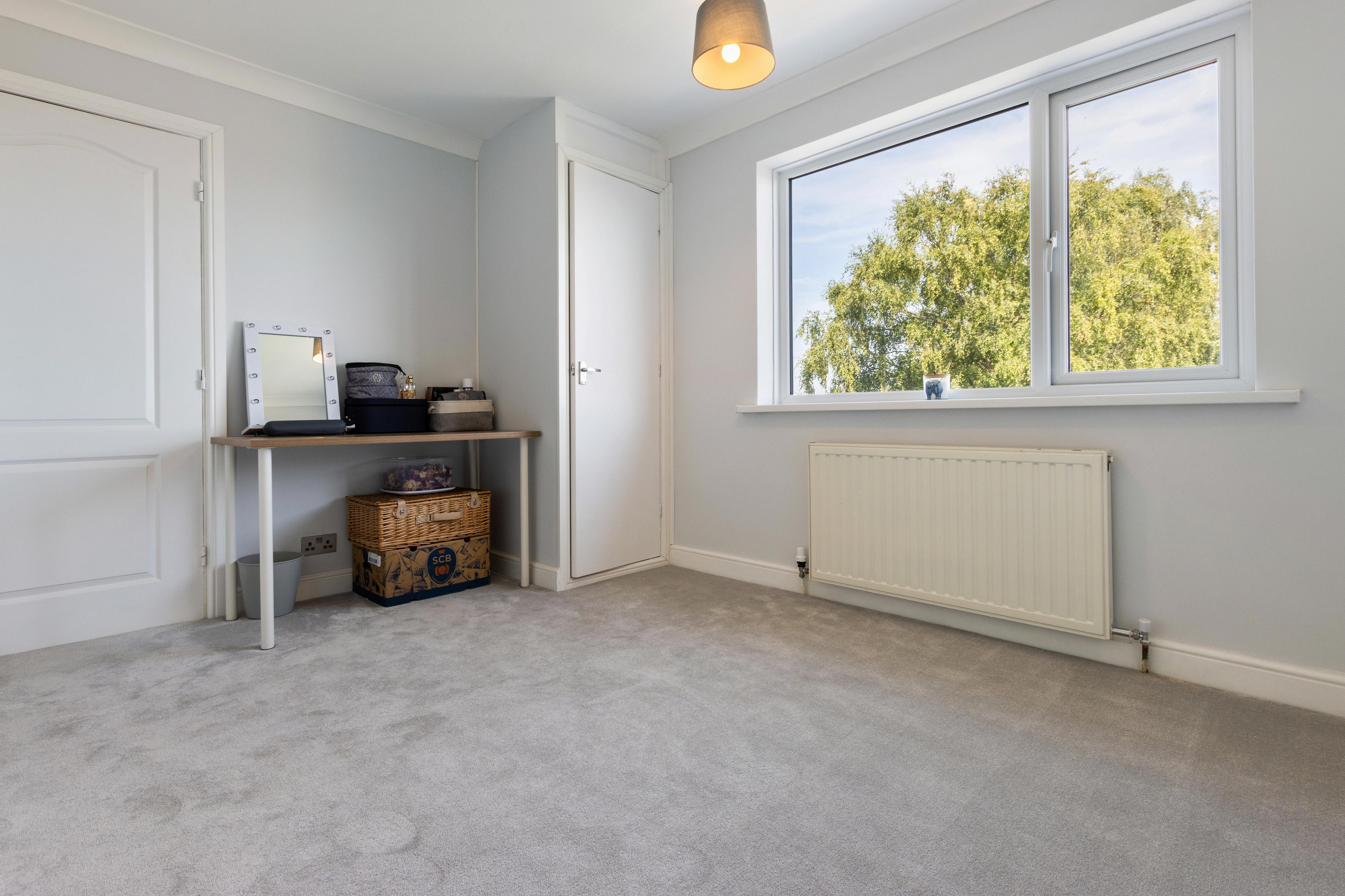 Upstairs, the landing gives access to three bedrooms – two generous doubles and a comfortable single. The principal bedroom is located at the front of the property and benefits from a built-in wardrobe and drawers. Bedroom two overlooks the garden and features a handy storage cupboard, while bedroom three is an ideal child’s room and is currently utilised as a home office by the current owners. The stylish shower room is fitted with a modern suite including a walk-in shower, a vanity handwash basin and a low-level flush W.C.