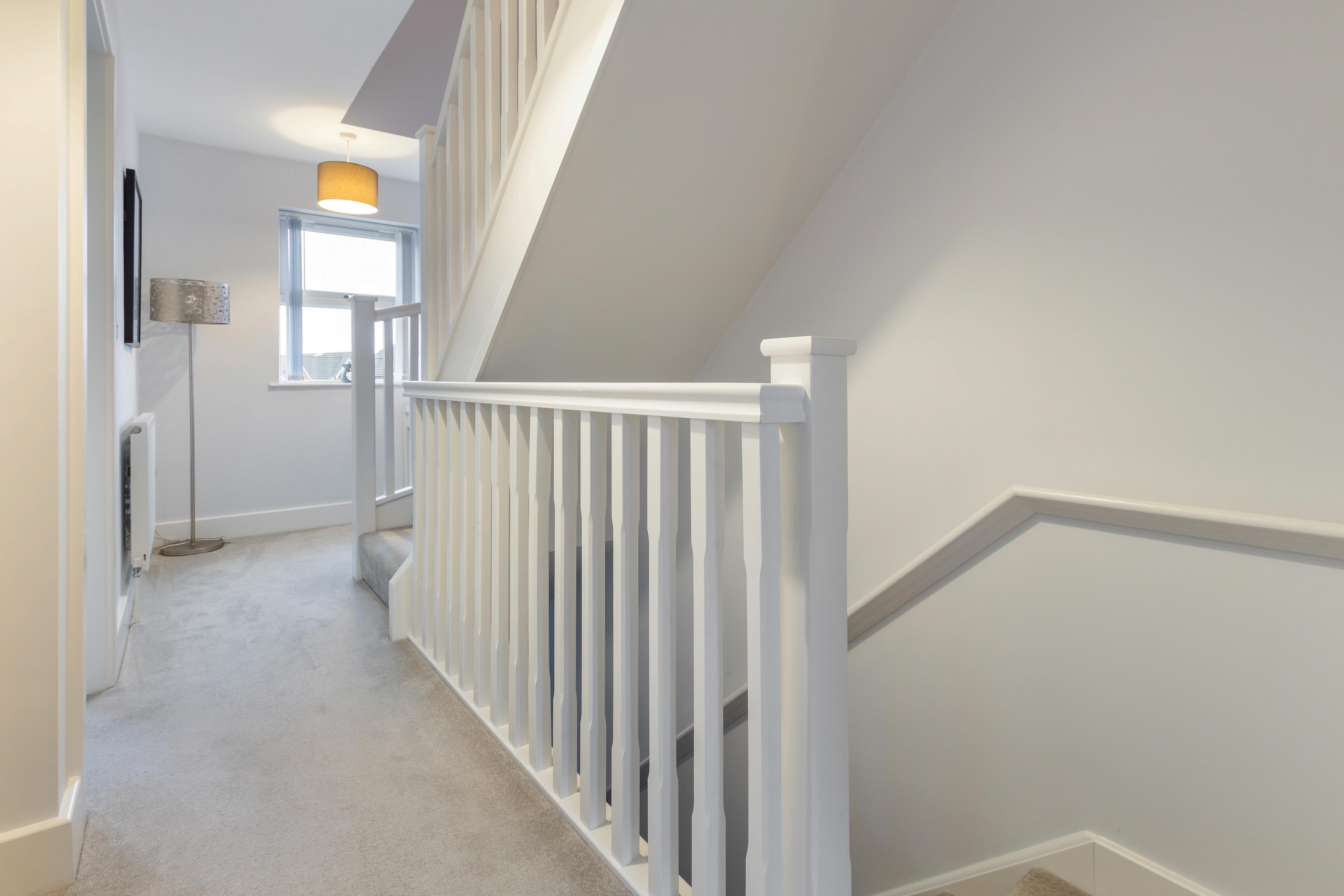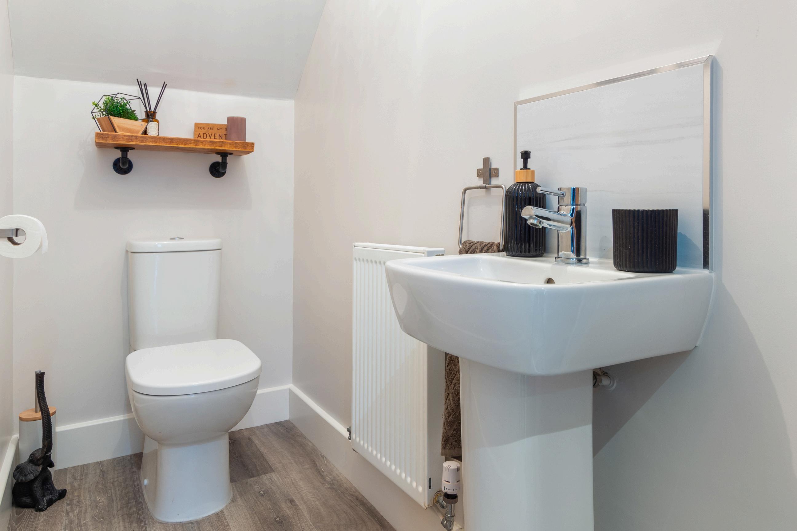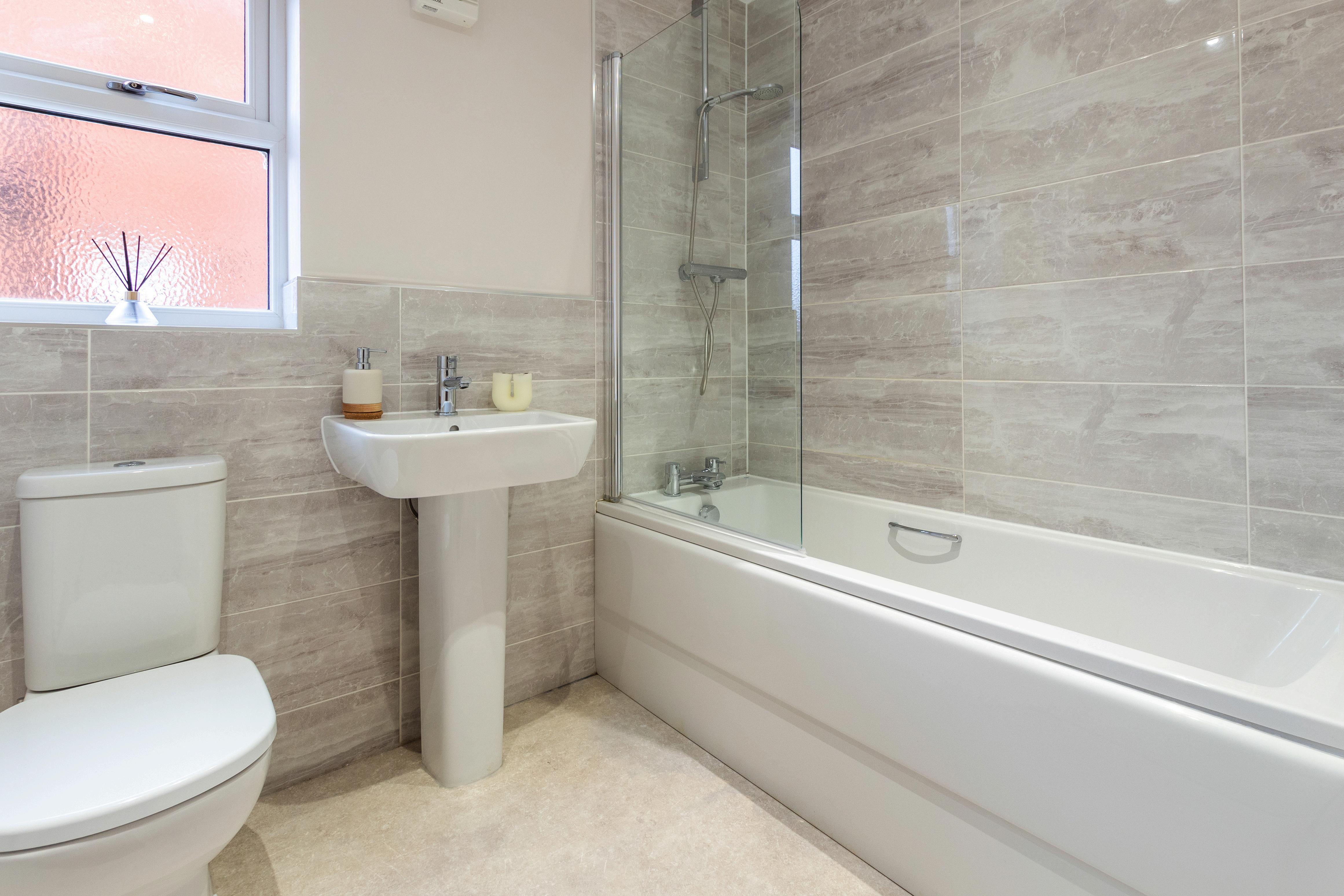 Ascending to the first floor, the landing leads to two well-proportioned bedrooms. Bedroom two is a spacious retreat, and bedroom three is ideal for children, guests, or a home office to suit modern living needs. Serving these rooms is a stylish family bathroom, featuring a bath with an overhead shower, a sleek hand wash basin, and a low-level flush WC, all designed to complement the home's contemporary feel.