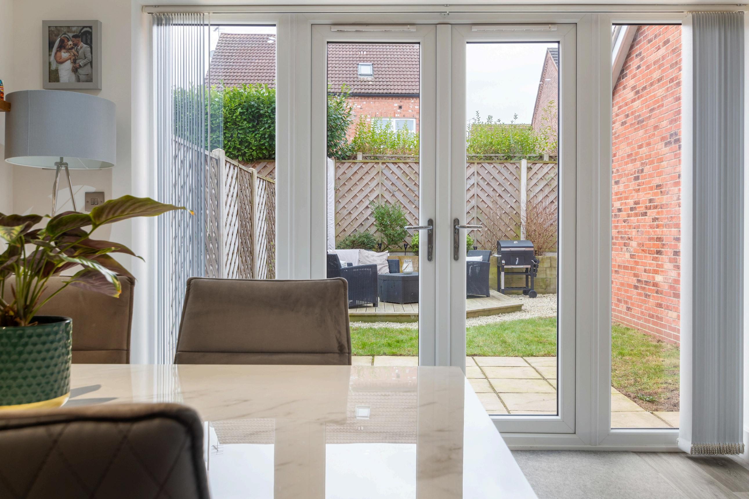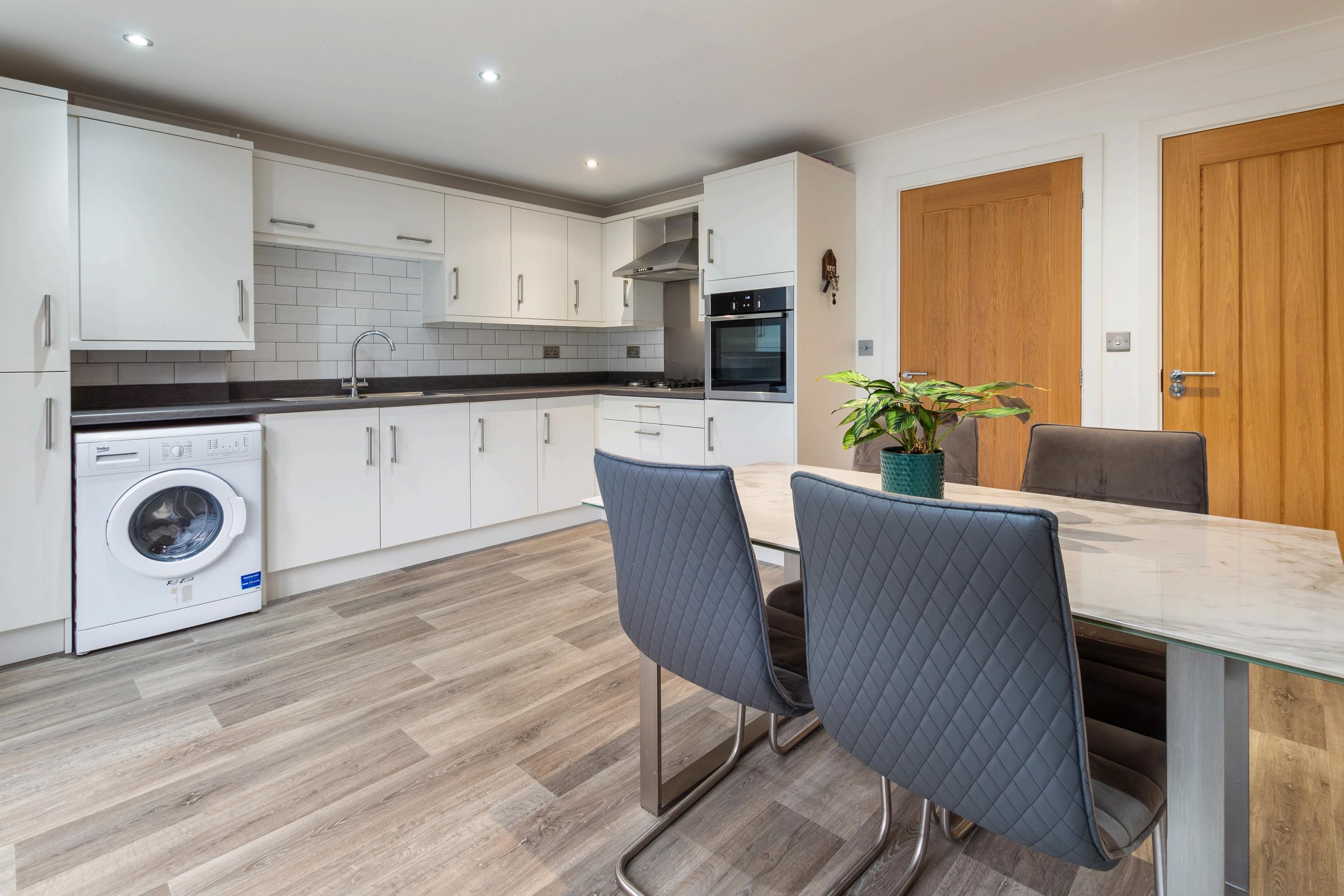 Upon entering, you are welcomed into a bright and inviting entrance hall, where stairs lead to the first floor. The hallway flows effortlessly into the spacious lounge, a perfect setting for relaxation or entertaining guests. Large windows flood the room with natural light, enhancing the warm and airy atmosphere. To the rear, the open-plan kitchen and dining area form the heart of the home. The well-appointed kitchen boasts integrated appliances, ample storage, and generous workspace, catering to both everyday living and entertaining. Double doors open directly onto the rear garden, creating a seamless indoor-outdoor connection ideal for alfresco dining or social gatherings. A conveniently located downstairs WC adds further practicality to this thoughtfully designed space.