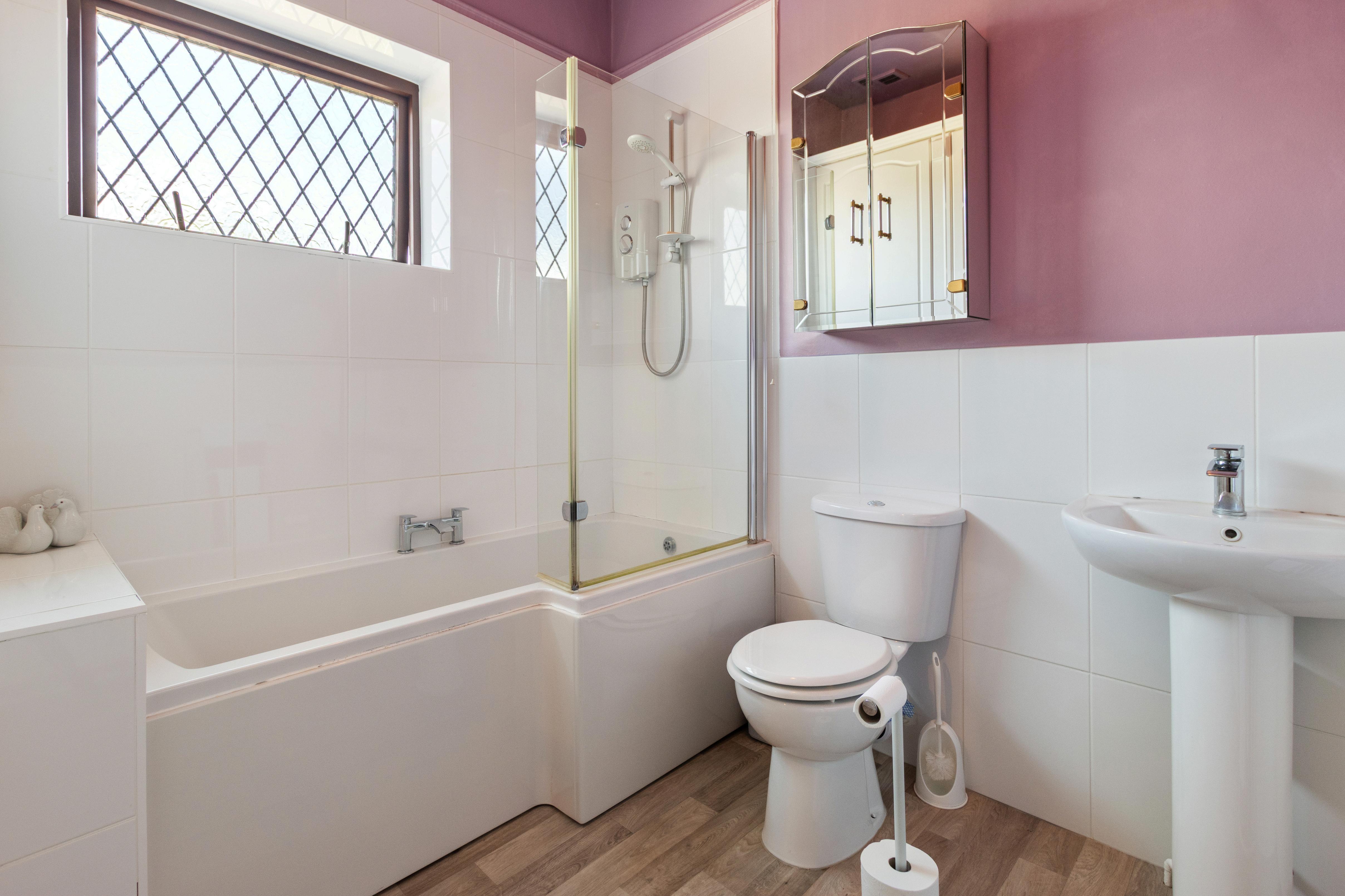 Three generously sized double bedrooms provide comfortable accommodation. The principal bedroom benefits from a walk-in wardrobe, while the remaining two enjoy fitted wardrobes. A stylish family bathroom completes the first floor, featuring a bath with overhead shower, WC, and vanity storage.