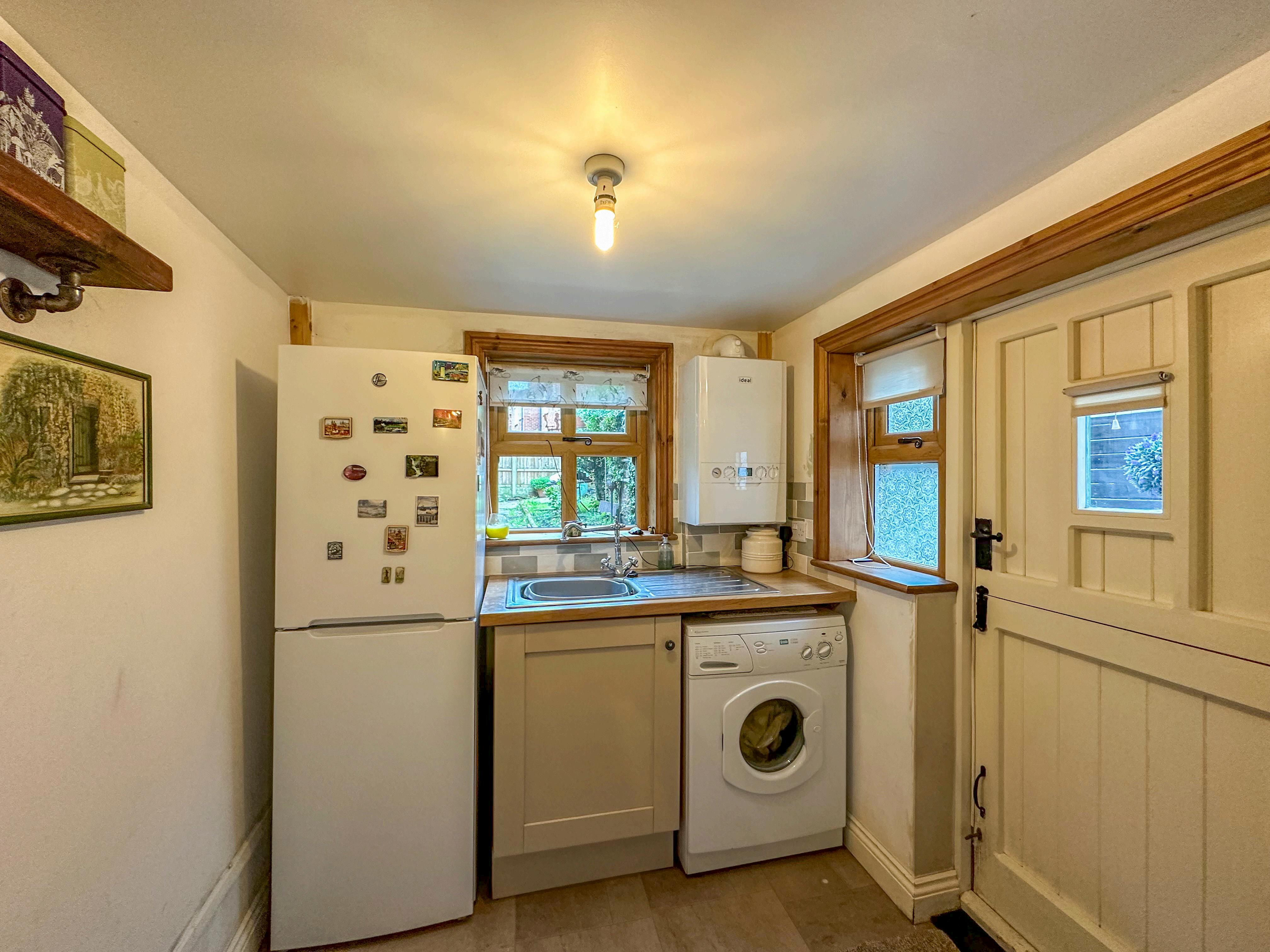 Stepping inside this delightful home you are greeted by a welcoming entrance hallway with access into the enviable lounge that boasts a sash window and a tiled feature fireplace with a log burning stove with a wooden mantle above. Leading from the living room is a charming kitchen that seamlessly blends modern touches with timeless elegance with a Shaker style fitted kitchen that enjoys a Belfast sink, a five-ring gas burning stove, exposed wooden beams add a touch of rustic charm and a handy pantry that provides additional storage space for everyday items and is complimented with cabinets to match the kitchen. Off the central hallway is a handy utility room that provides a designated space for laundry appliances and the boiler. A stable door leads out to the rear garden, creating a convenient connection between your indoor and outdoor living areas.