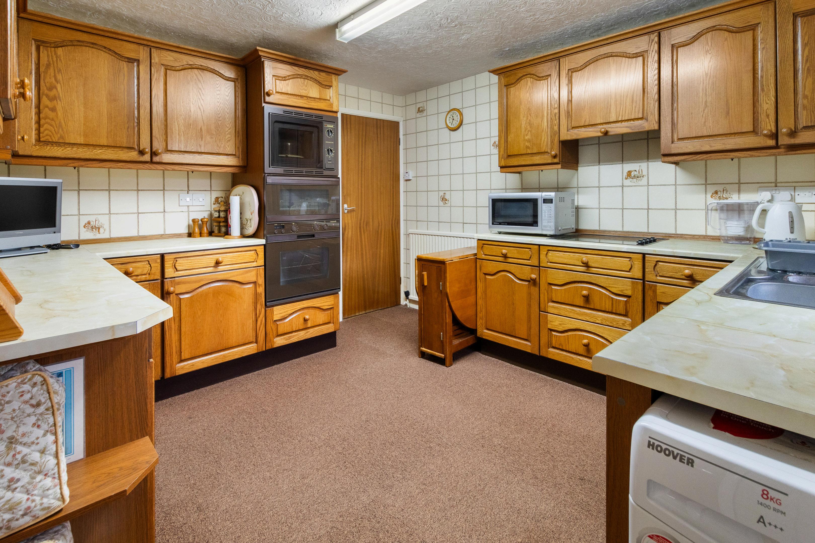 To the rear sits the kitchen, fitted with a wide range of timber-fronted units and complementary worktops, with tiled splashbacks and integrated double oven. There’s good practical workspace here, along with room for the usual appliances, and it connects naturally into the sun room. This additional reception space is a real bonus, with a cosy feel thanks to the timber-lined ceiling, and sliding patio doors opening directly to the garden, ideal as a morning room, hobby space or simply somewhere to sit and enjoy the outlook.