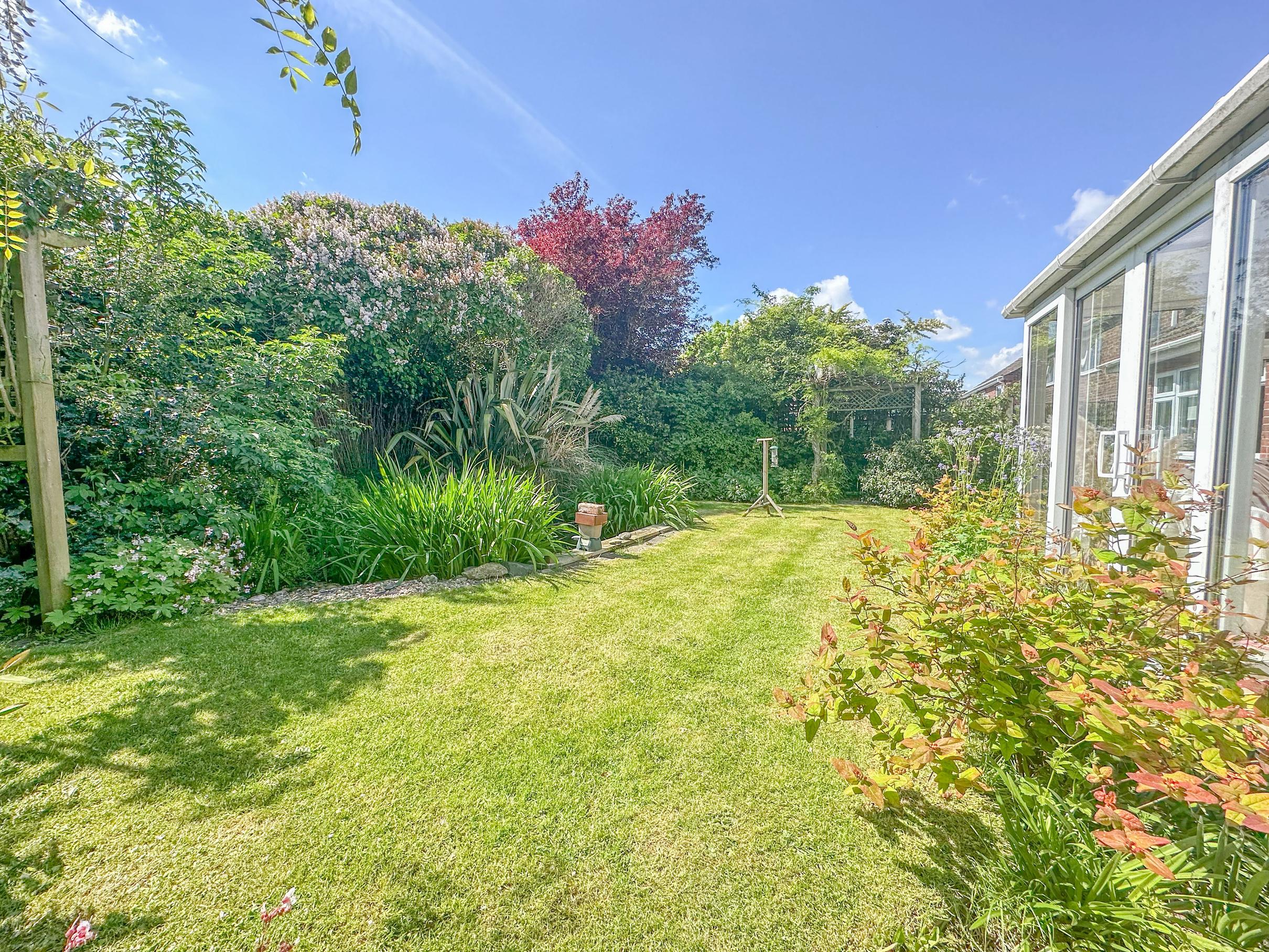 Outside. The front of the property is presented with a driveway and parking for several vehicles to the front of a single garage. There is a lawned area surrounded by hedges and access to the rear. The rear garden is enclosed on 3 sides by panel fencing with mature shrub and flower beds.