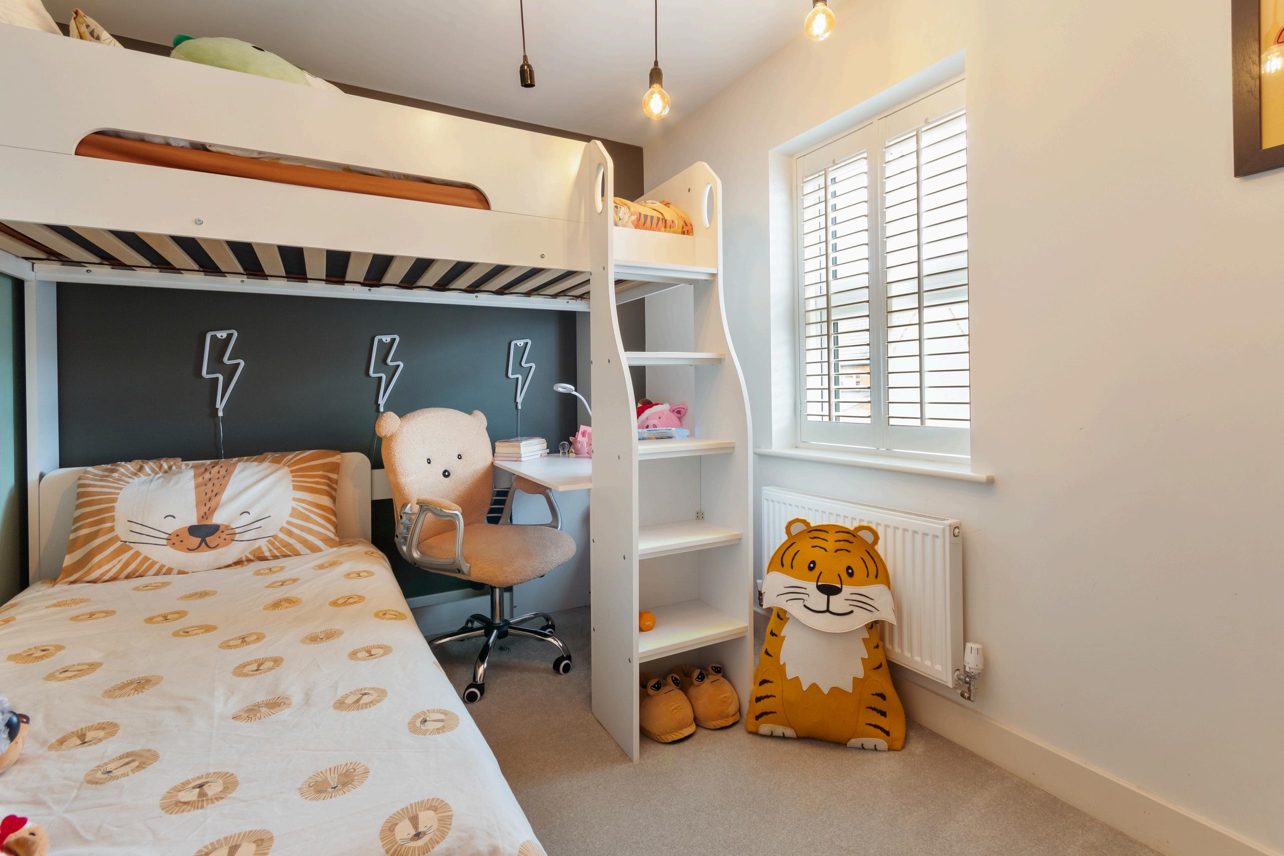 Upstairs, a graceful return staircase leads to four generously sized bedrooms, all beautifully presented and ideal for family life. The principal bedroom features a full wall of fitted mirrored wardrobes and enjoys a sleek en-suite shower room with contemporary tiling, a large walk-in cubicle, and a towel radiator. The second bedroom also offers built-in storage, while bedrooms three and four provide further flexibility for guests, children, or workspace as needed. A stylish family bathroom completes the upper floor, finished with part-tiled walls, a modern suite, and shower-over-bath for convenience.