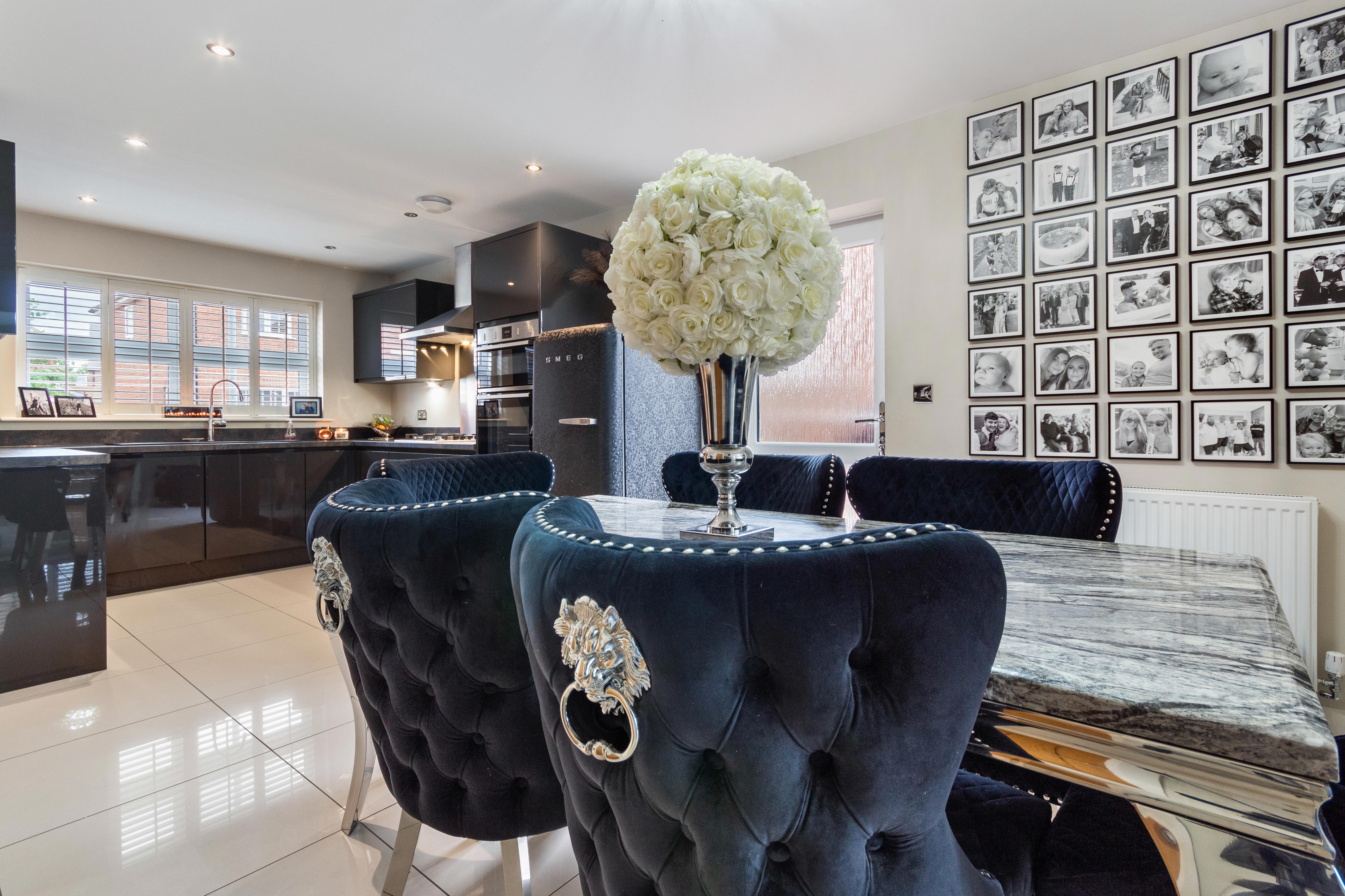 The heart of the home is undoubtedly the open-plan kitchen-diner, a showstopping space designed for modern living. Finished with high-gloss cabinetry, contrasting worktops, and a host of integrated Neff appliances including a gas hob, double oven, extractor and dishwasher it's as functional as it is stylish. A resin sink with flexi-tap, sleek upstands, and space for a large dining table complete the look. An adjoining utility room continues the seamless design, with matching cabinetry, additional storage, and space for laundry appliances.