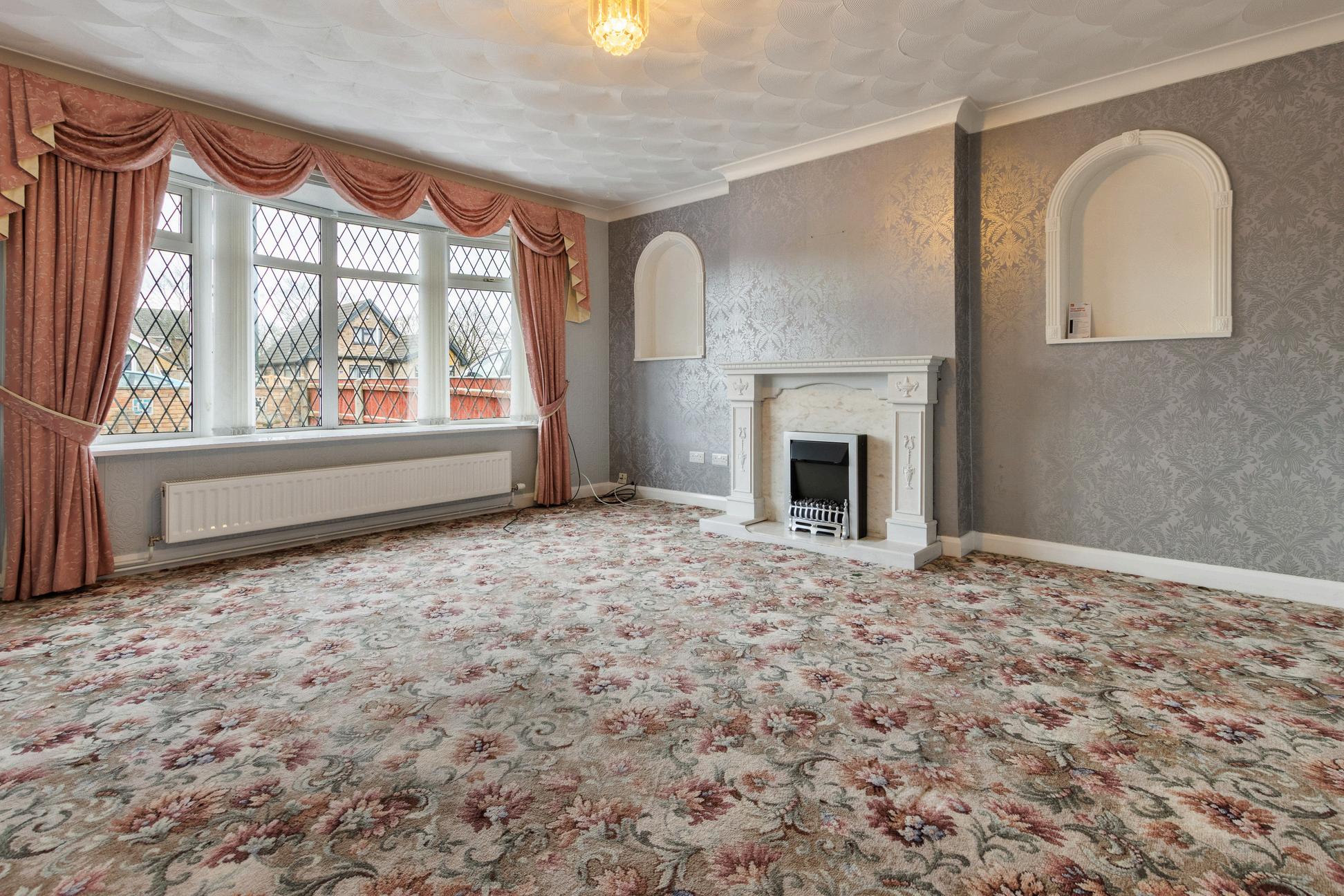 At the heart of the home is the spacious lounge, a bright and inviting room featuring a large bay window that floods the space with natural light, complemented by a feature fireplace for a cosy focal point.