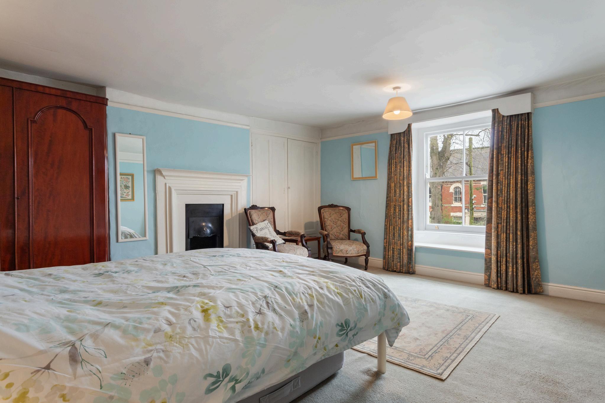 From a half landing, a further double bedroom and second bathroom are accessed separately, offering a natural arrangement for a principal bedroom with adjacent bathroom. To the rear, the fifth bedroom connects to the former servants’ staircase, giving it a quieter, more independent feel – ideal for use as a study, nursery or hobby room.