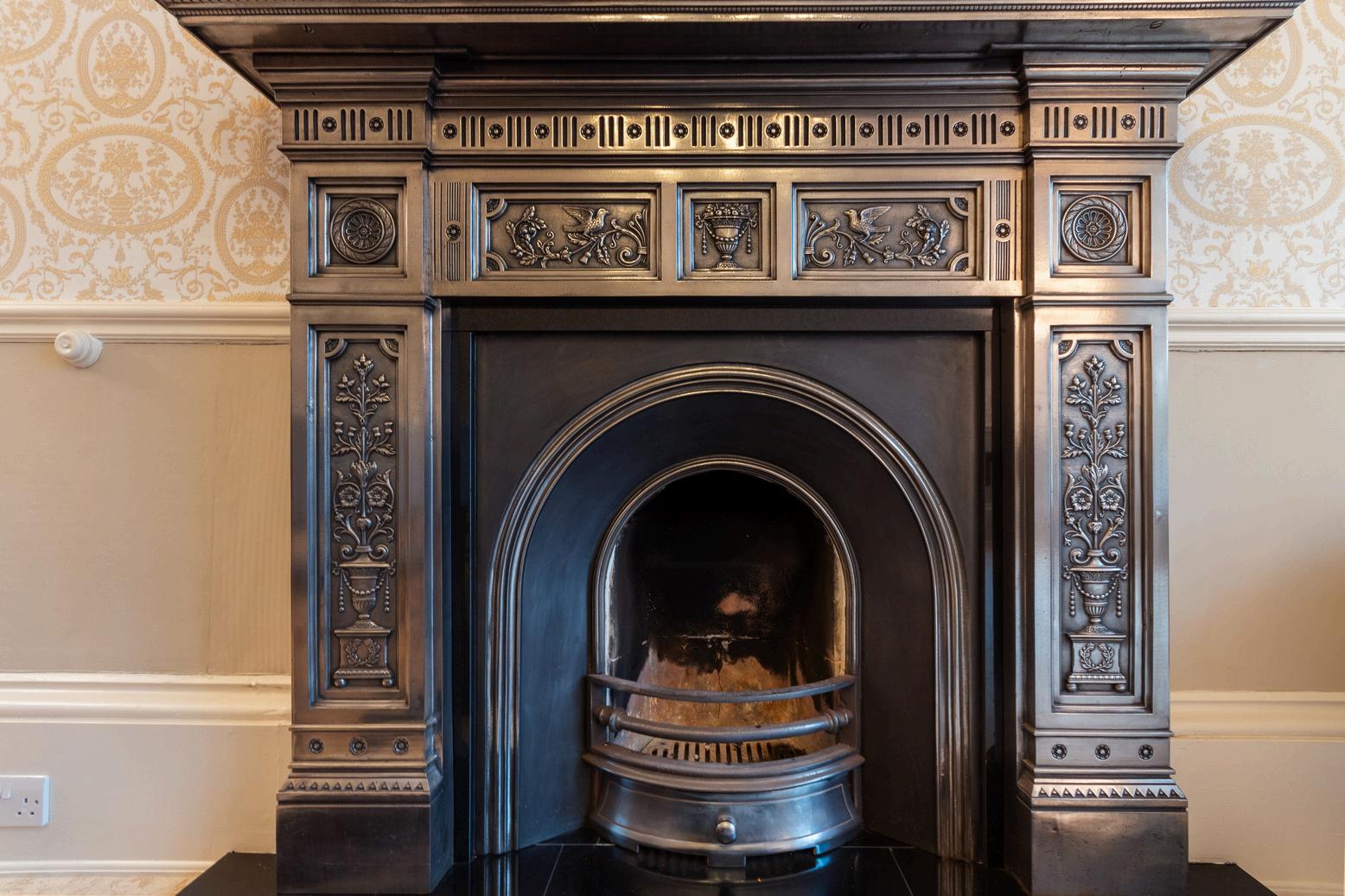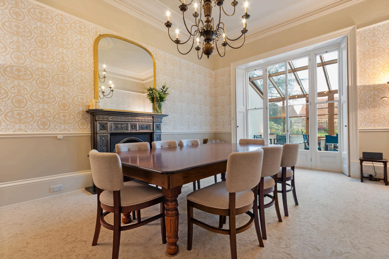 To the rear, a remarkable Victorian dining room, tall and gracious, provides the perfect setting for family celebrations. A beautiful traditional cast iron fireplace, in keeping with the period of the property, adds warmth and elegance to the space. Full-height doors open into a conservatory that has been painstakingly rebuilt by the current owners to match the original period design, creating a seamless connection with the garden and a tranquil space in which to enjoy the changing seasons.