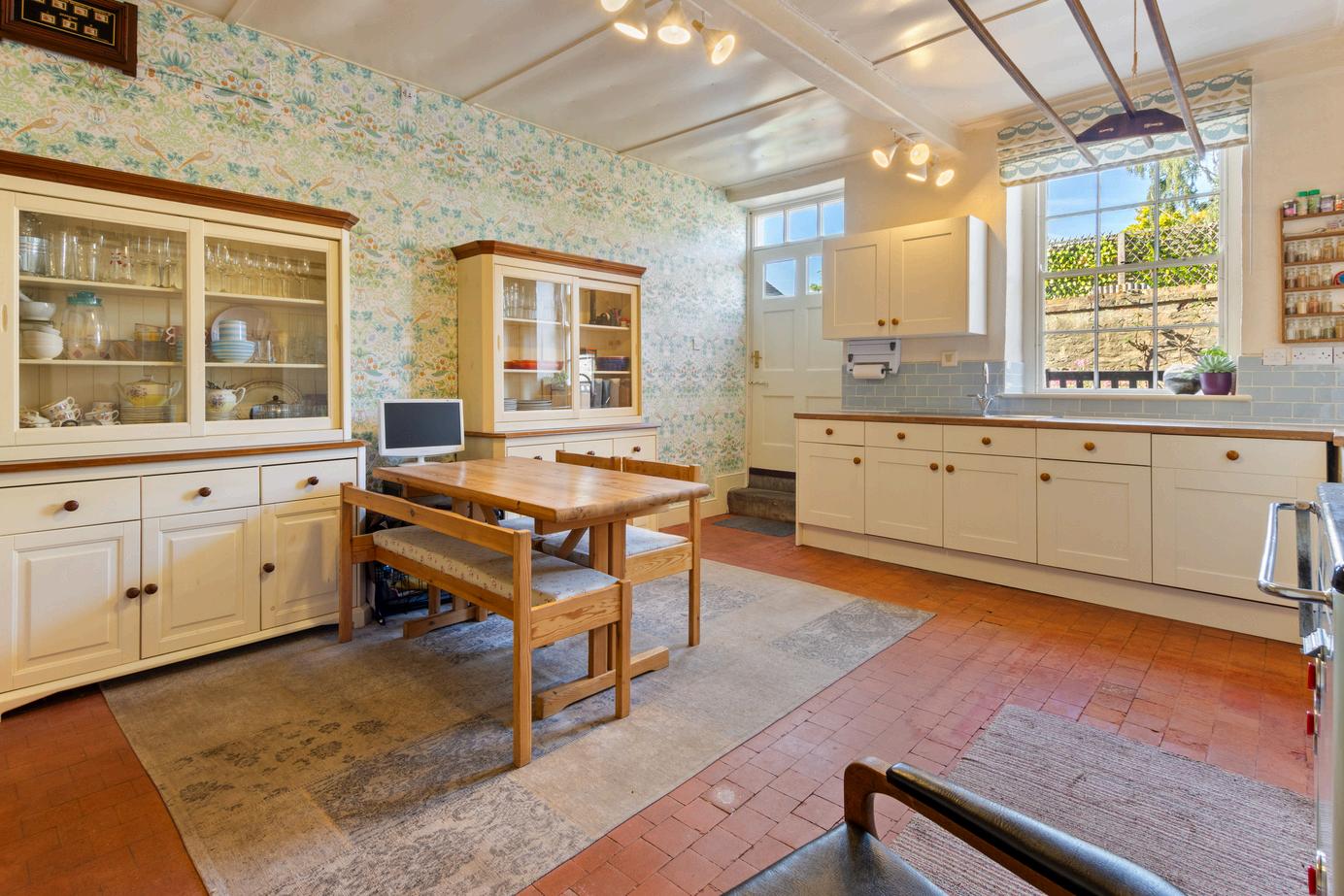 The kitchen area continues the narrative of the house’s layered past. Divided into two functional spaces with an adjoining pantry, it retains many original features including an 18th century fireplace, original servant bells, meat hooks, and a traditional London sink. A classic Esse range adds warmth and character, making this space as functional as it is atmospheric. From here, a door gives access to the former servants’ staircase, connecting the kitchen discreetly with the upper floors and underlining the home’s historic structure and layout.