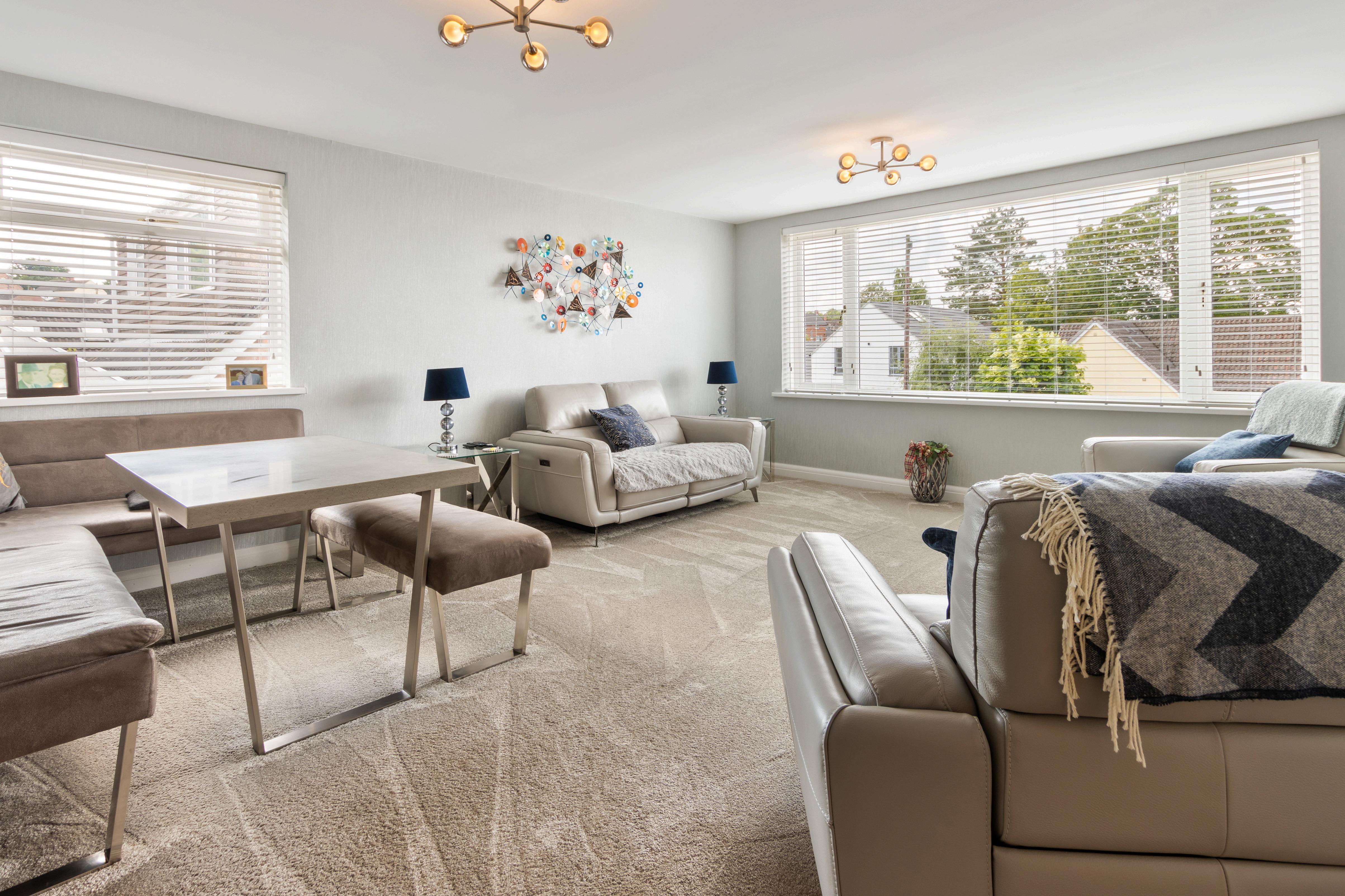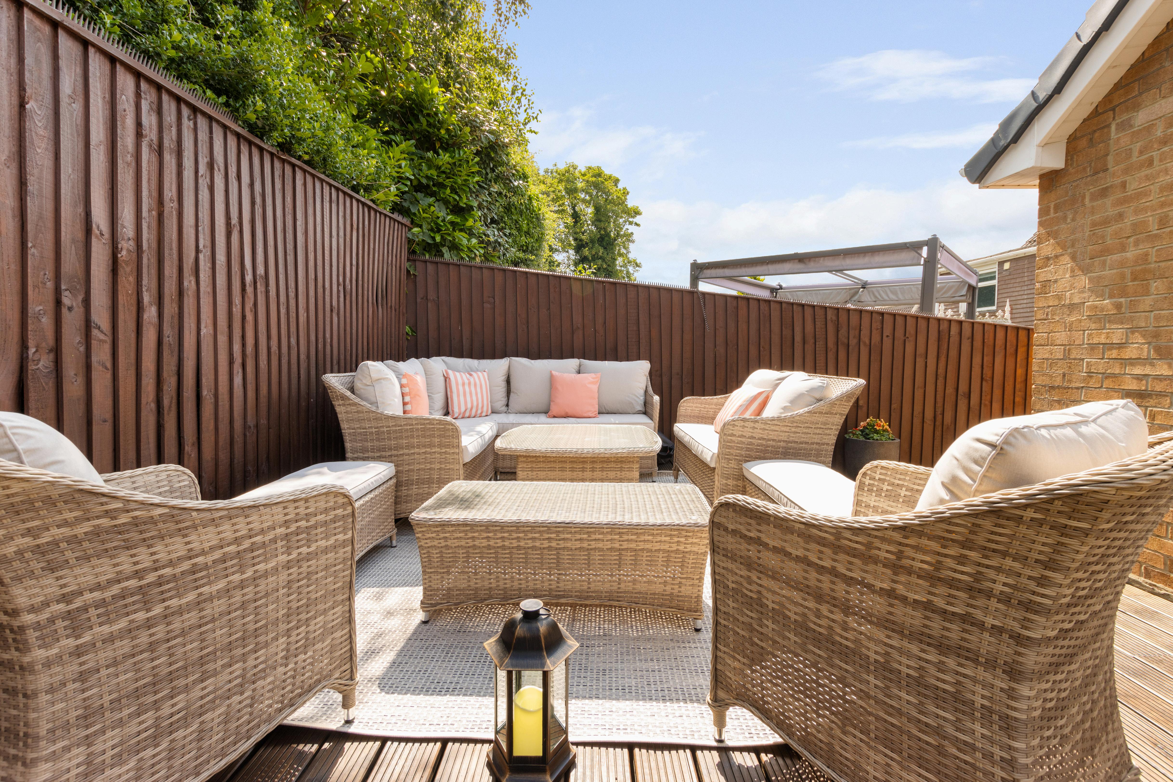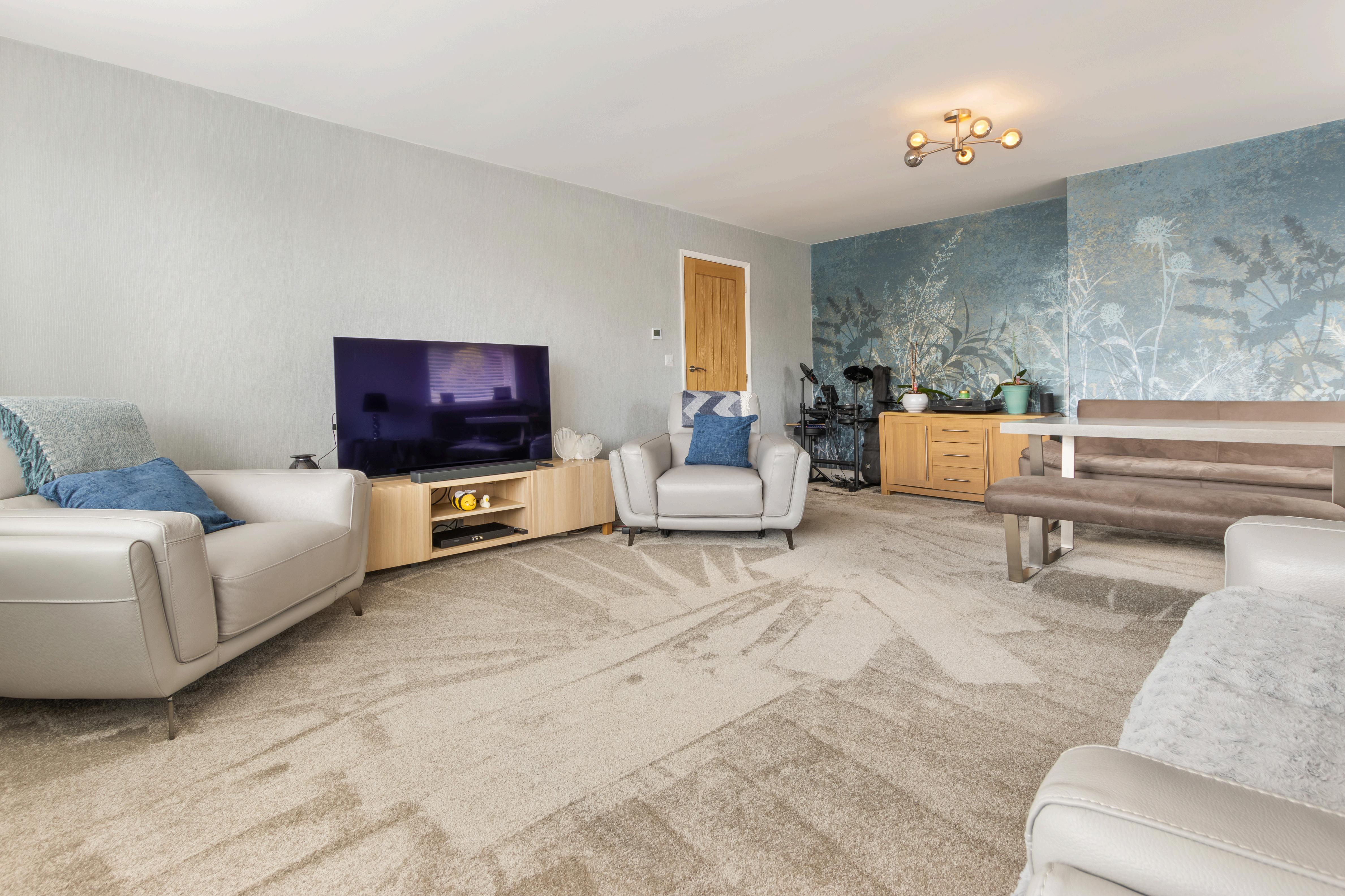 Step into a spacious entrance hallway that leads to a generous dual-aspect lounge/diner – a bright and airy space, with a large front-facing picture window that captures open rooftop views and floods the room with natural light. The heart of the home is the stylish, fully fitted kitchen with classic shaker-style cabinetry, complementary quartz worktops, and integrated appliances. French doors open directly onto a decked seating area in the rear garden – the perfect spot for alfresco dining and entertaining. There are three well-proportioned bedrooms, all beautifully presented, and a luxurious family bathroom complete with freestanding bath, walk-in digital shower with glass screen, a vanity sink unit, fitted storage, and a light-up mirror – all set against sleek tiling for a high-end finish.