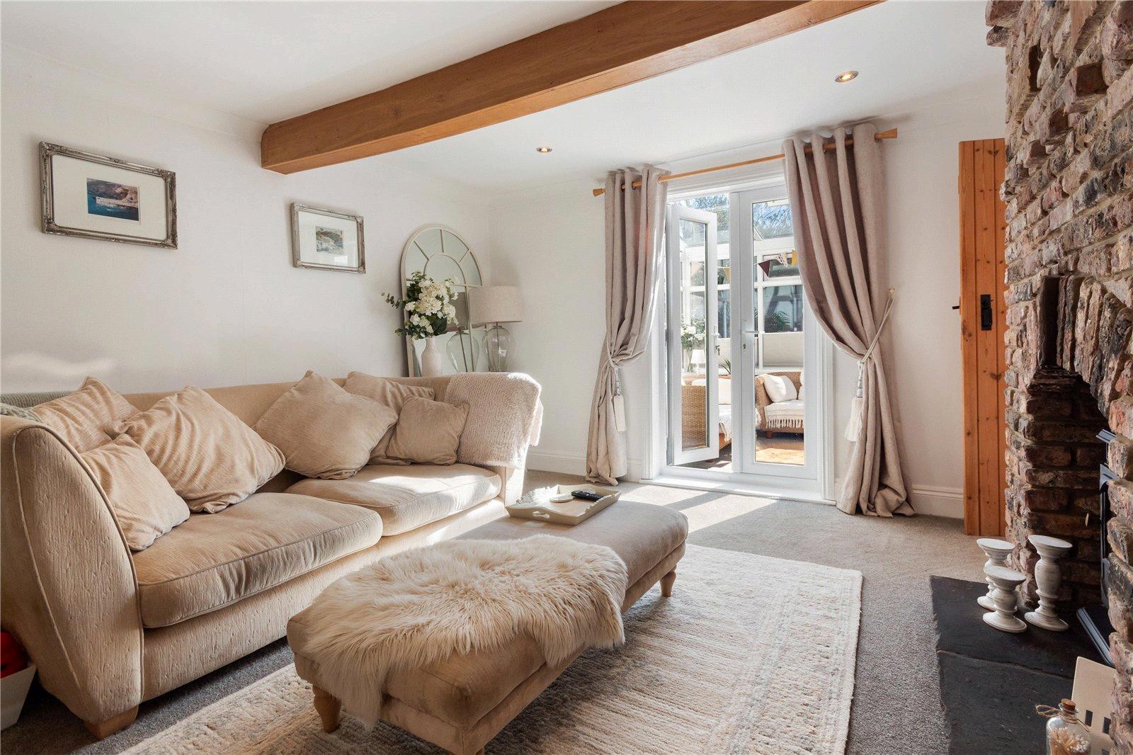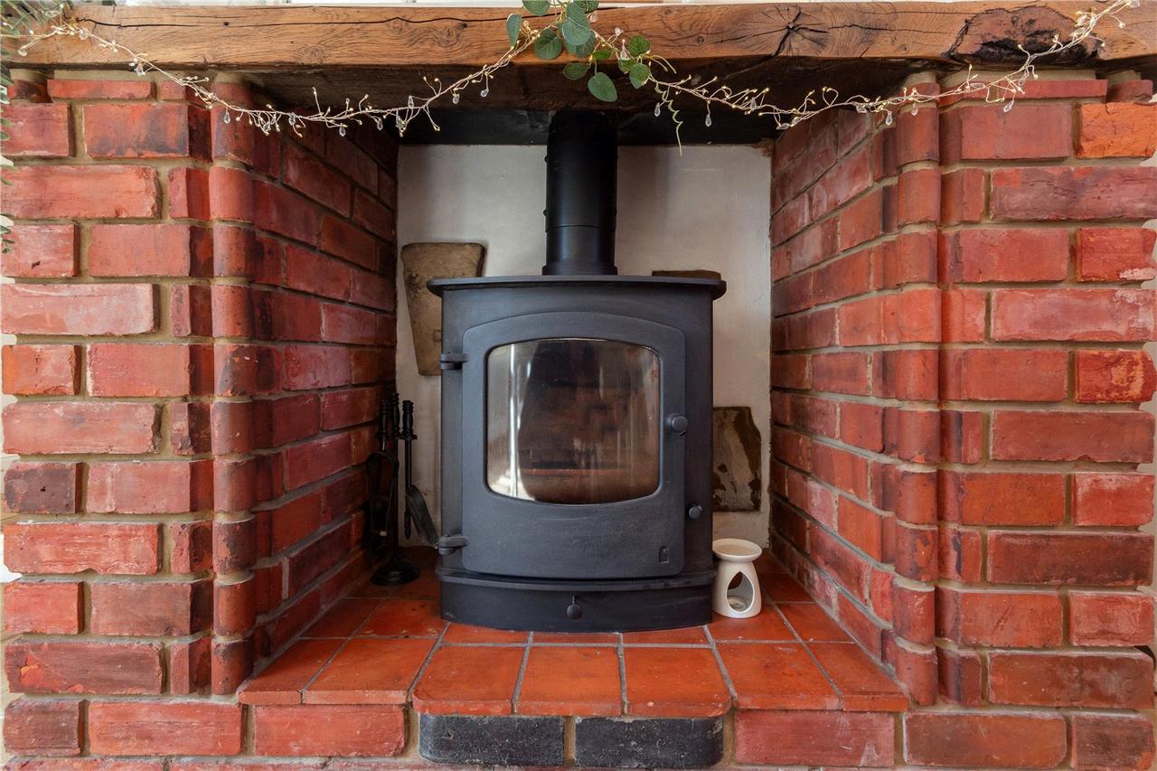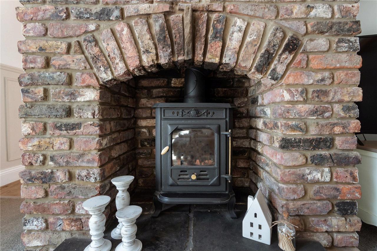 Step through the rear entrance and be welcomed by a modern fitted kitchen boasting sleek, handleless grey cabinets, abundant worktop space, and a generous dining area. The kitchen’s warm, rustic feel is perfectly balanced with contemporary design touches that cater to today’s lifestyle. Elegant tongue and groove doors lead from the kitchen, with one side opening into a sophisticated dining room. Here, a beamed ceiling, exposed brick fireplace with a stove fire, panelled walls, and wood effect tiled flooring creates a striking focal point that flows seamlessly into the adjacent first-floor staircase. Beyond, a comfortable lounge awaits, also featuring a beamed ceiling and an inviting exposed brick fireplace with a stove fire, while French doors open into a light-filled conservatory that overlooks the private rear garden.