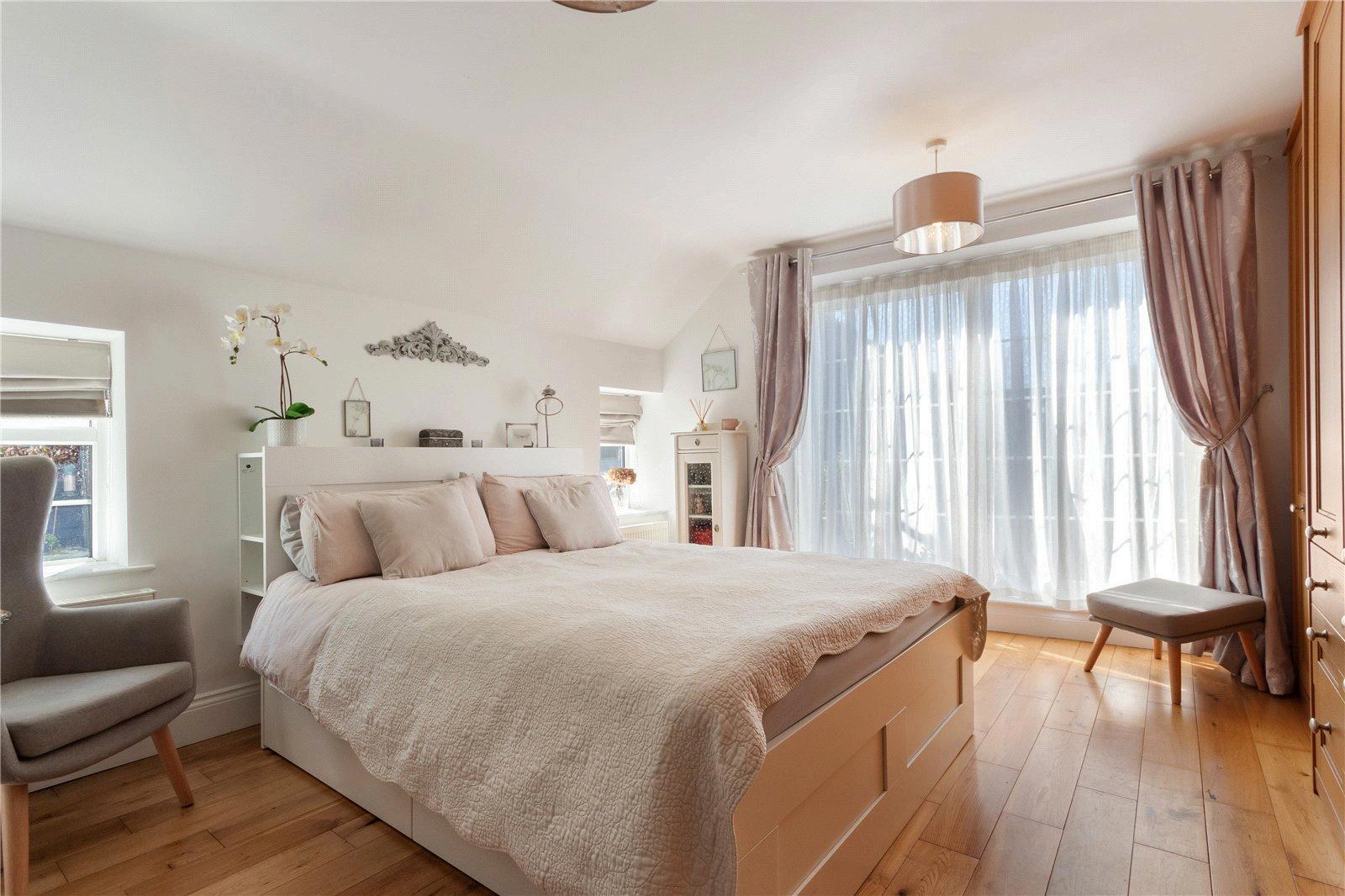 To the left of the kitchen, a practical utility lobby offers access to a stylish shower room and leads directly to the inviting ground floor master bedroom. This spacious dual-aspect retreat features a wooden floor, fitted wooden wardrobes, and patio doors that lead out to a charming side patio and garden. Upstairs, three further well-proportioned bedrooms provide ample space for family or guests, complemented by a modern family bathroom fitted with contemporary fixtures.